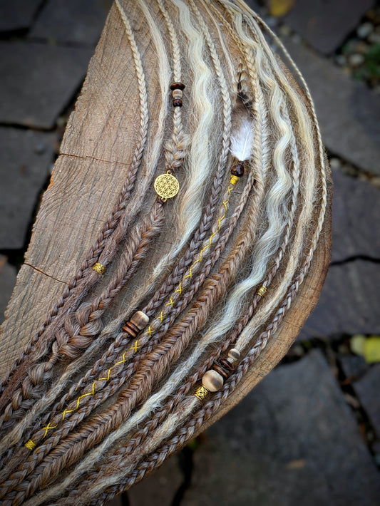 Ozdobné dready vyrobené ze zbytků přízí, ovčí vlny a odstřižků látek. Snadno je připevníte do každého účesu pomocí malé gumičky, která je součástí každého wrapu.