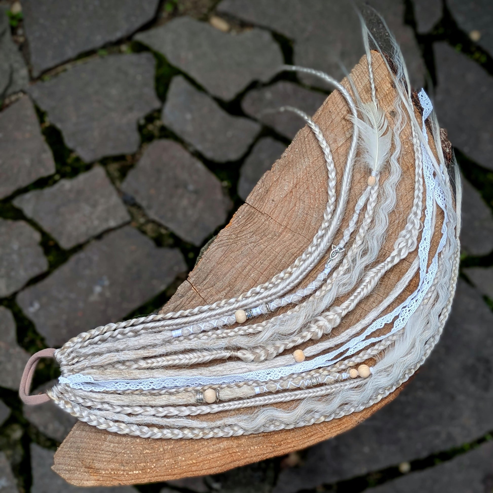 Beige elastic band with a total of 7 braids of different structures and 3 dreadlocks in a combination of pink and lilac. Decorated with metal beads, cotton and feathers.