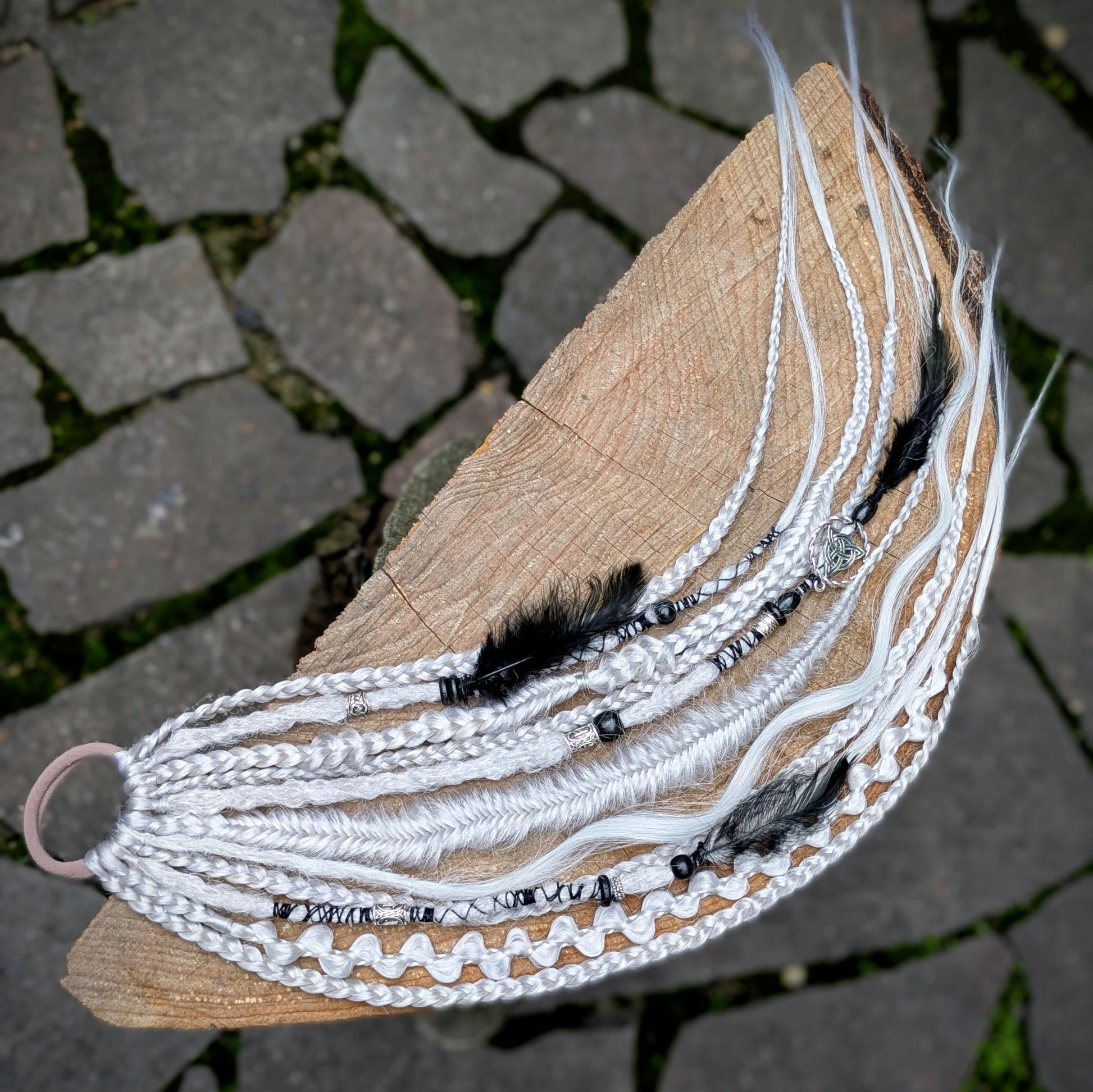 Beige elastic band with a total of 7 braids of different structures and 3 dreadlocks in a combination of pink and lilac. Decorated with metal beads, cotton and feathers.