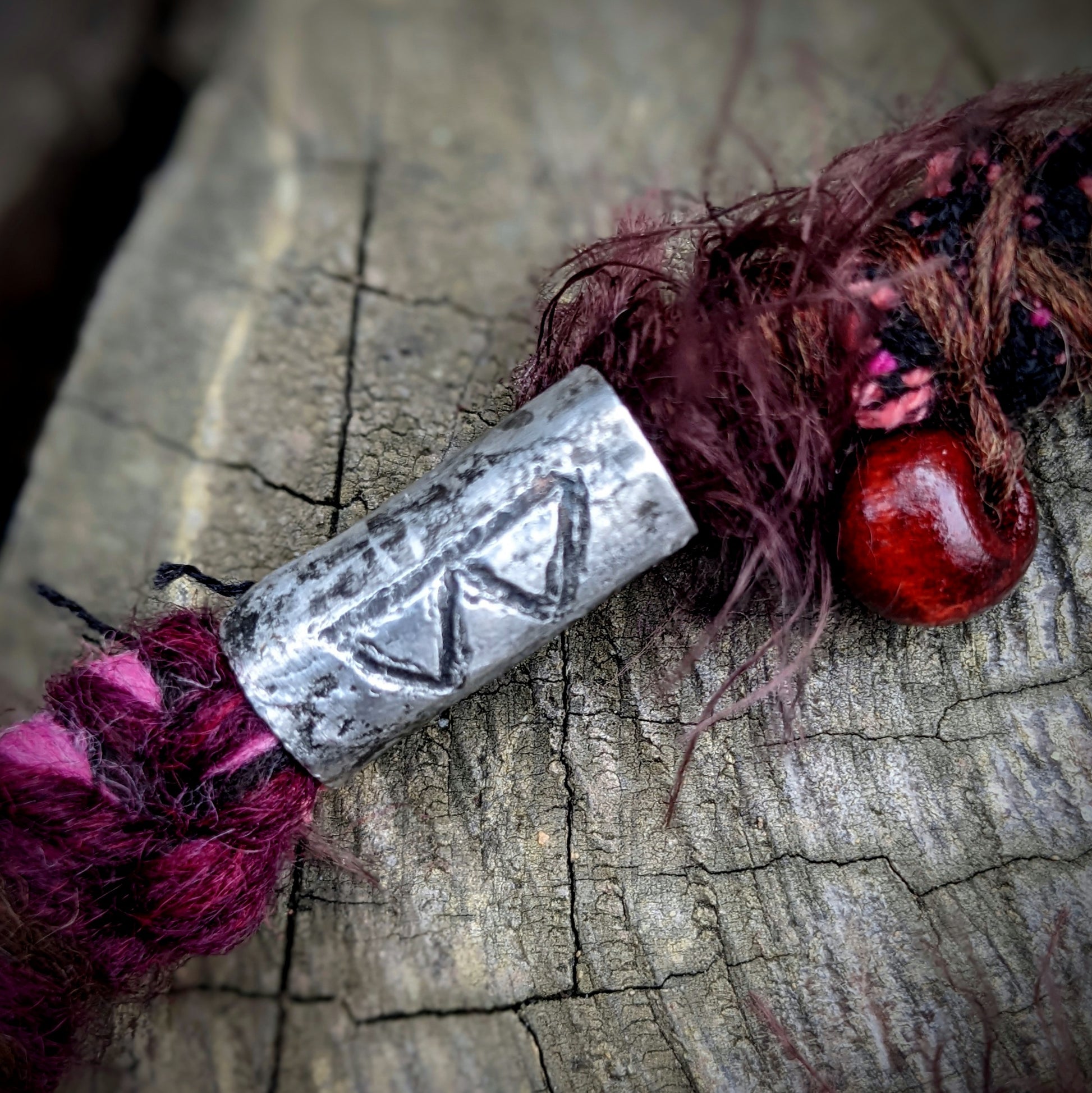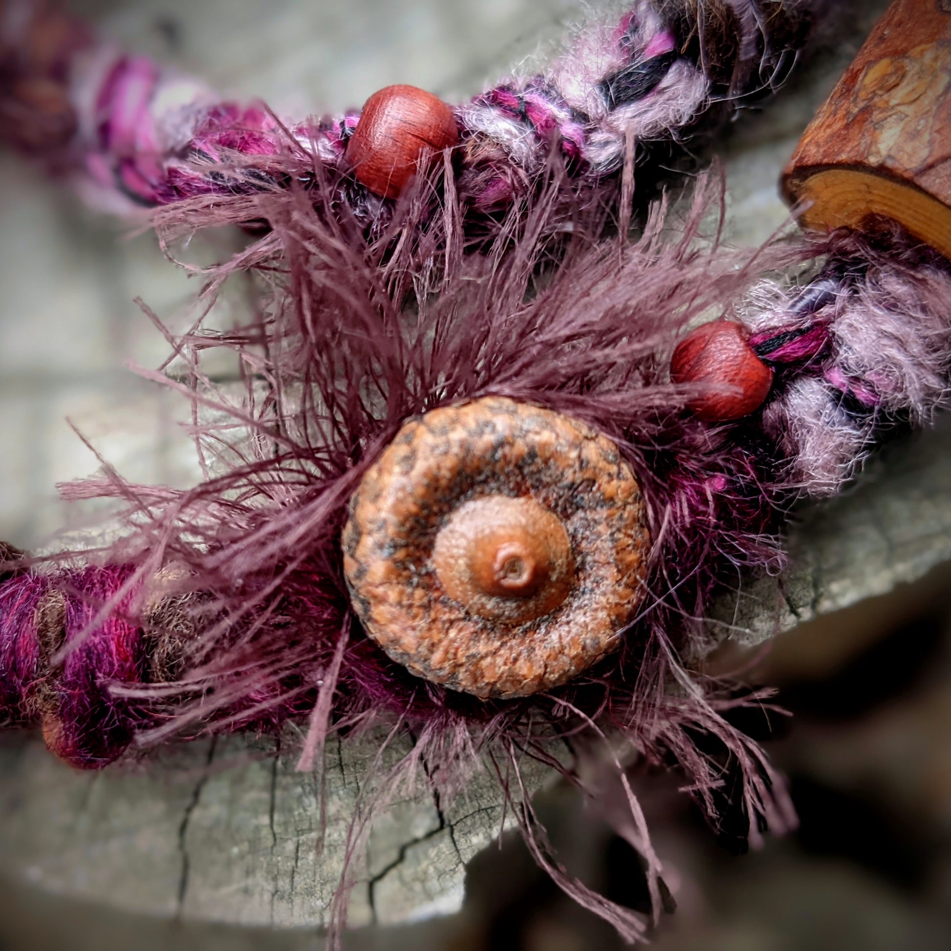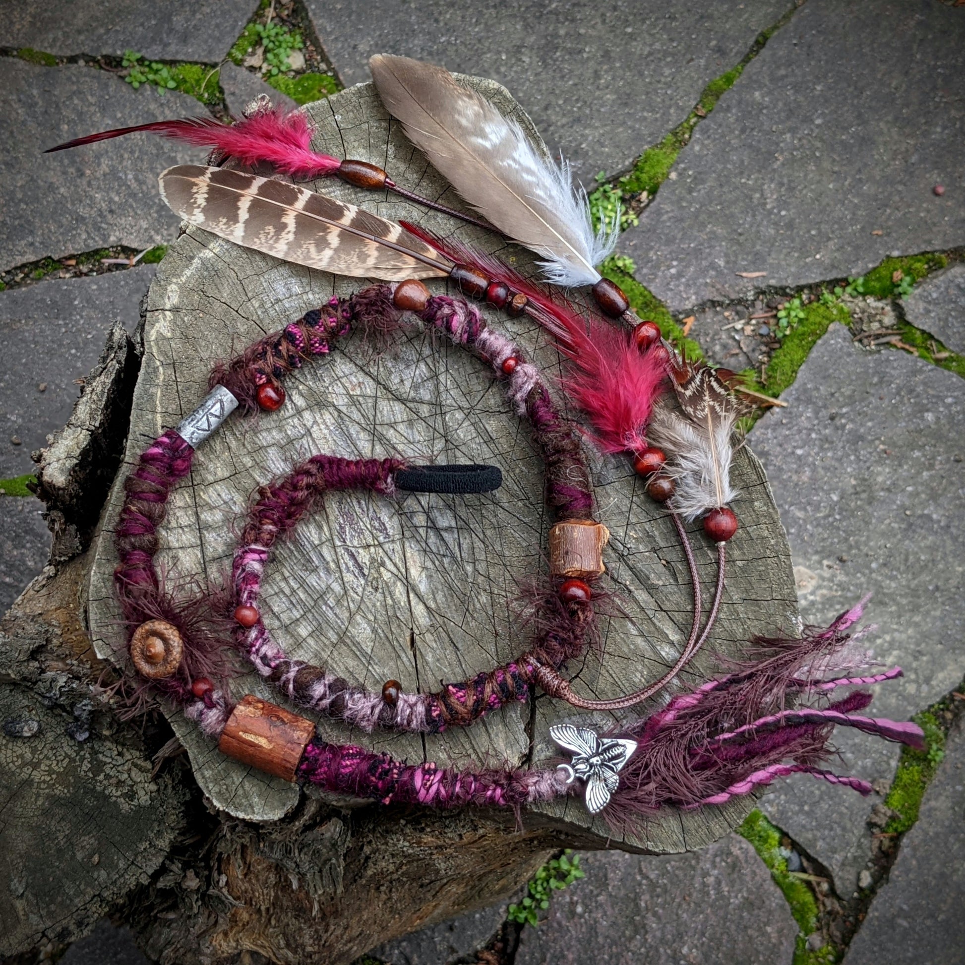 Decorative dreadlock made of yarn and recycled fabrics. Decorated with wooden beads, a bauble, a tinned bead, a moth pendant, an acorn, and a feather pendant that can be removed from the dreadlock and used separately as a feather hair ornament/dreadlocks.