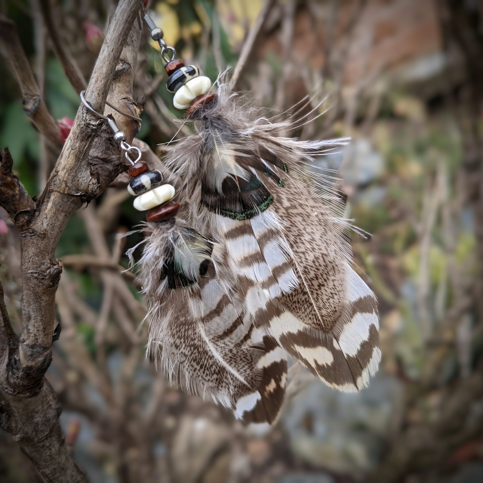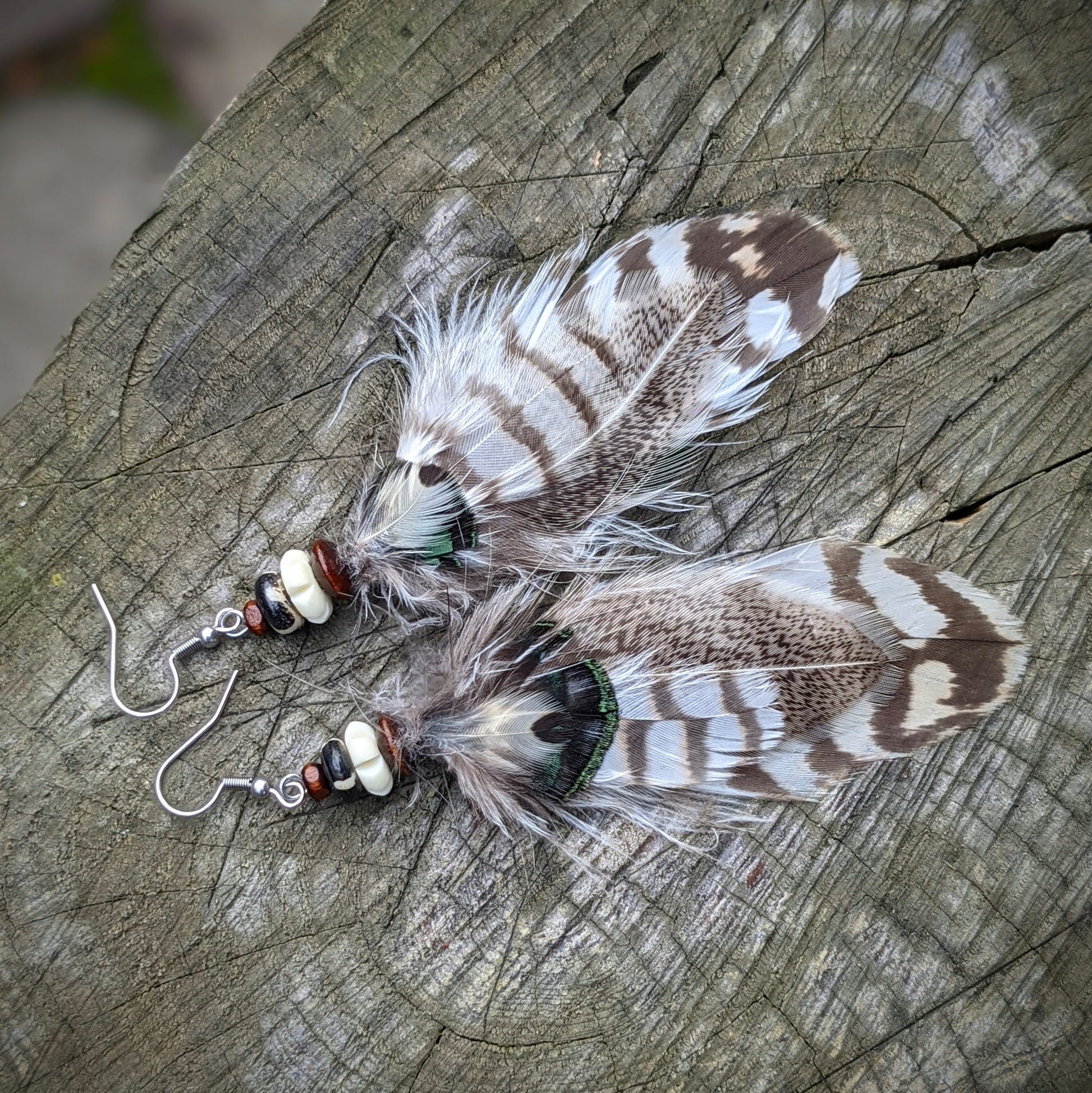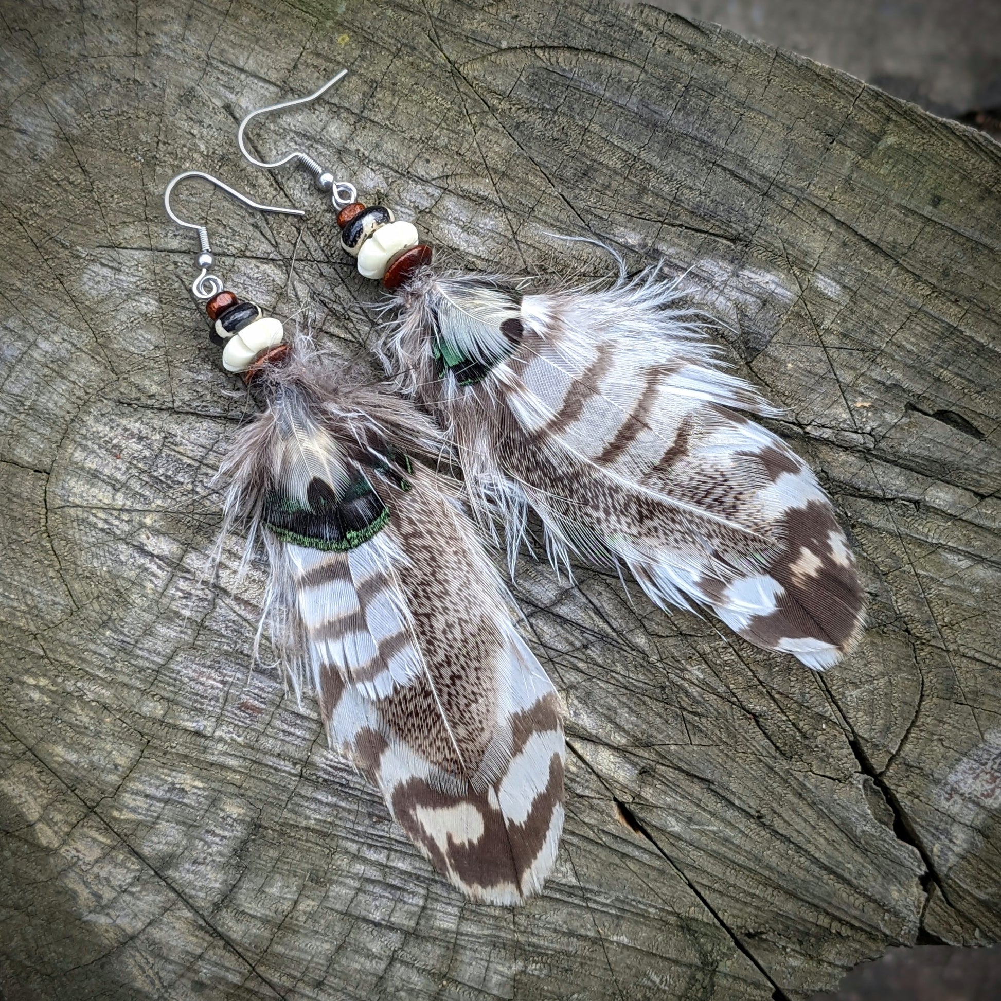 Light feather earrings complemented by wooden and bone beads . The hooks are made of surgical steel, they come with silicone stoppers. The length of the decorative part of the earrings is approximately 11 cm.
