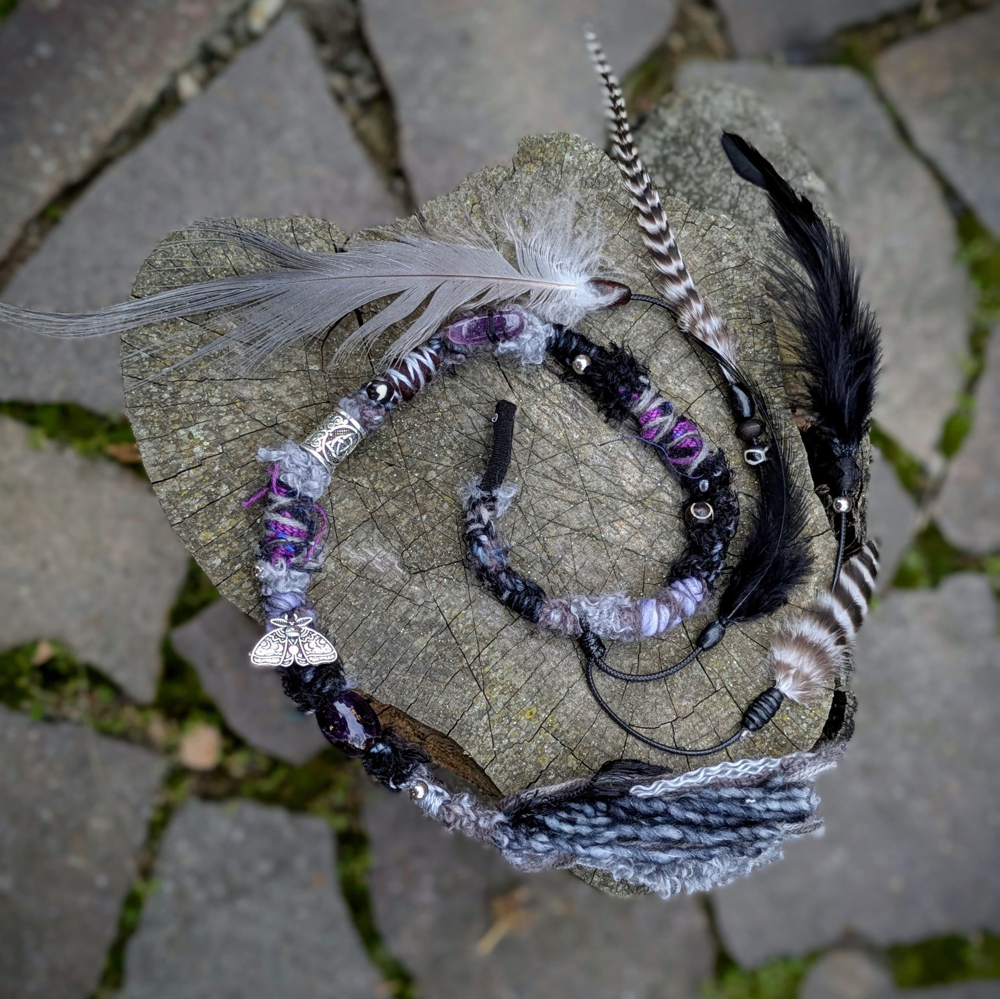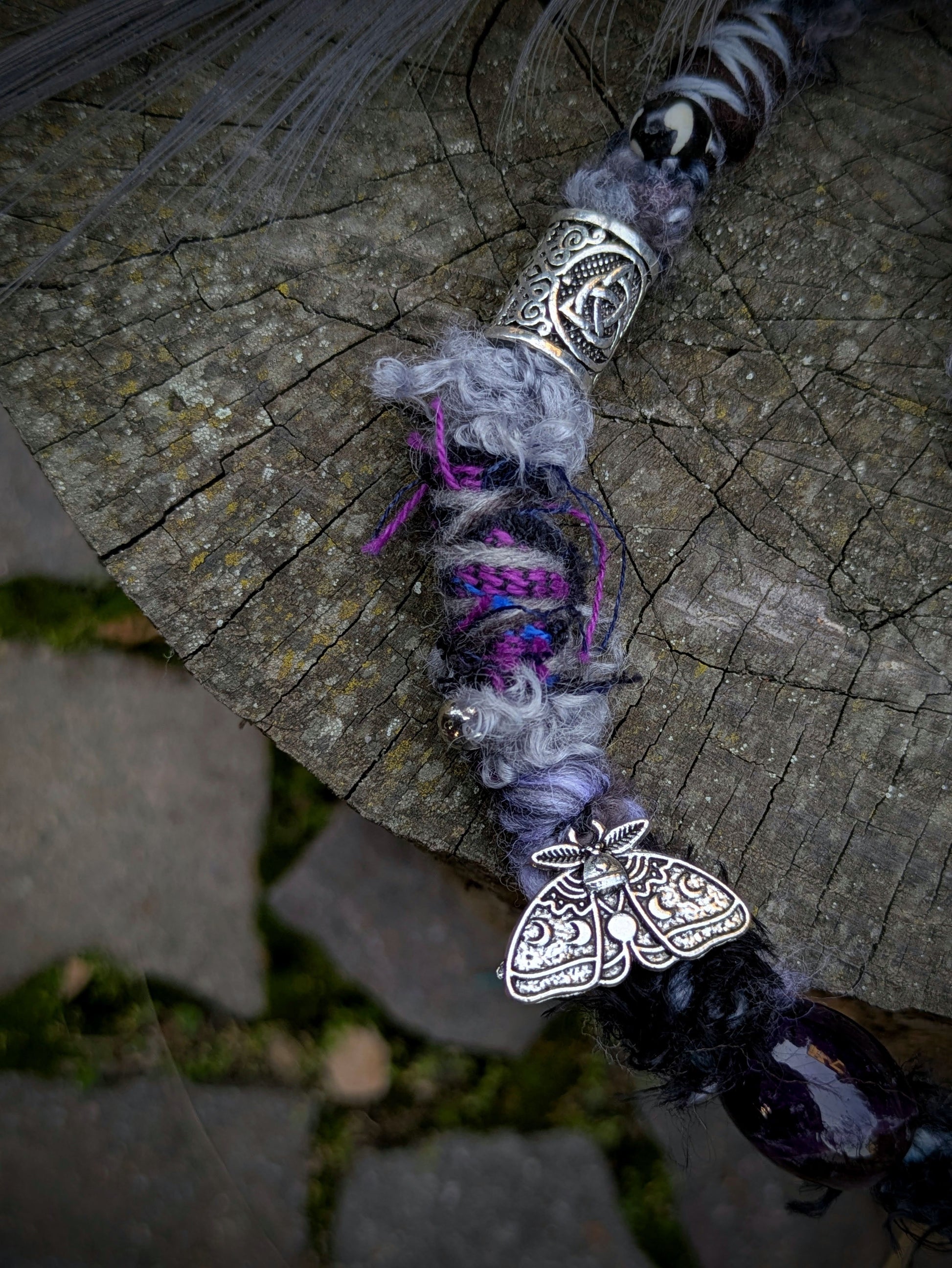 Decorative dread made of yarn and recycled materials. Decorated with ceramic beads, an eye, wooden beads, a crystal and a feather pendant that can be removed from the dread and used separately as a feather decoration for hair/dreads.