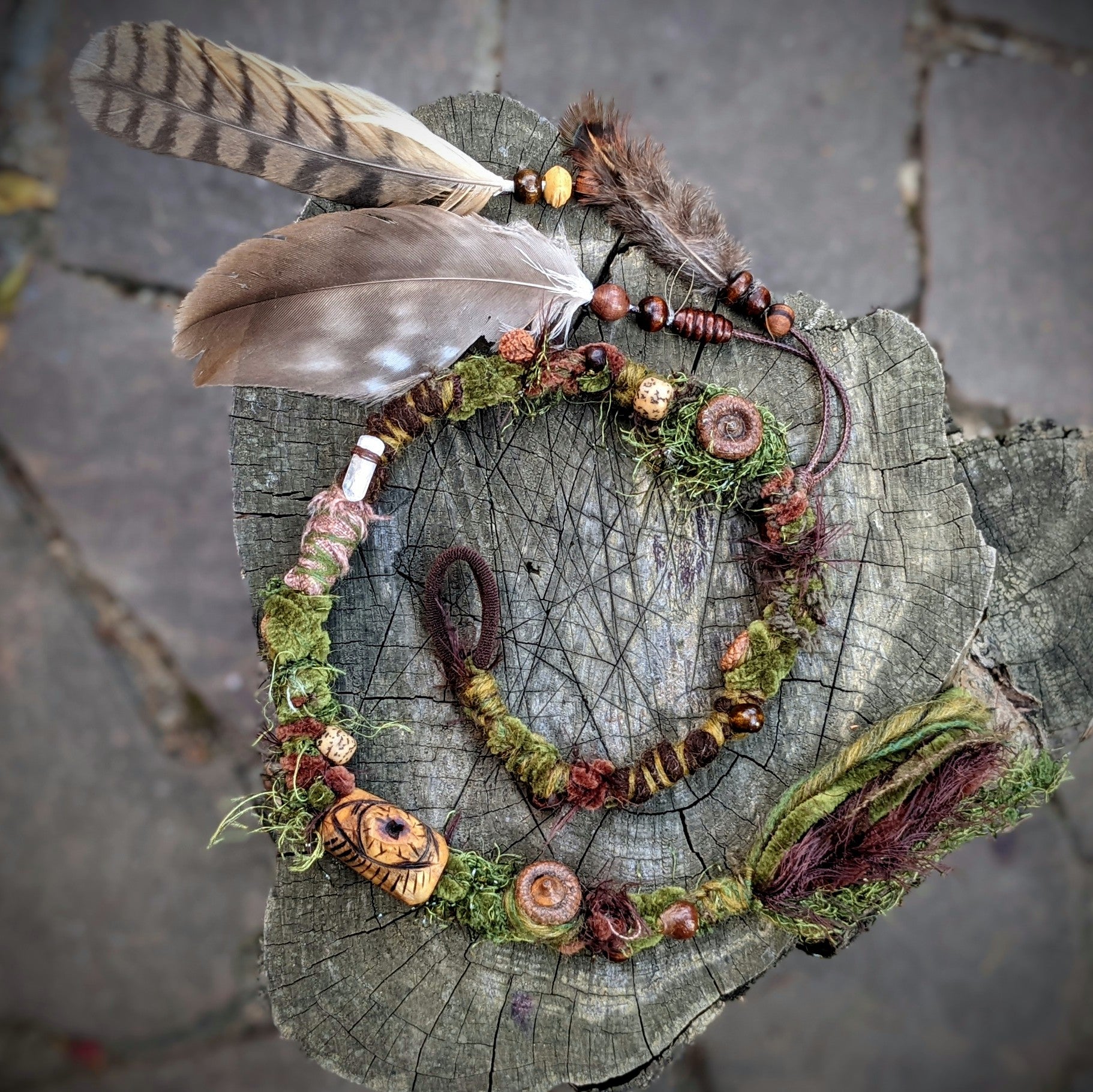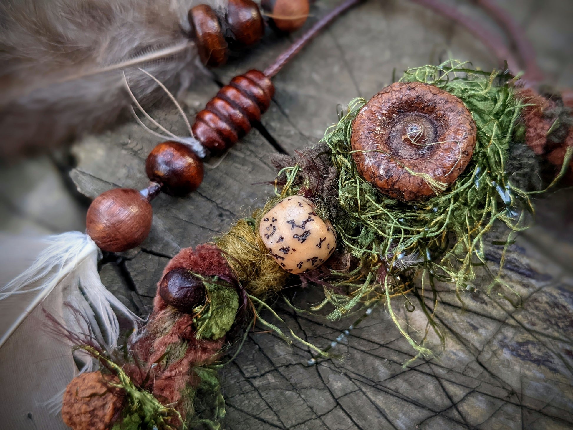 Decorative dread made of yarn and recycled materials. Decorated with ceramic beads, an eye, wooden beads, a crystal and a feather pendant that can be removed from the dread and used separately as a feather decoration for hair/dreads.