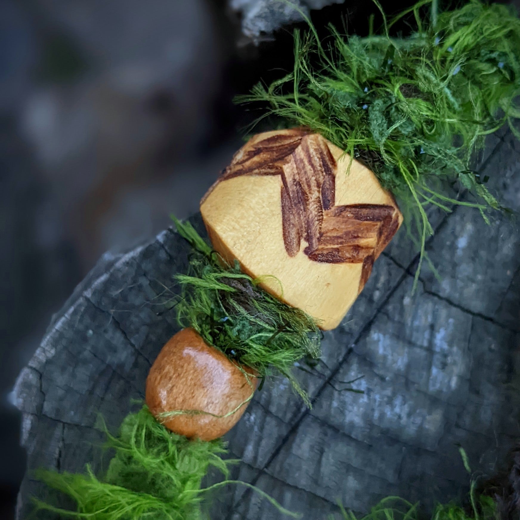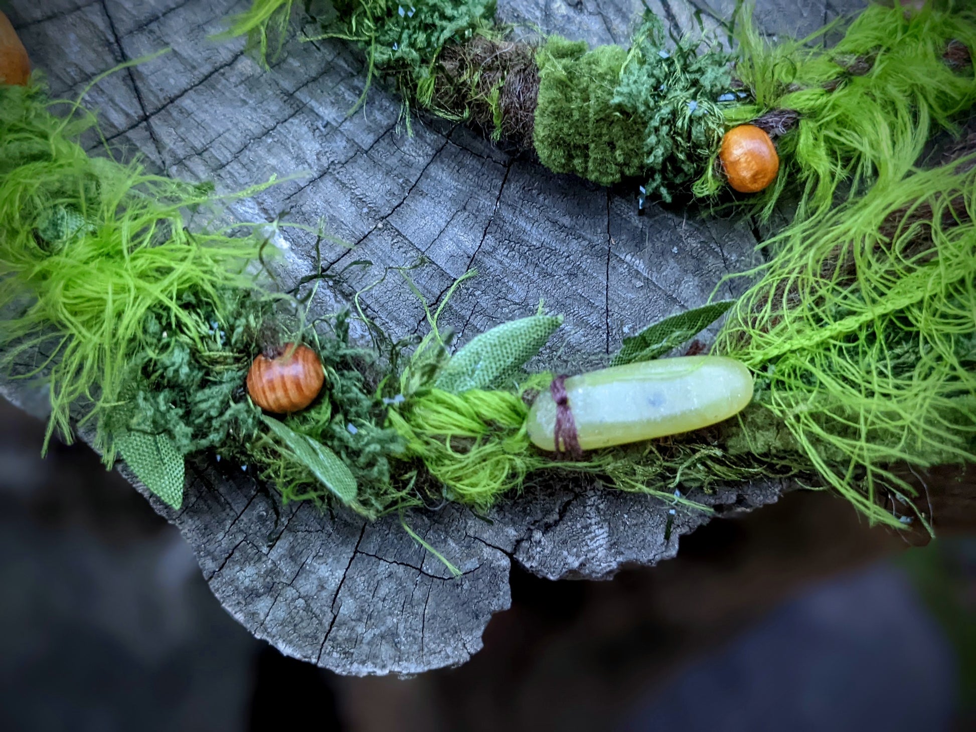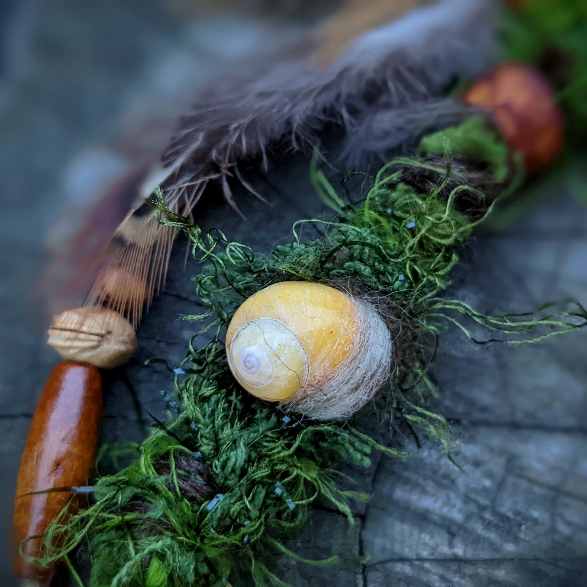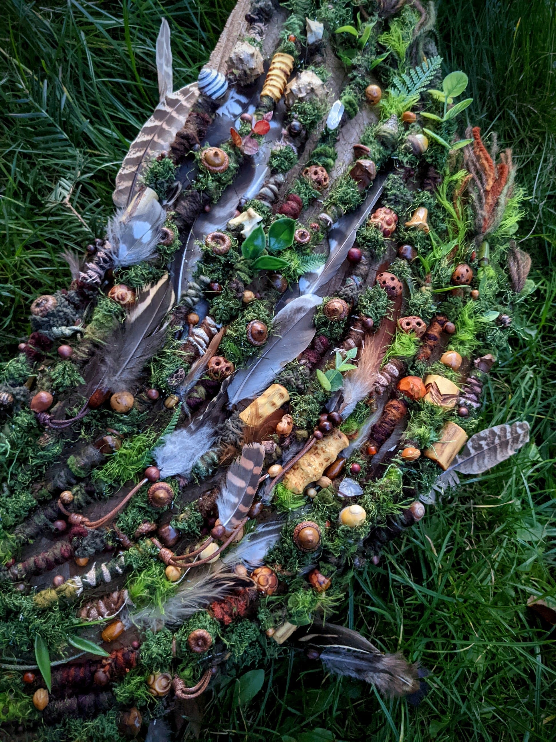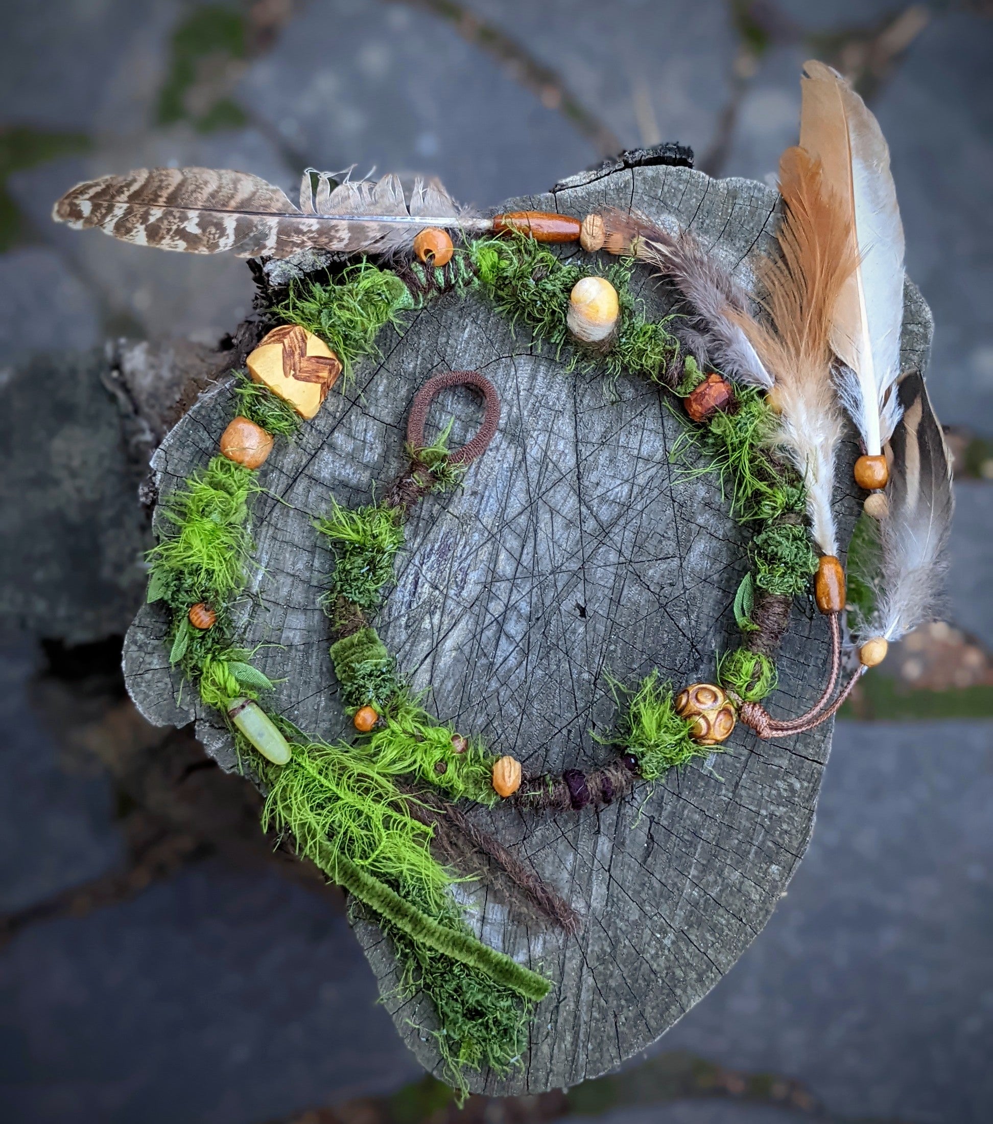 Decorative dread made of yarn and recycled materials. Decorated with ceramic beads, an eye, wooden beads, a crystal and a feather pendant that can be removed from the dread and used separately as a feather decoration for hair/dreads.