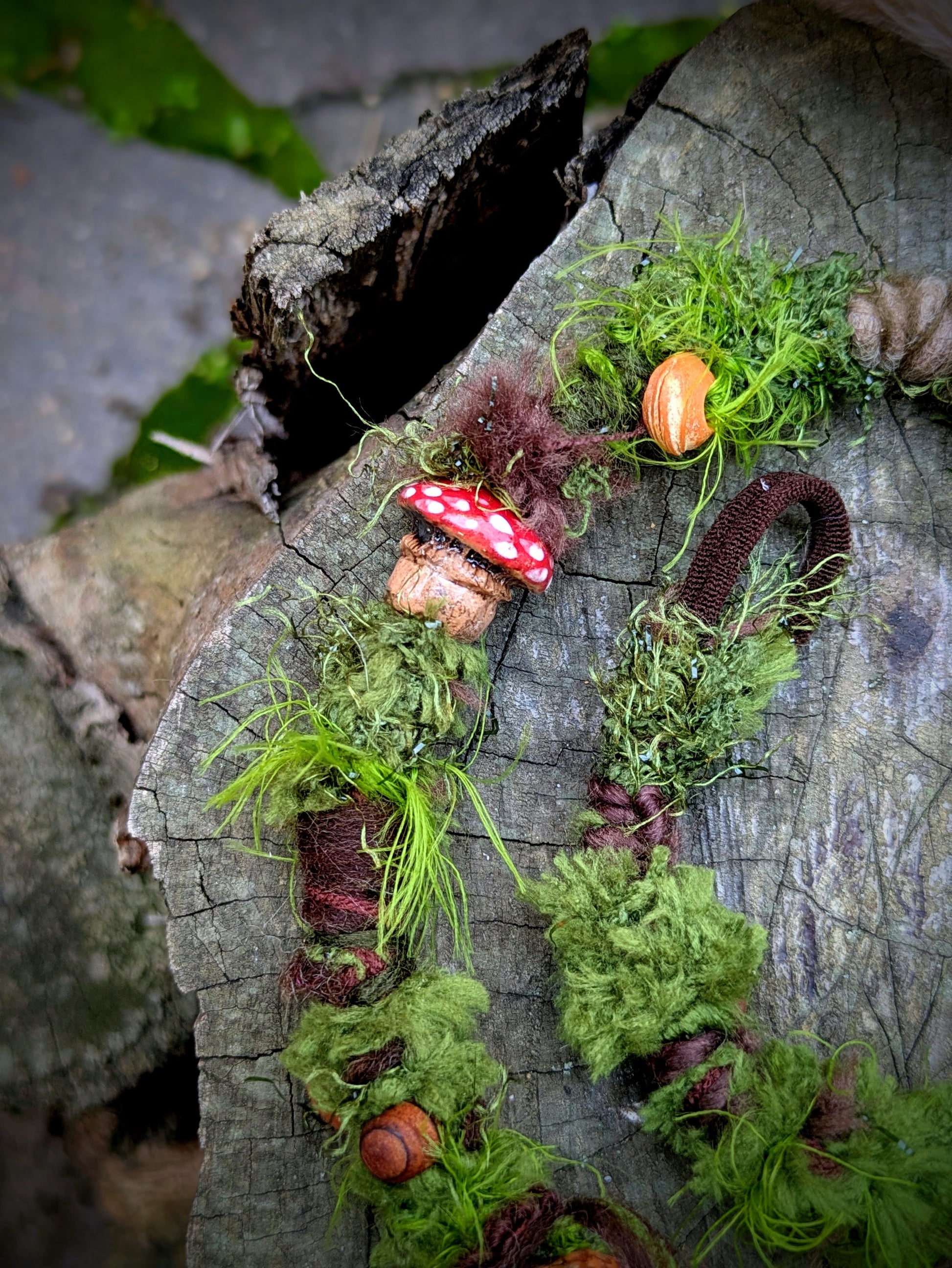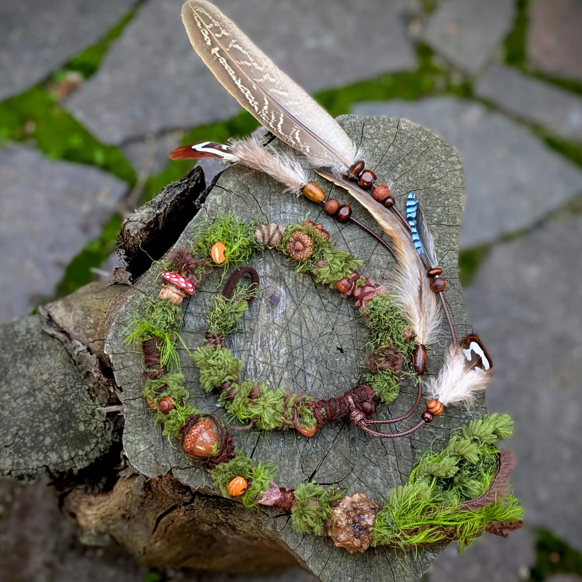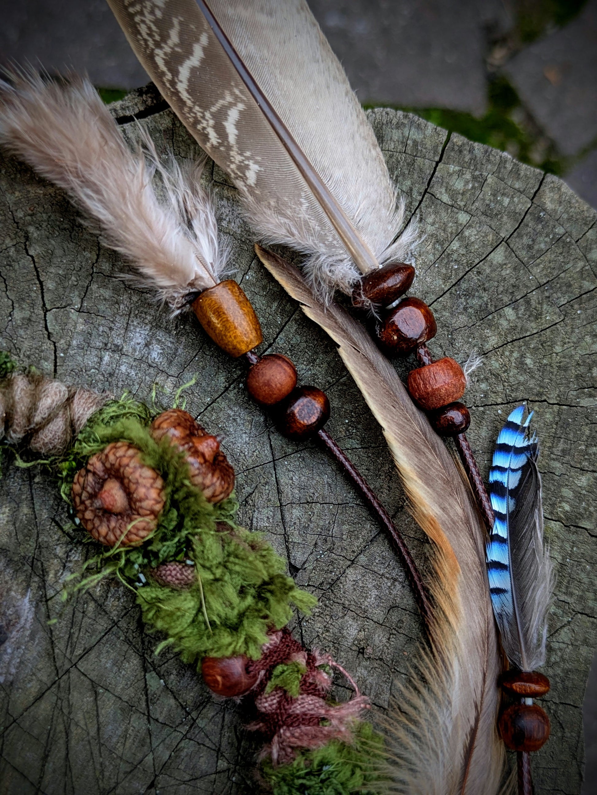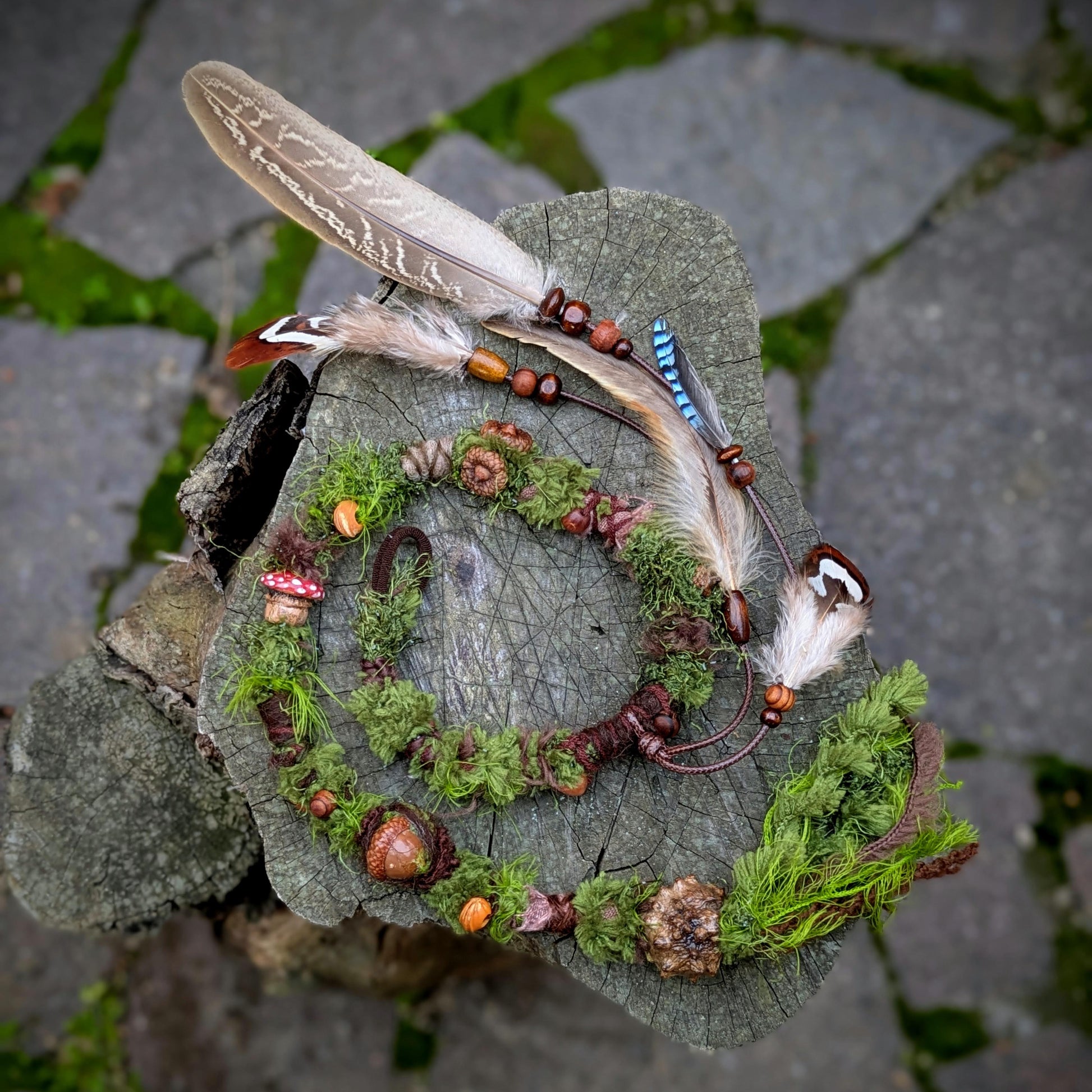 Decorative dread made of yarn and recycled materials. Decorated with ceramic beads, an eye, wooden beads, a crystal and a feather pendant that can be removed from the dread and used separately as a feather decoration for hair/dreads.