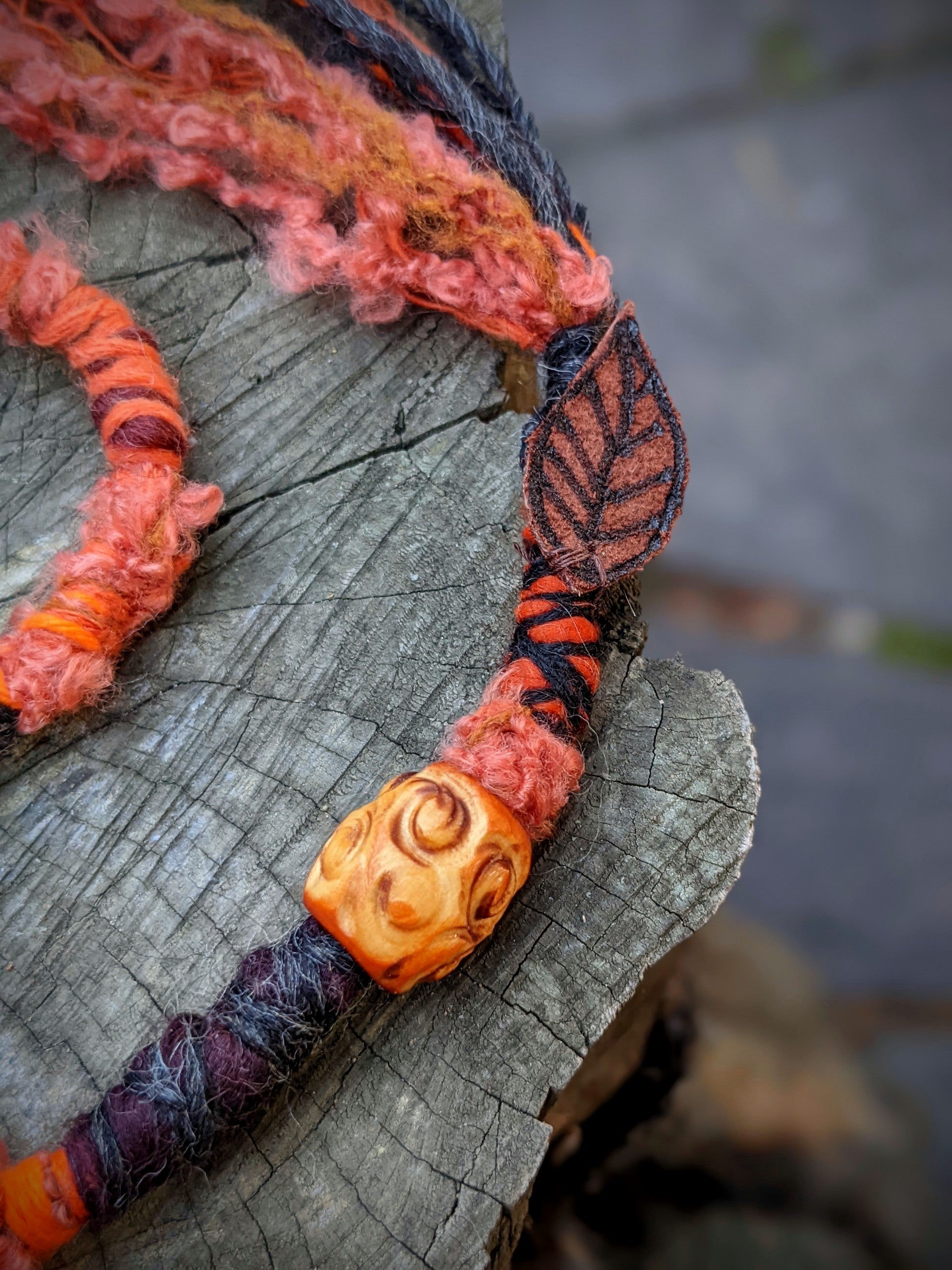 Decorative dread made of yarn and recycled materials. Decorated with ceramic beads, an eye, wooden beads, a crystal and a feather pendant that can be removed from the dread and used separately as a feather decoration for hair/dreads.