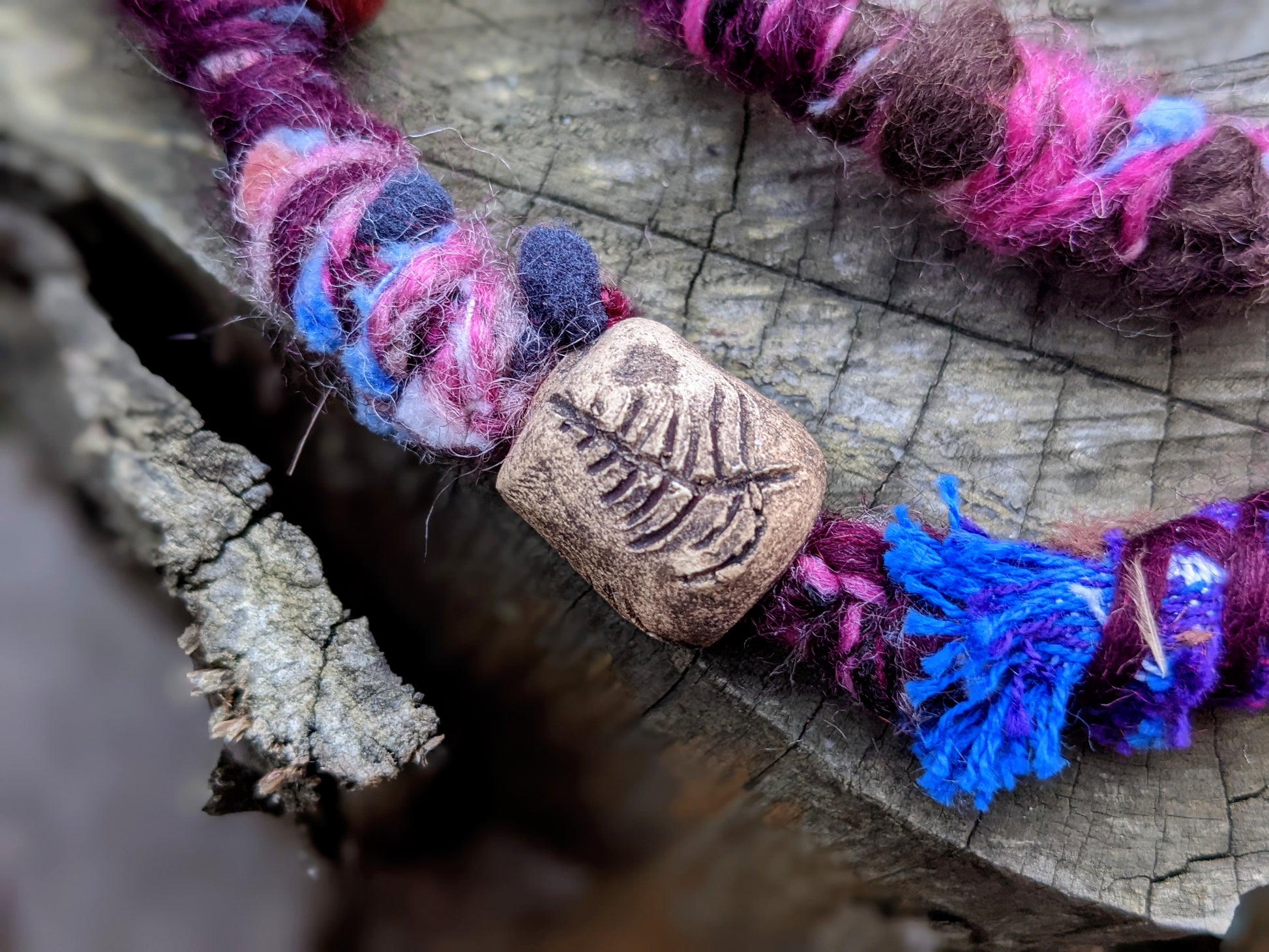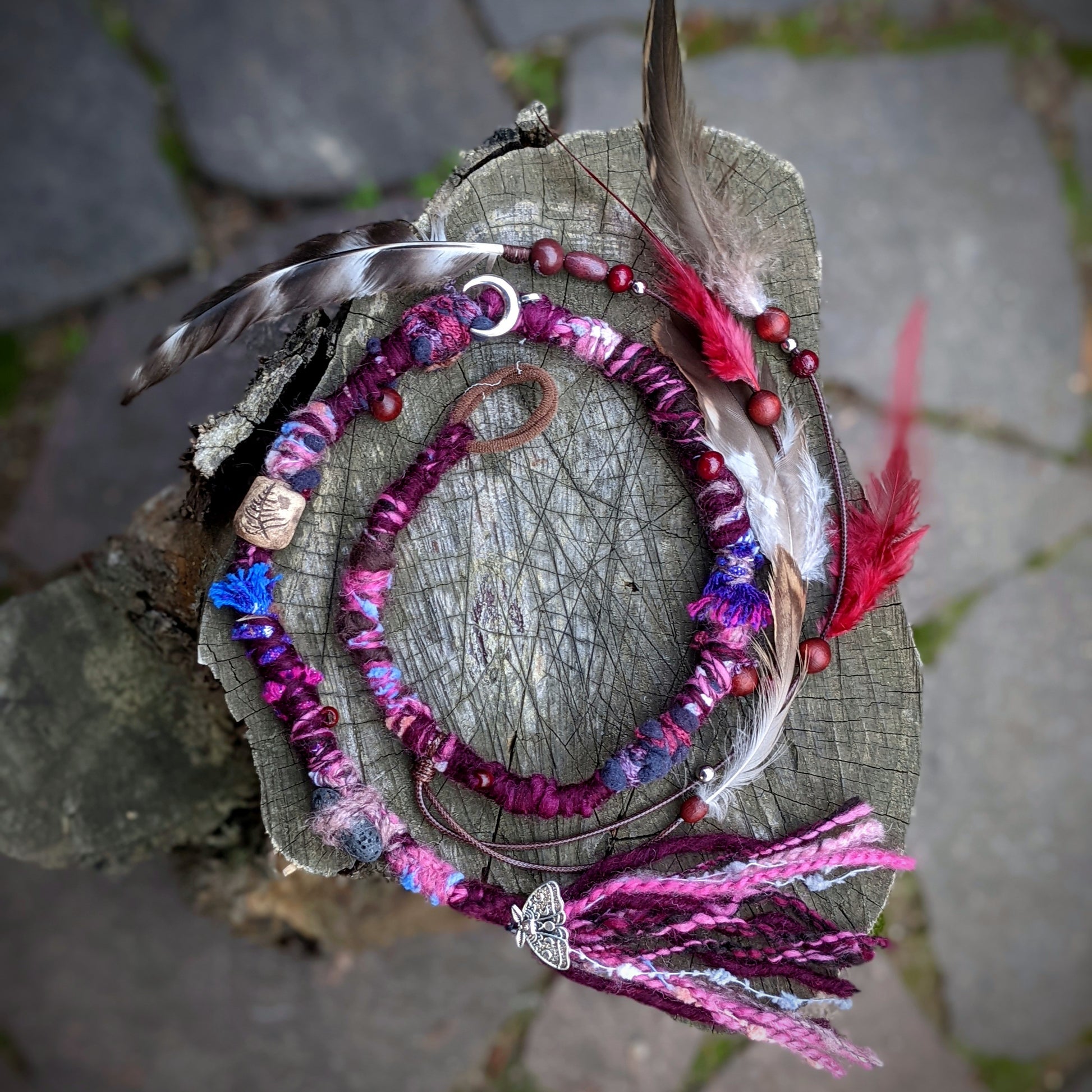 Decorative dreadlock made of yarn and recycled fabrics. Decorated with wooden and ceramic beads, a moth, a moon, a lava rock and a feather pendant that can be removed from the dreadlock and used separately as a feather hair ornament/dreadlocks.
