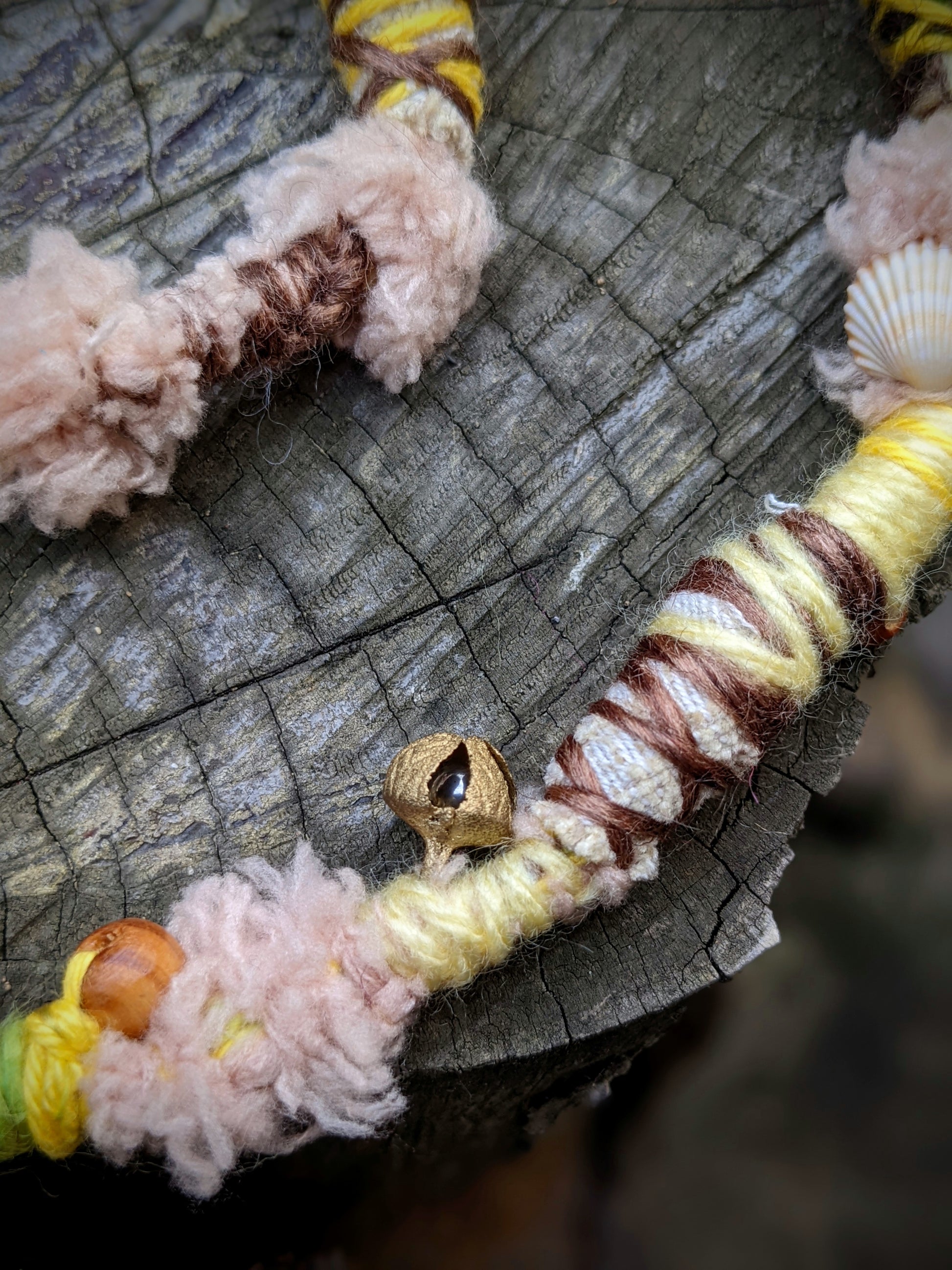 Decorative dreadlock made of yarn and recycled fabrics. Decorated with wooden beads, a bell (it rings!), a shell and a feather pendant that can be removed from the dreadlock and used separately as a feather hair ornament/dreadlocks.