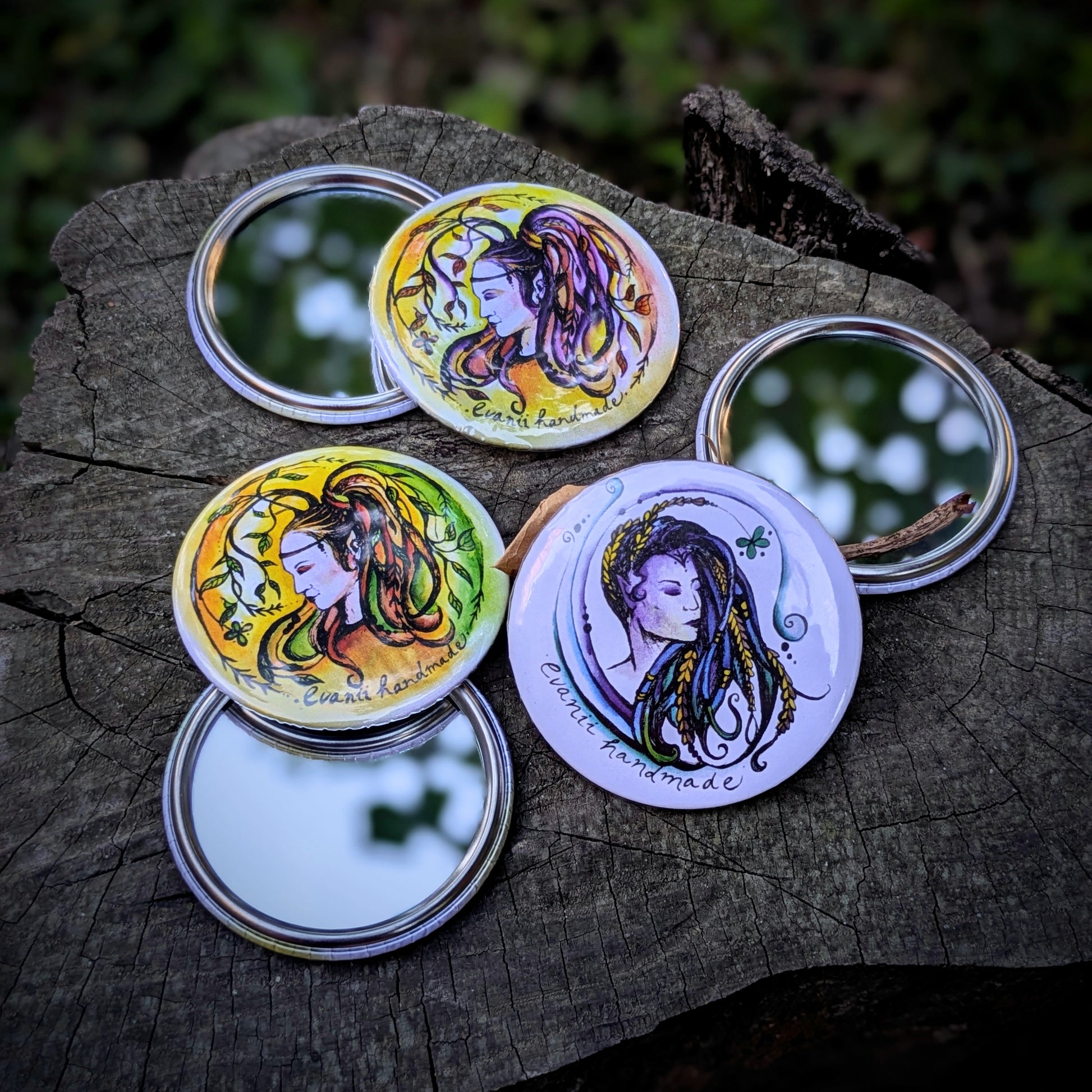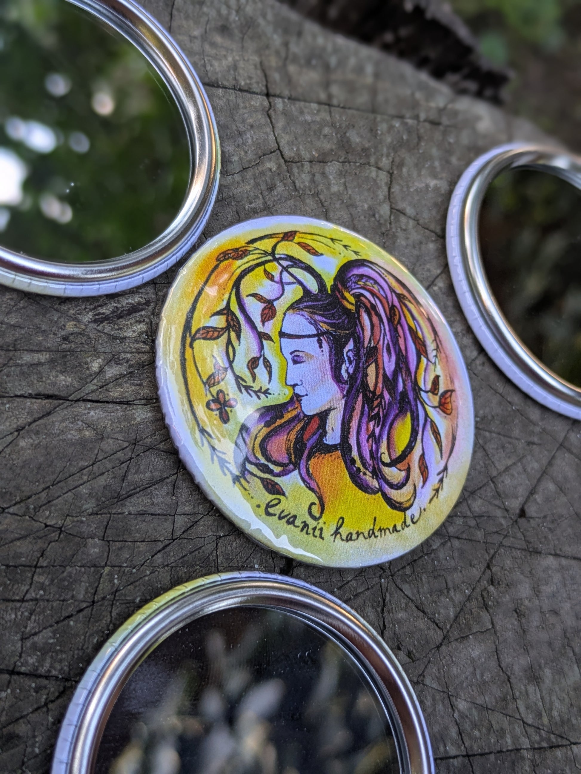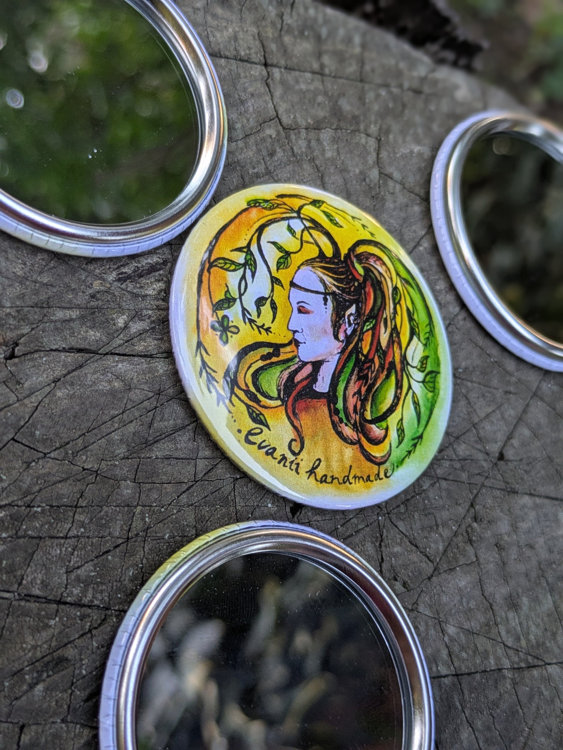 Malé kapesní zrcátkou s mojí autorskou kresbou dyády. Průměr zrcátka je 5 cm.