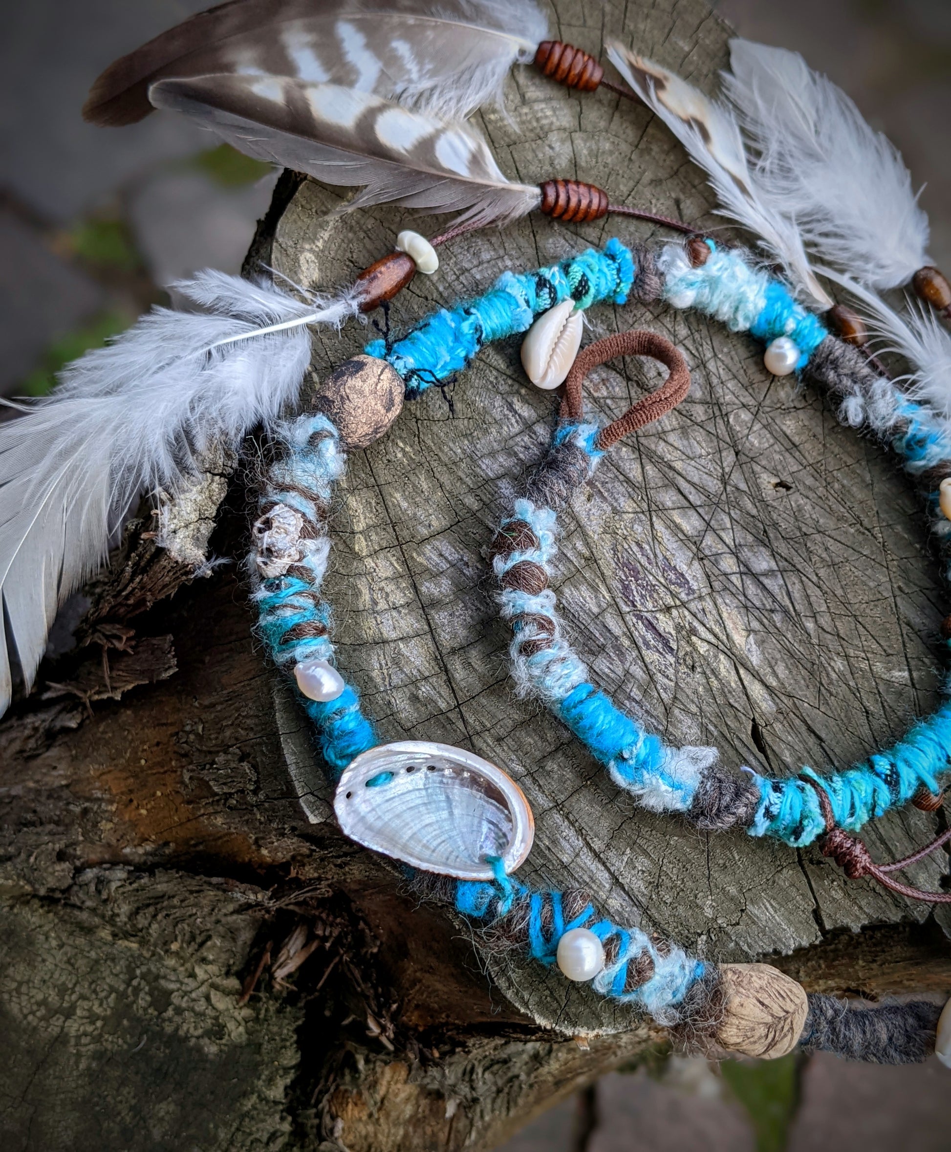 Decorative dreadlock made of yarn and recycled fabrics. Decorated with real pearls, shells, wooden and ceramic beads and a feather pendant that can be removed from the dreadlock and used separately as a feather hair ornament/dreadlocks.