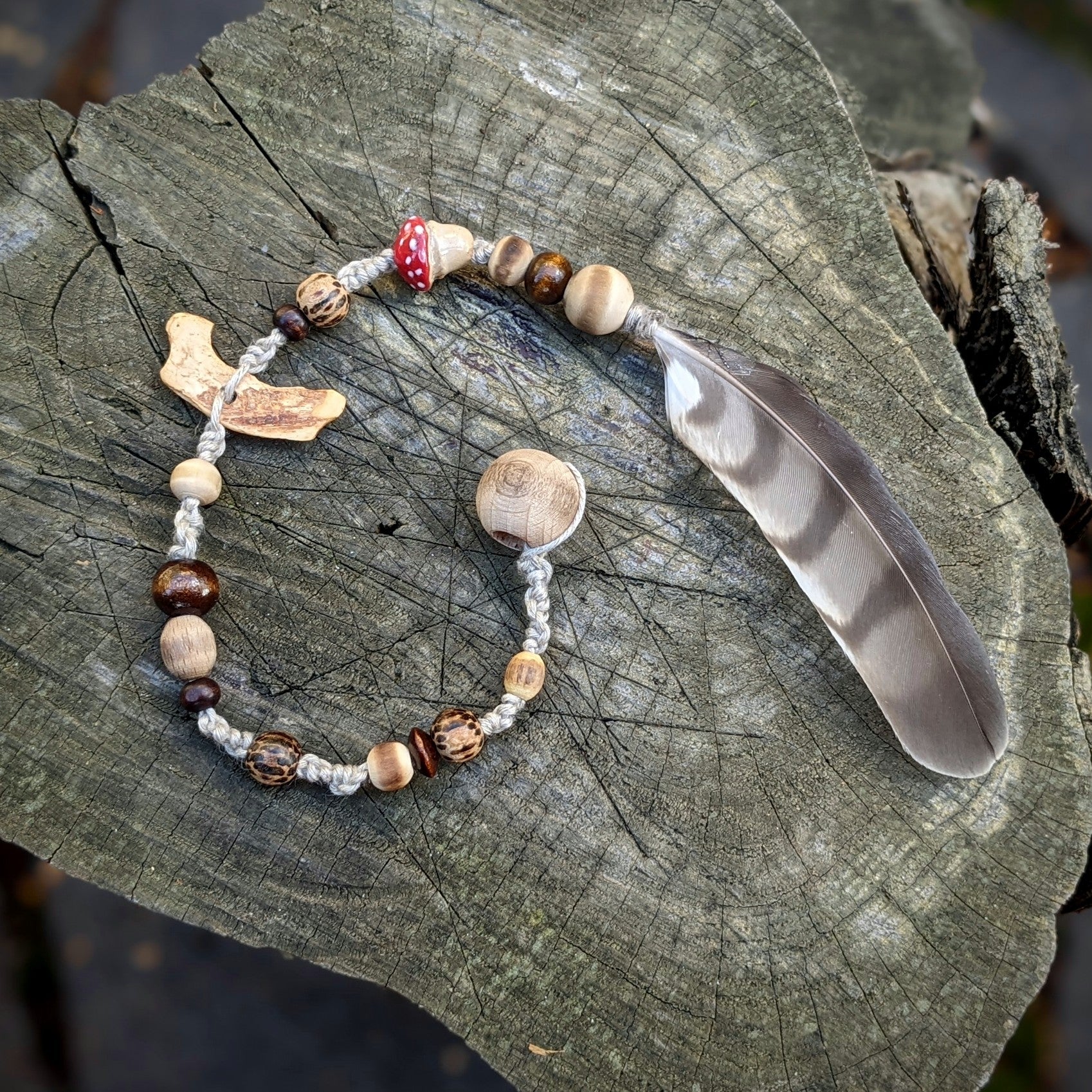 The curtain is made of linen cord, bone and wooden beads. Decorated with a ceramic toadstool (handmade Rhubarb) and feathers. The length of the curtain including the feather is approximately 30 cm.