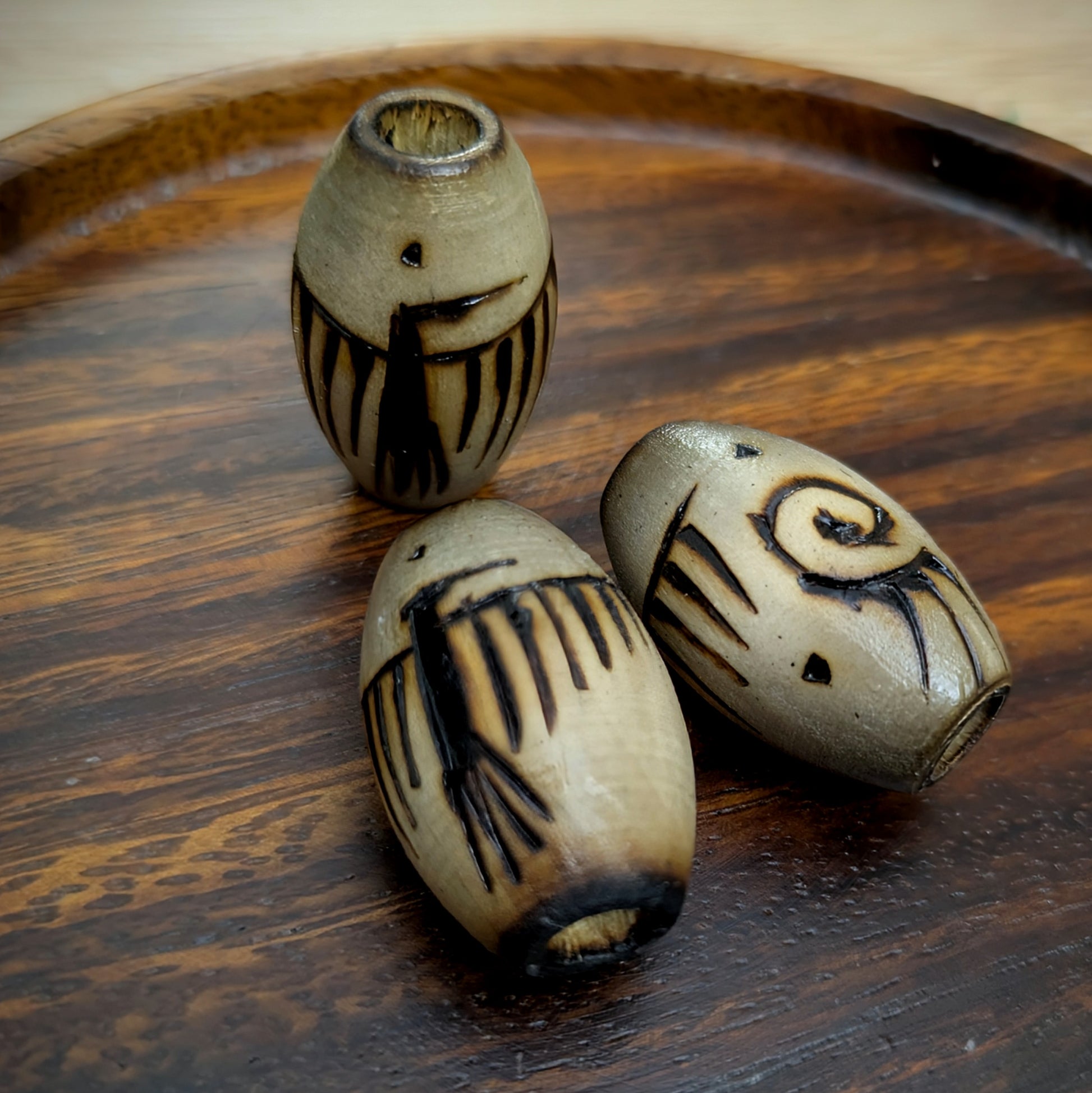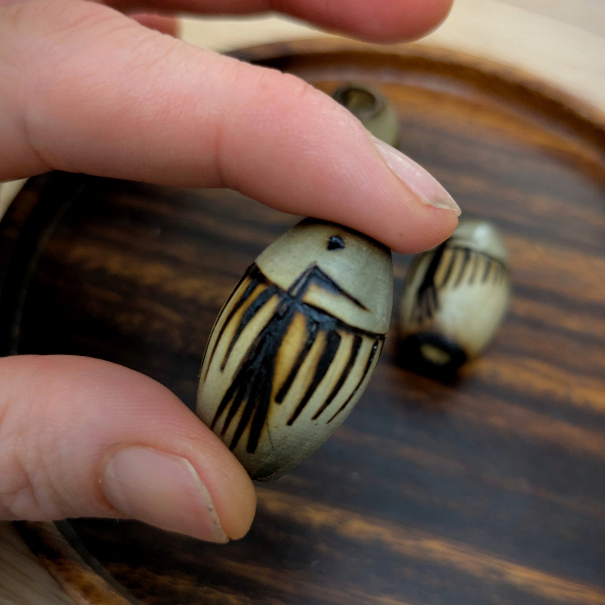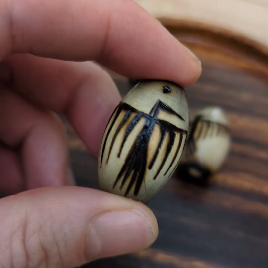Ručně vypalovaný a lakovaný korálek z mé dílny inspirovaný indiánskými petroglyfy - konkrétně motivem ptáka a spirály na druhé straně.