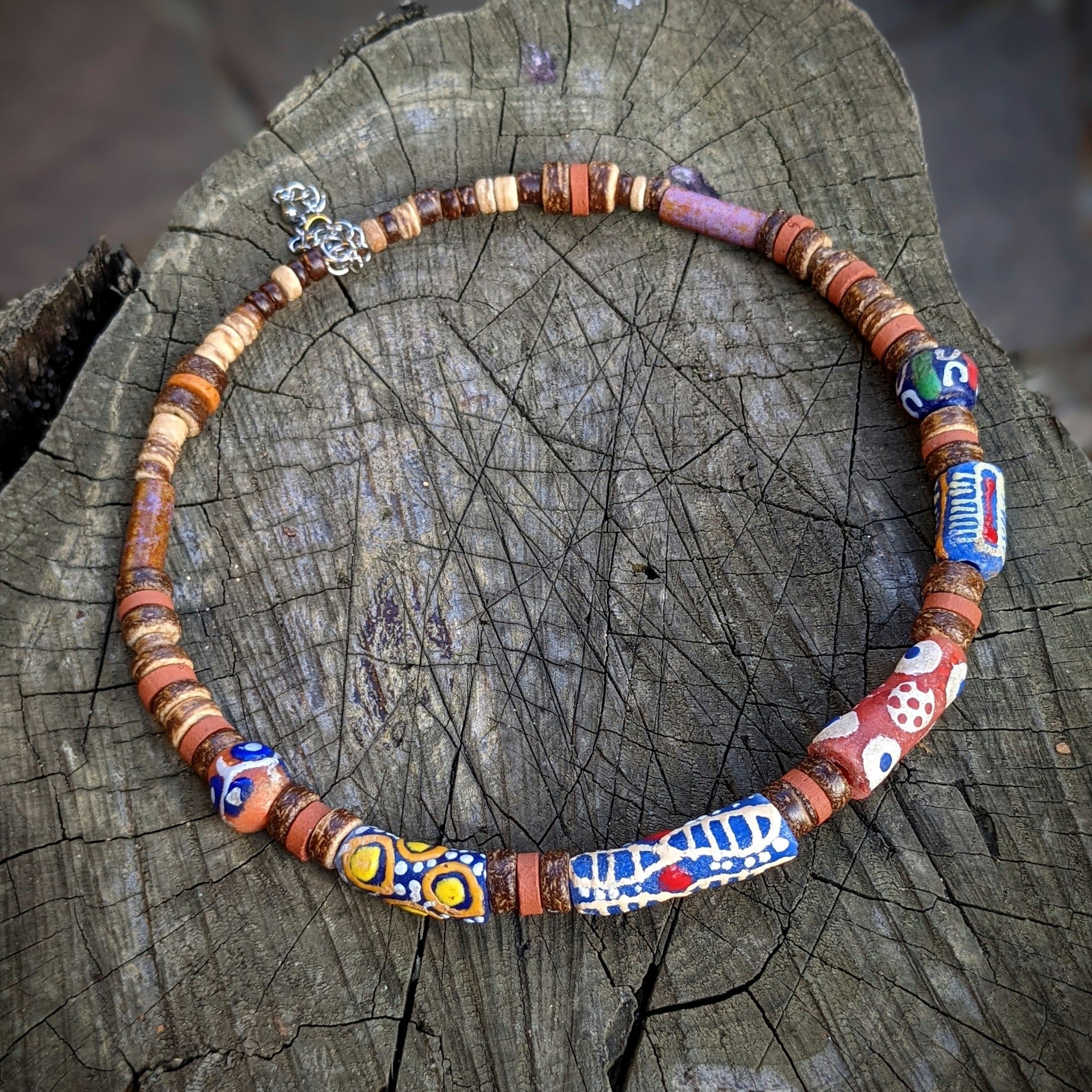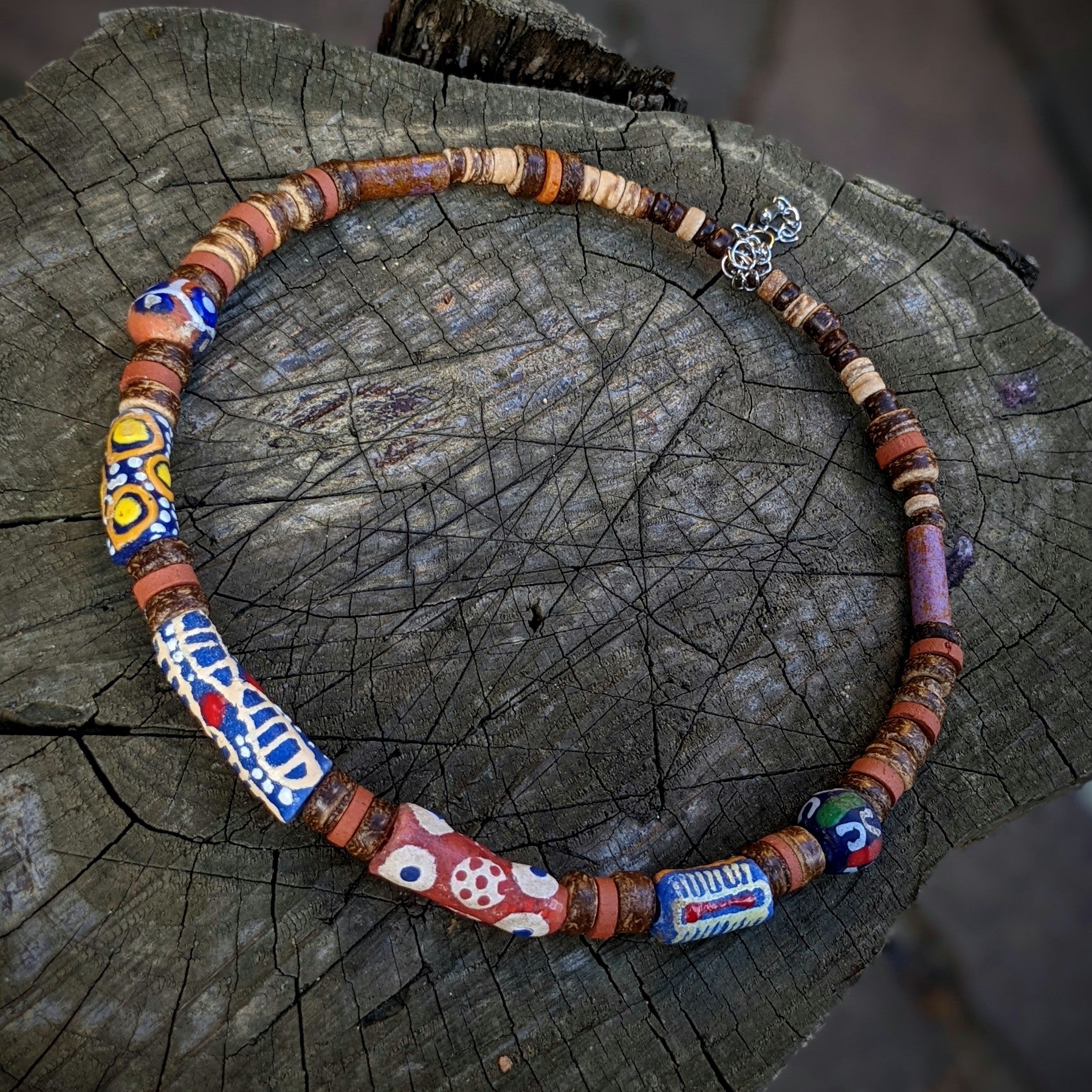 The necklace is created from original African "krobo" recycled glass beads, traditionally made in Ghana, which are complemented with wooden, glass, bone and coconut beads. Threaded on a hoop, which is designed for a neck circumference of 33-38 cm - can be adjusted with a carabiner and chain. The chain and carabiner are made of jewelry metal.