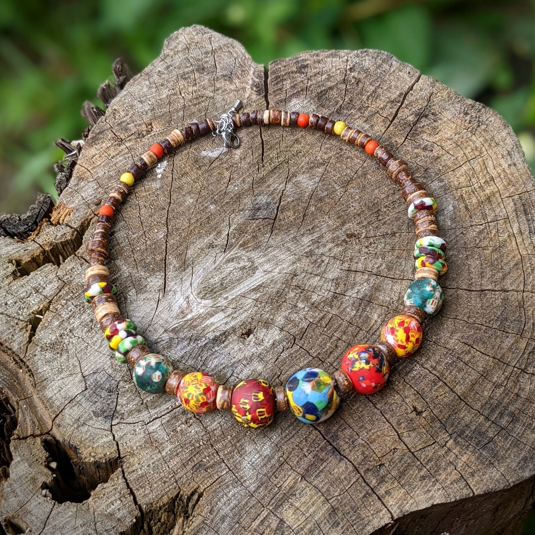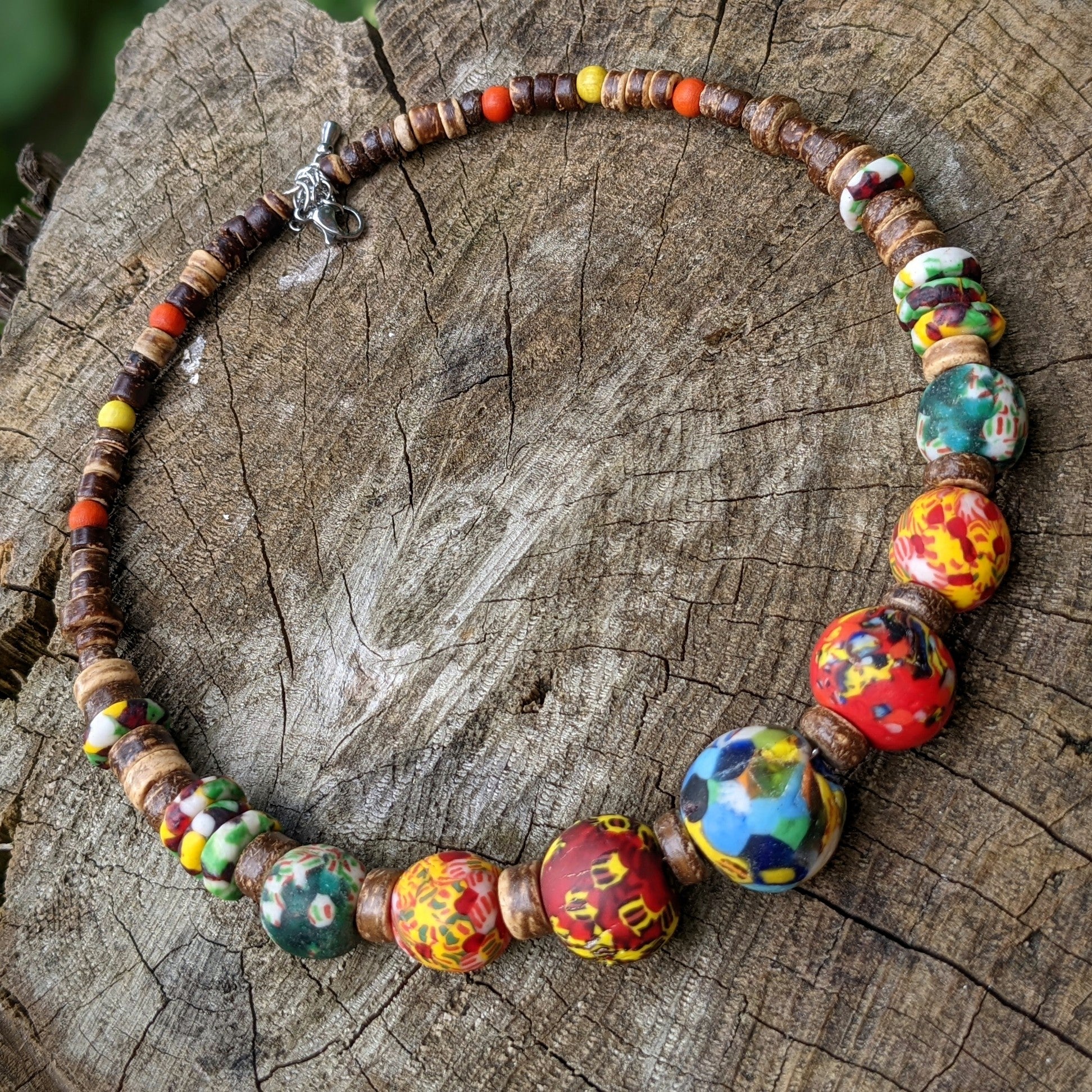 The necklace is created from original African "krobo" recycled glass beads, traditionally made in Ghana, which are complemented with wooden, glass, bone and coconut beads. Threaded on a hoop, which is designed for a neck circumference of 33-38 cm - can be adjusted with a carabiner and chain. The chain and carabiner are made of jewelry metal.