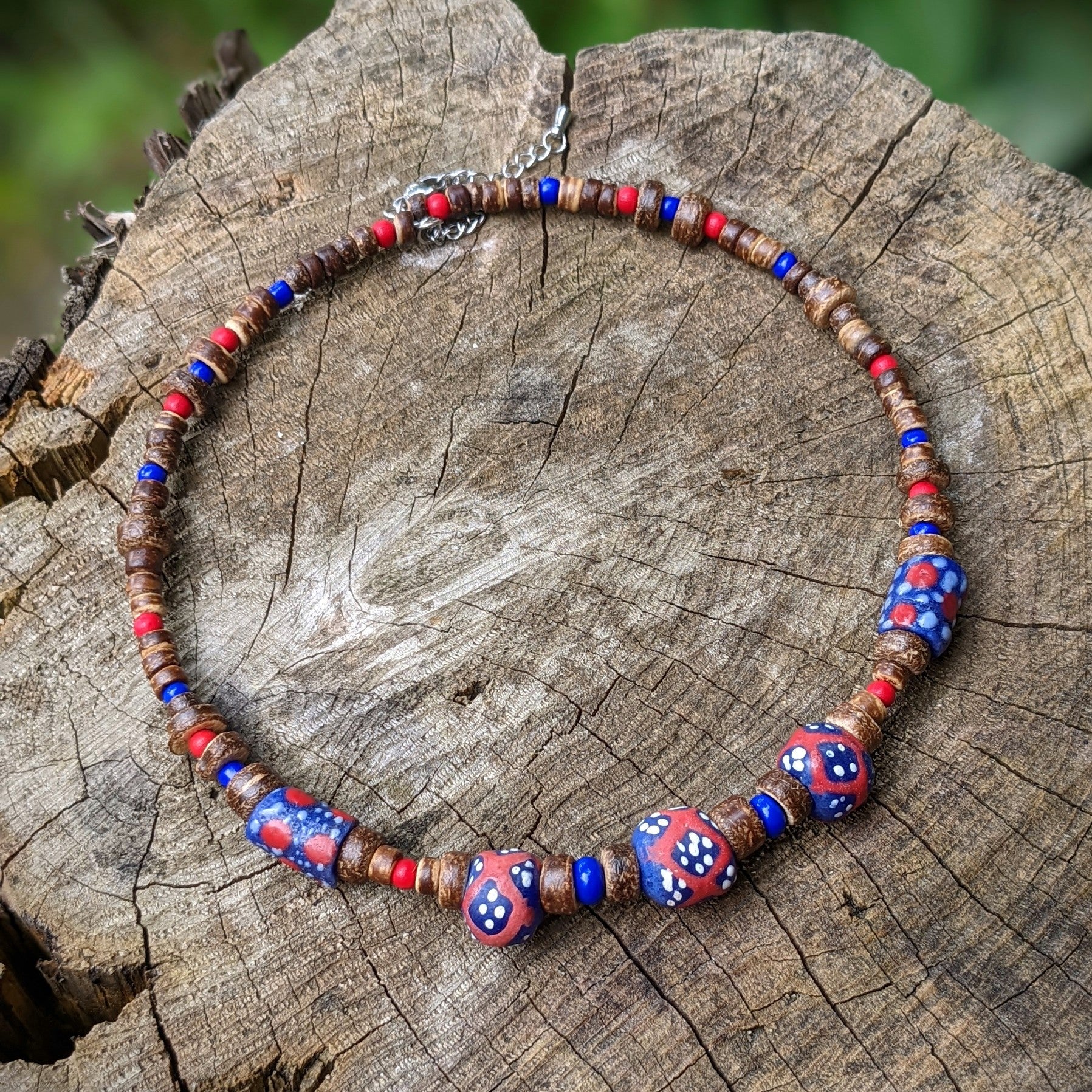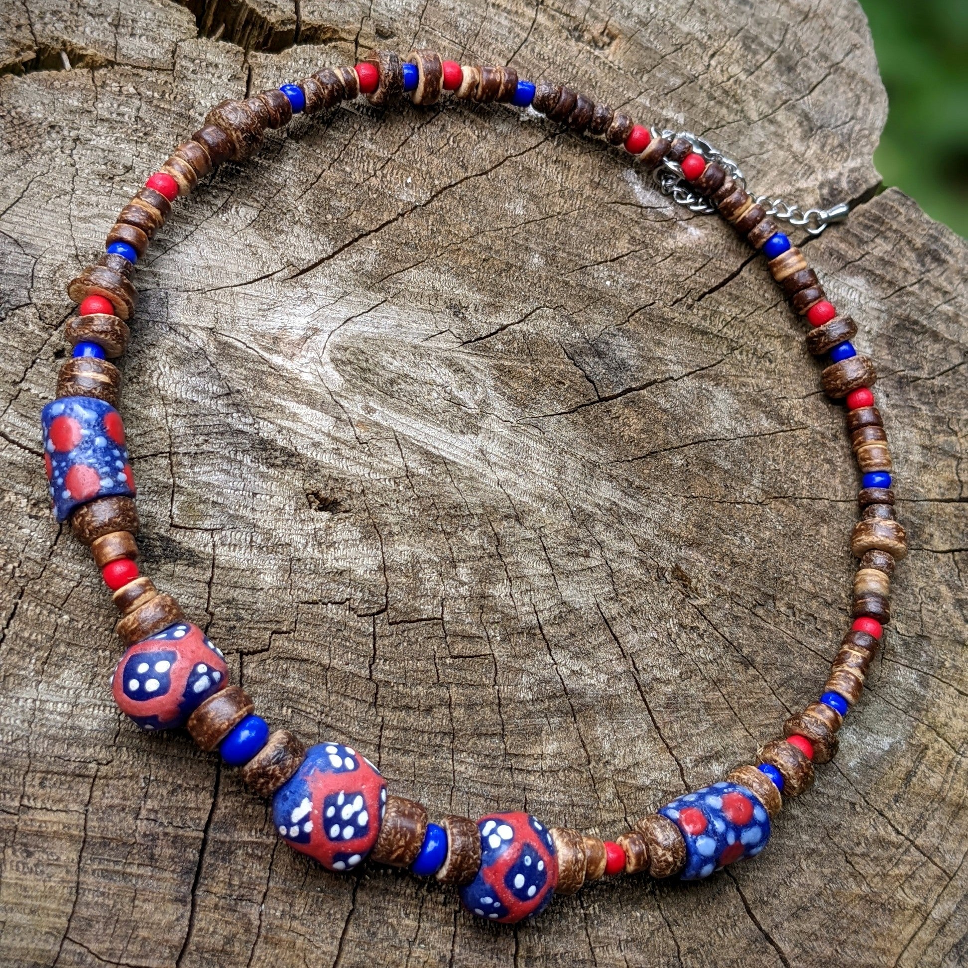 The necklace is created from original African "krobo" recycled glass beads, traditionally made in Ghana, which are complemented with wooden, glass, bone and coconut beads. Threaded on a hoop, which is designed for a neck circumference of 33-38 cm - can be adjusted with a carabiner and chain. The chain and carabiner are made of jewelry metal.