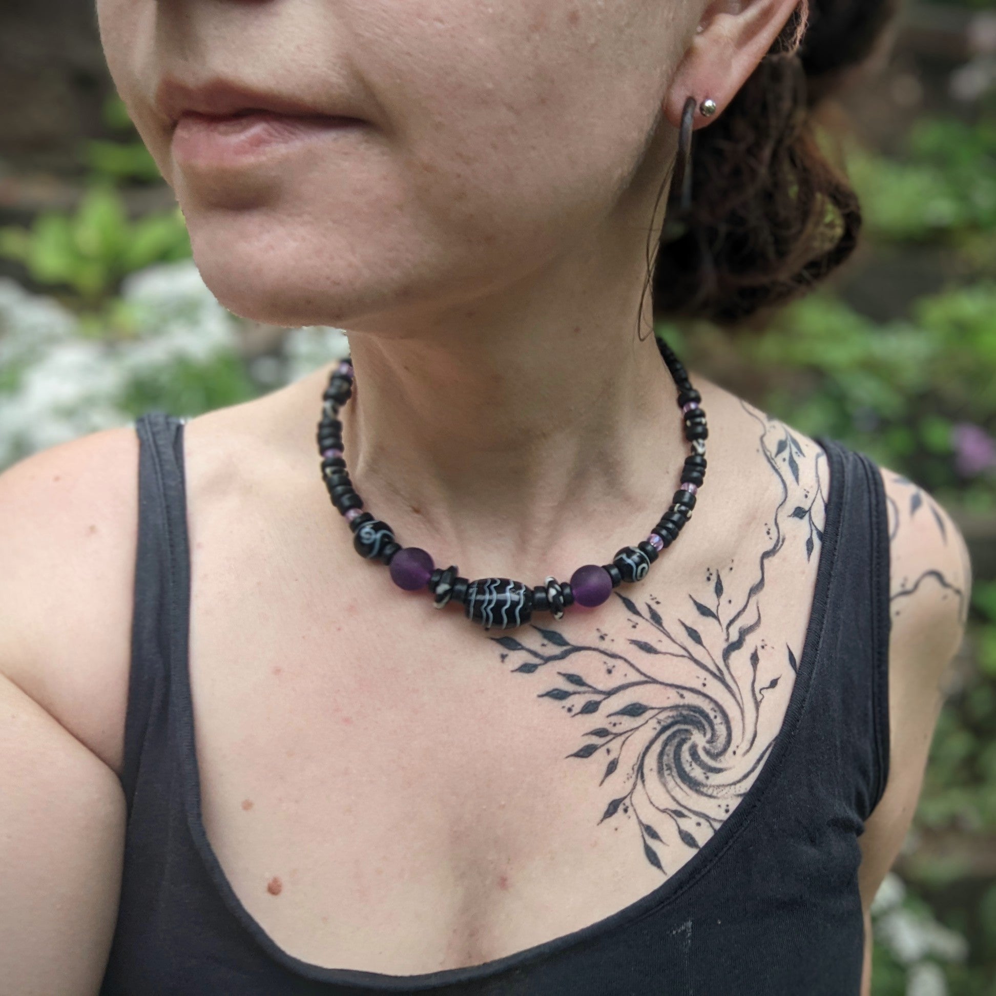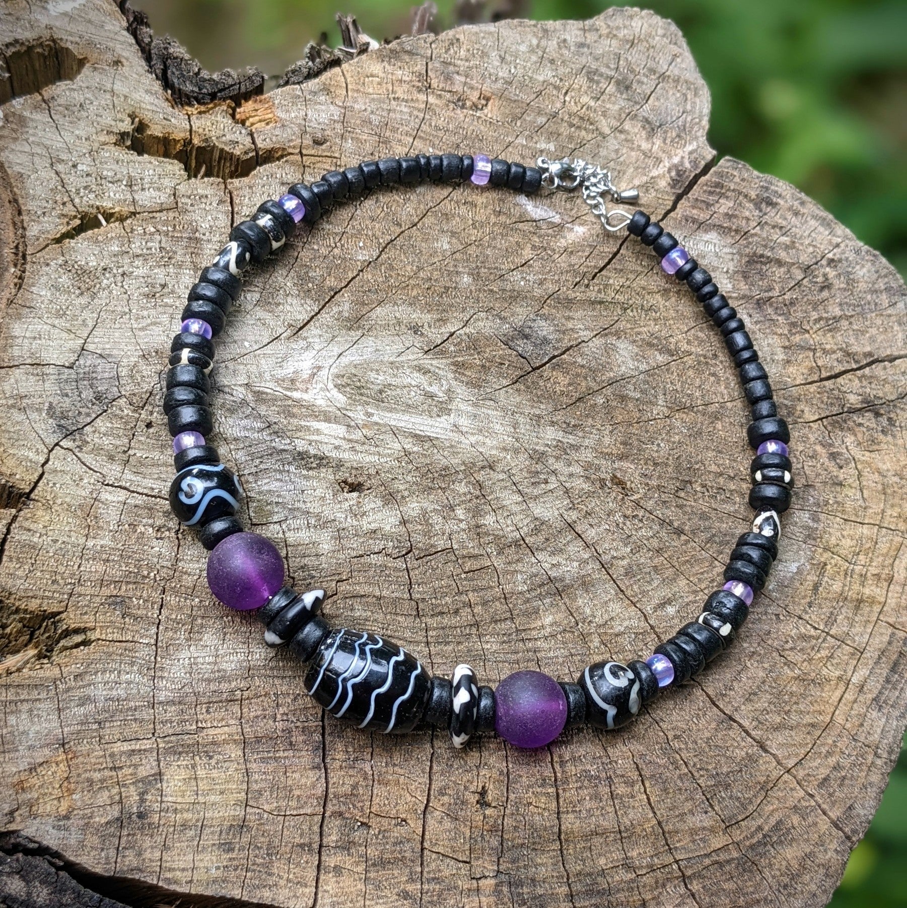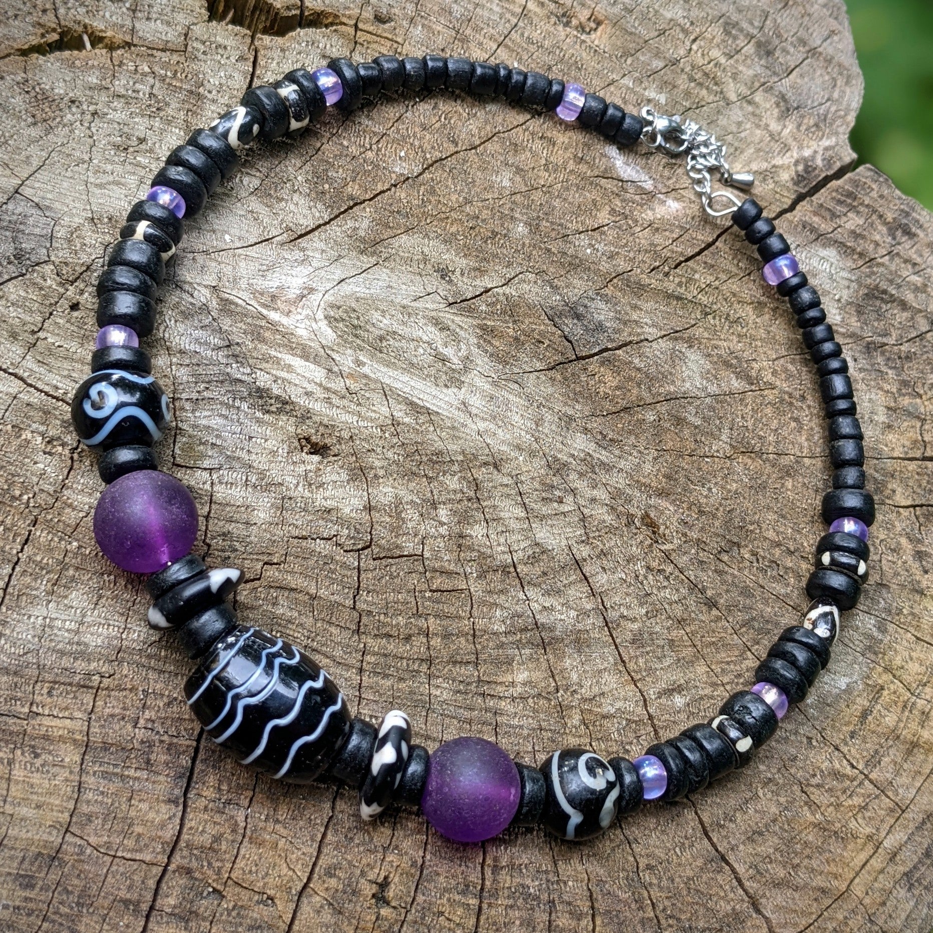 The necklace is created from original African "krobo" recycled glass beads, traditionally made in Ghana, which are complemented with wooden, glass, bone and coconut beads. Threaded on a hoop, which is designed for a neck circumference of 33-38 cm - can be adjusted with a carabiner and chain. The chain and carabiner are made of jewelry metal.