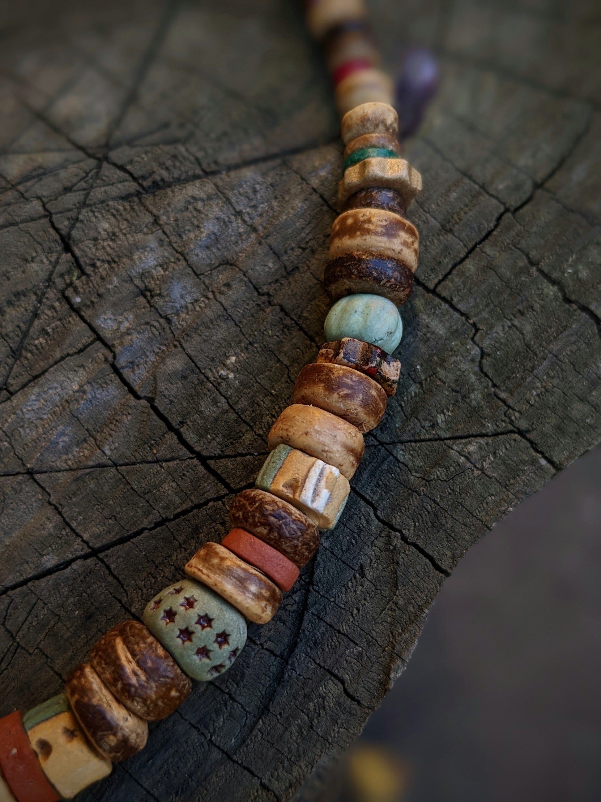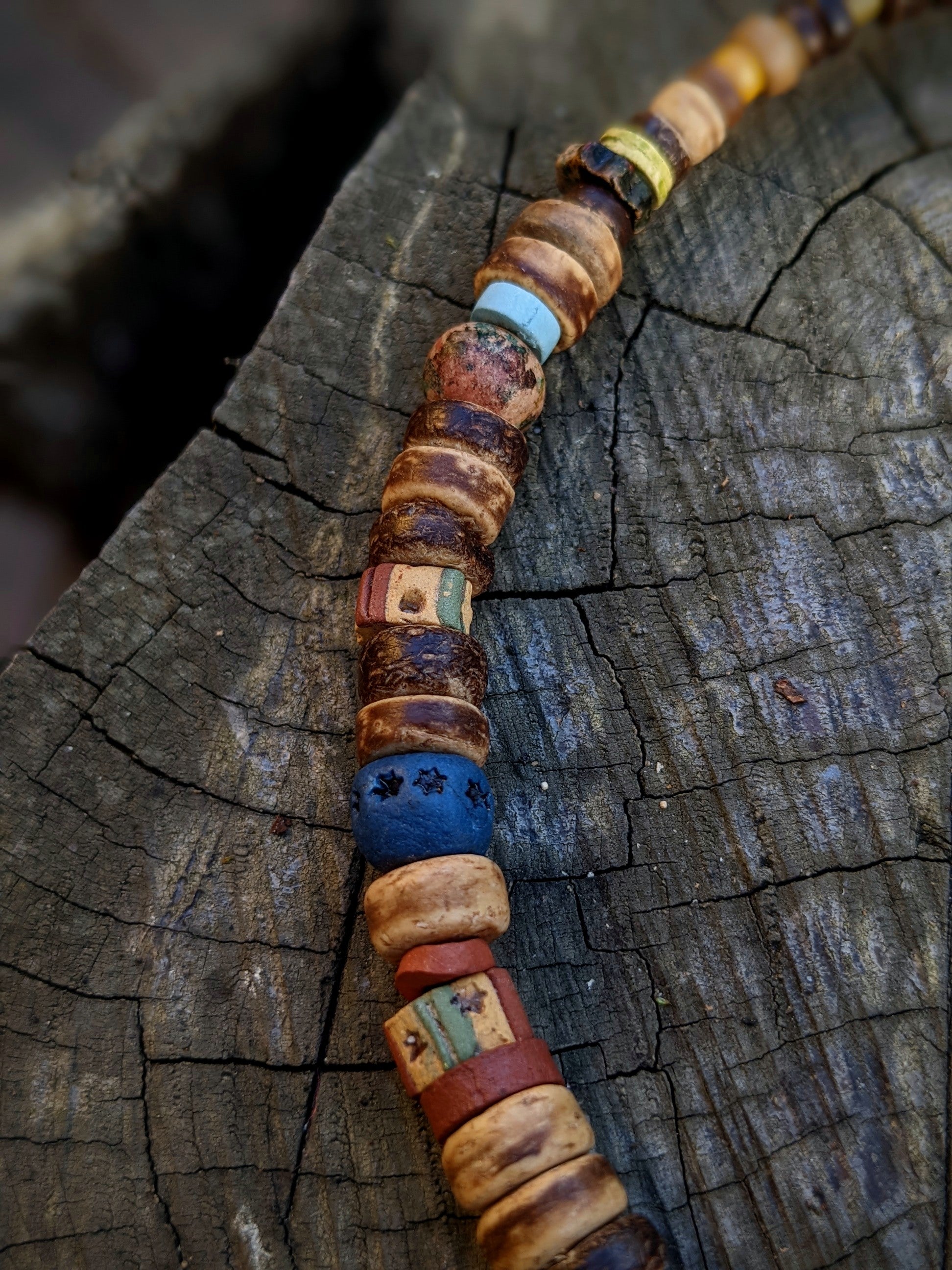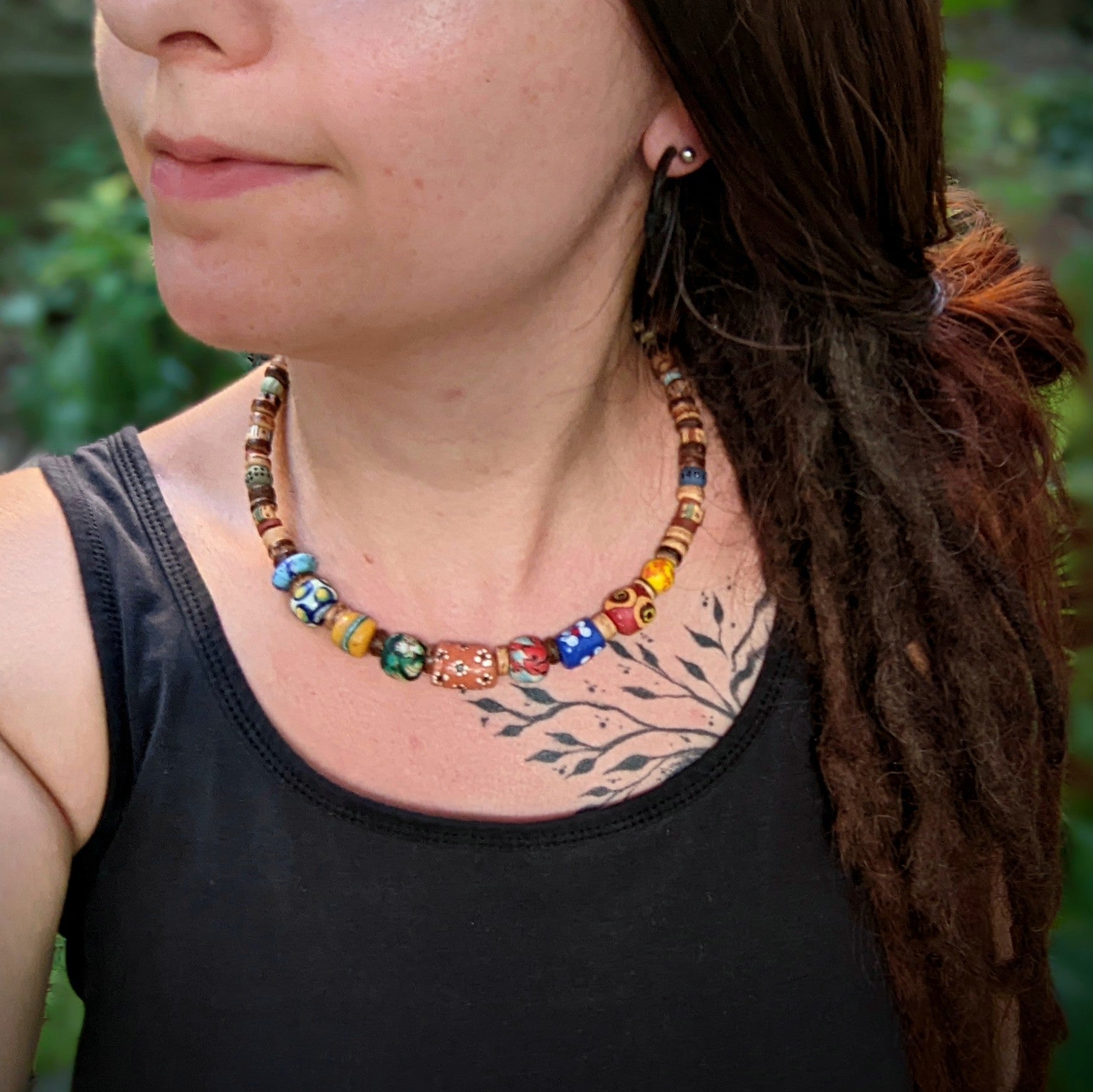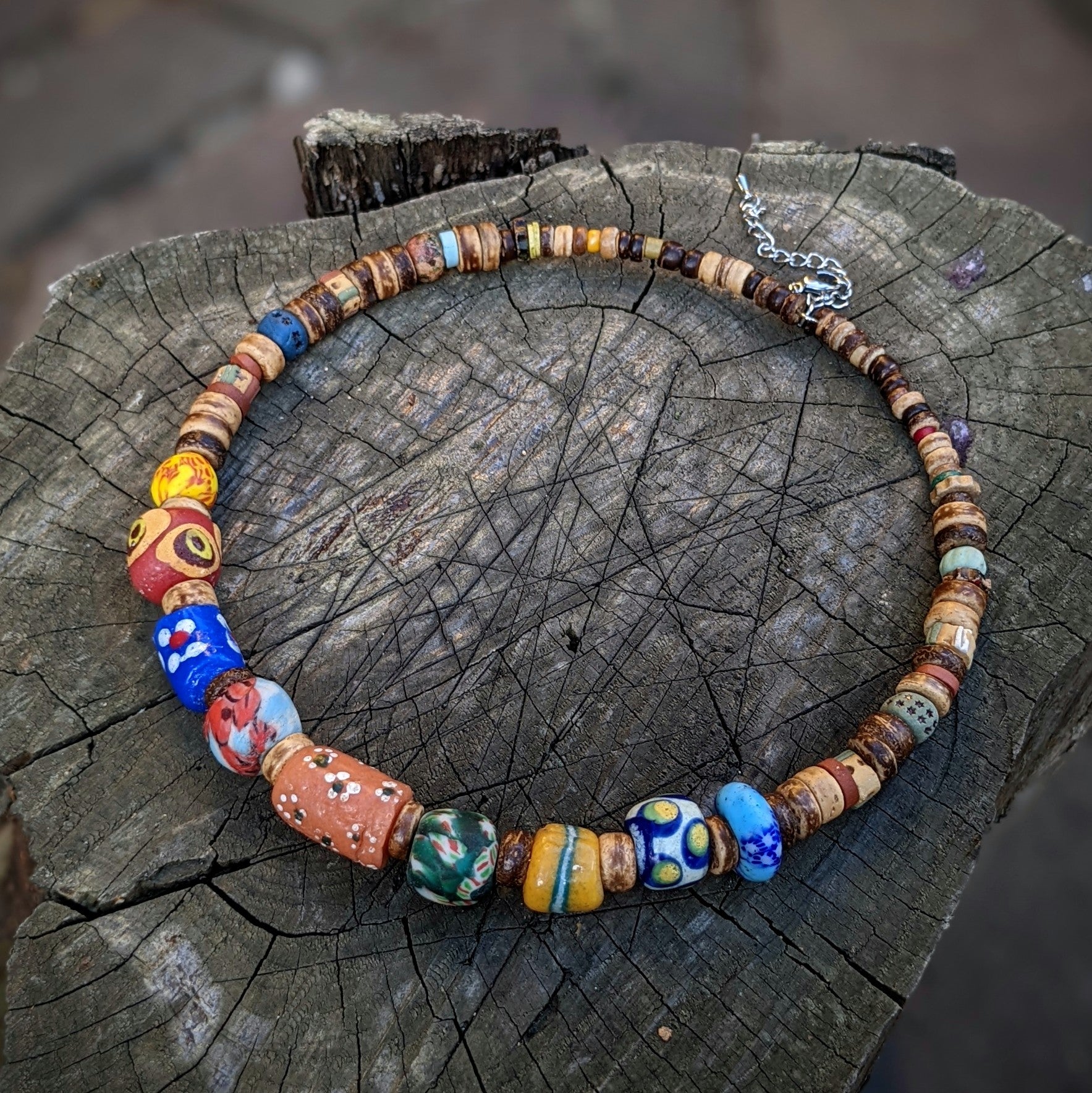 The necklace is created from original African "krobo" recycled glass beads, traditionally made in Ghana, which are complemented with wooden, glass, bone and coconut beads. Threaded on a hoop, which is designed for a neck circumference of 33-38 cm - can be adjusted with a carabiner and chain. The chain and carabiner are made of jewelry metal.