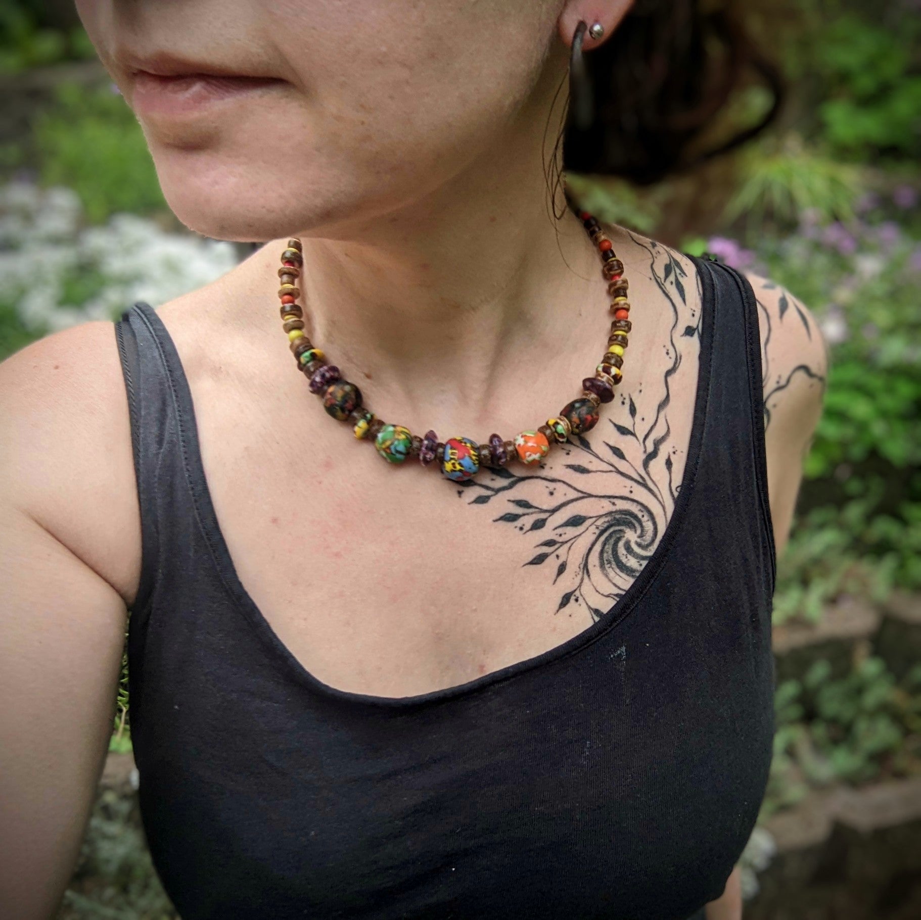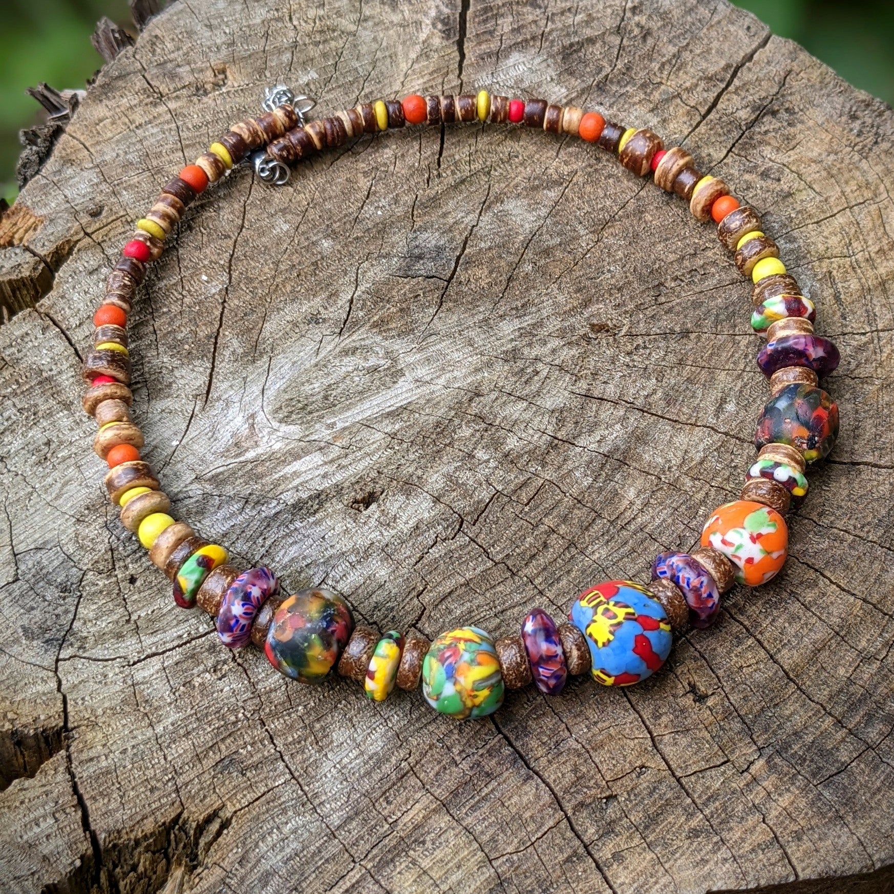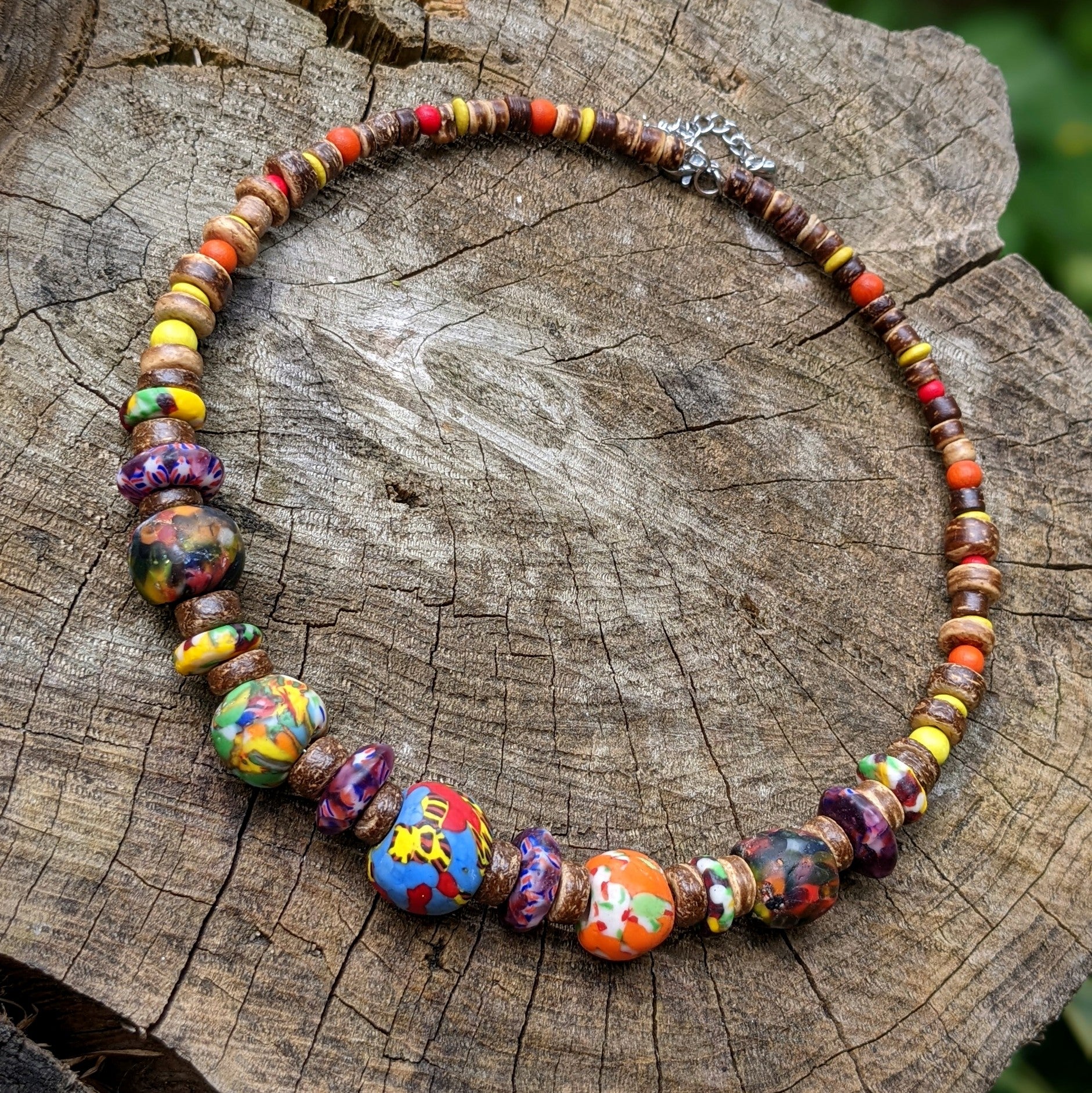 The necklace is created from original African "krobo" recycled glass beads, traditionally made in Ghana, which are complemented with wooden, glass, bone and coconut beads. Threaded on a hoop, which is designed for a neck circumference of 33-38 cm - can be adjusted with a carabiner and chain. The chain and carabiner are made of jewelry metal.