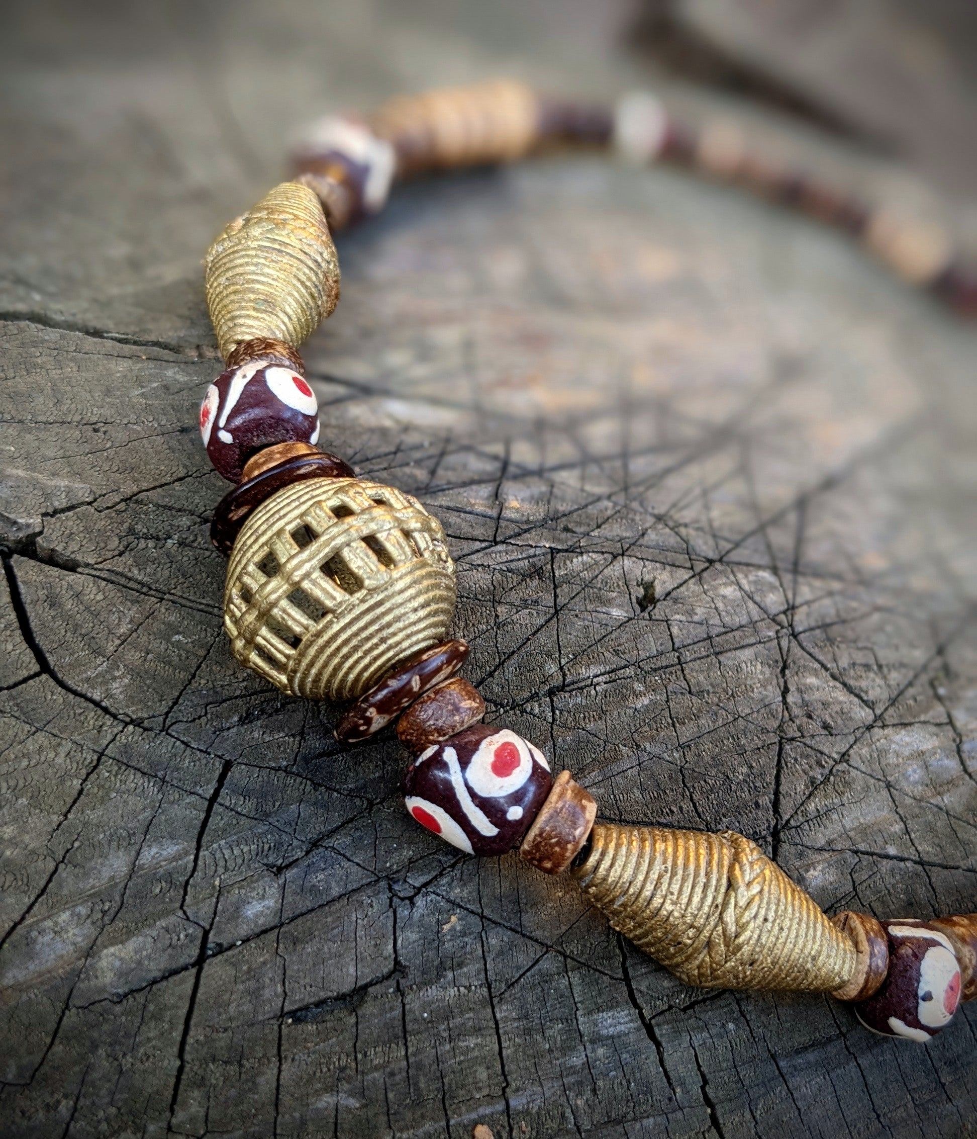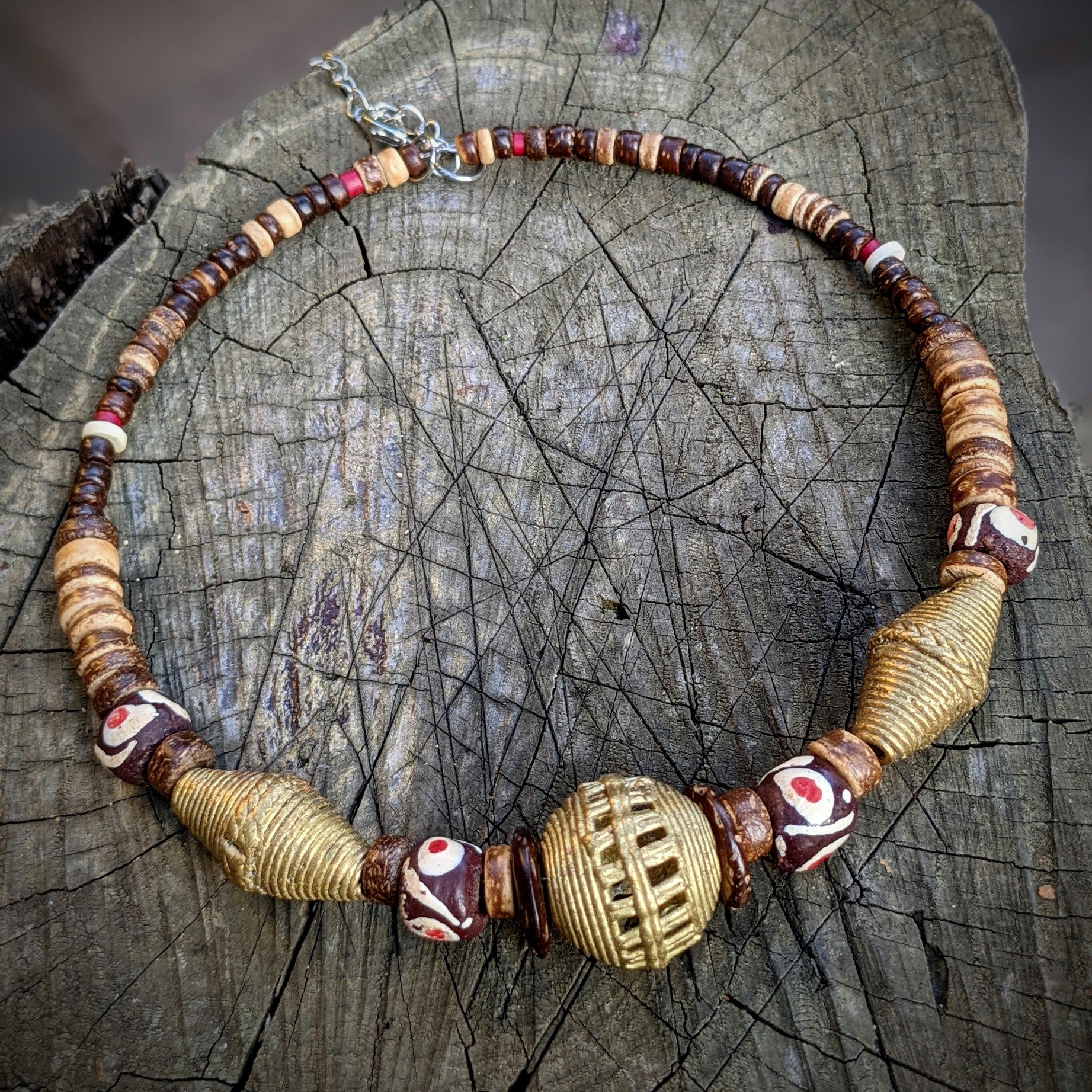 The necklace is created from original African "krobo" recycled glass beads, traditionally made in Ghana, which are complemented with wooden, glass, bone and coconut beads. Threaded on a hoop, which is designed for a neck circumference of 33-38 cm - can be adjusted with a carabiner and chain. The chain and carabiner are made of jewelry metal.