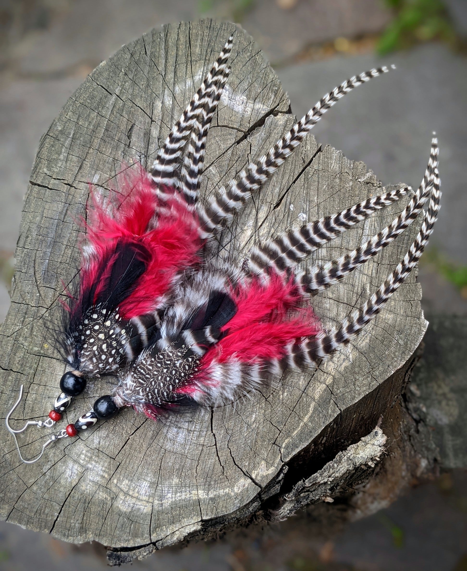 Distinctive feather earrings (pearl, rooster...) complemented by bone and wooden beads. Hooks are made of surgical steel, supplied with silicone stoppers. The length of the decorative part of the earrings is up to 20 cm.