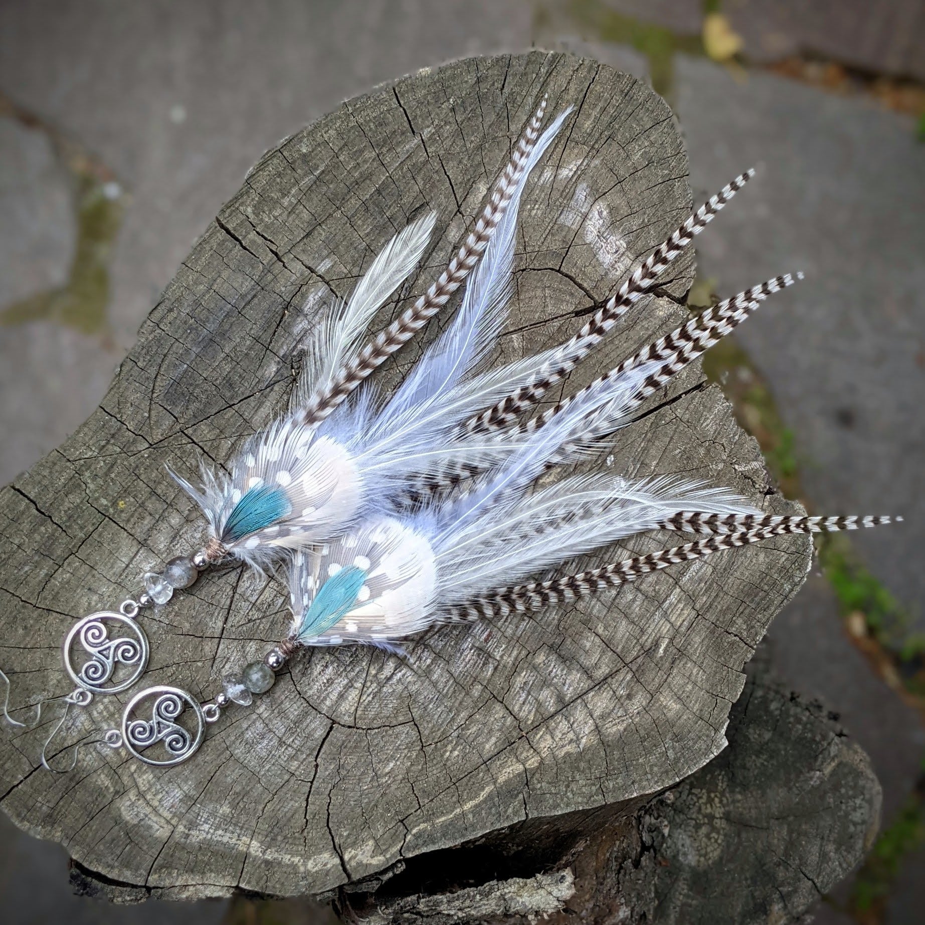 Distinctive feather earrings (parrots, pearl, rooster...) complemented by metal spirals, a labradorite and crystal bead and metal beads. The hooks are made of surgical steel, and come with silicone stoppers. The length of the decorative part of the earrings is up to 25 cm.