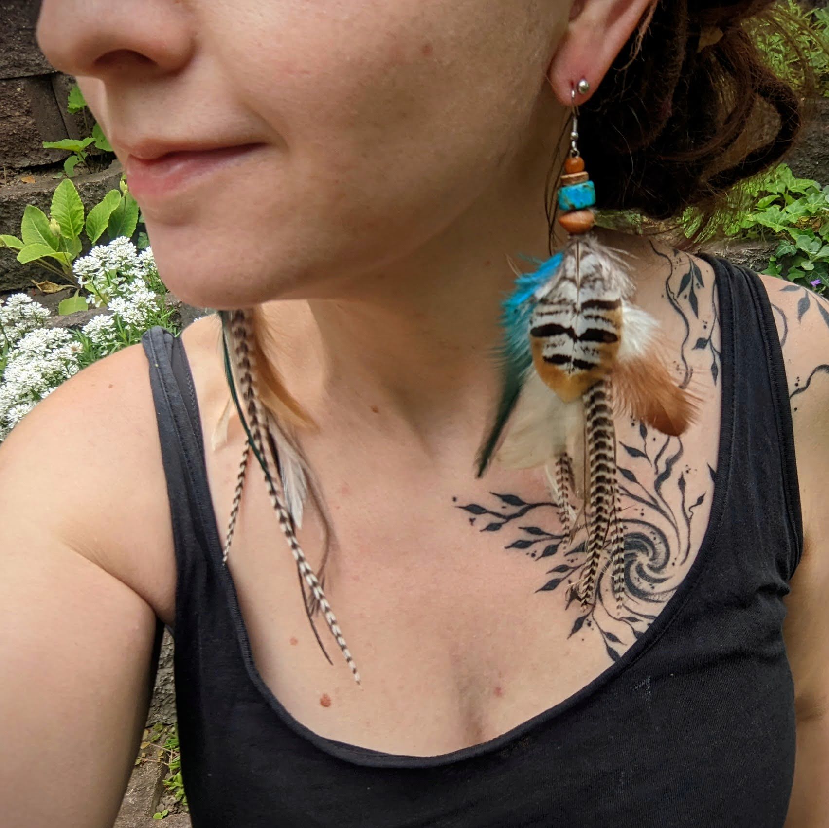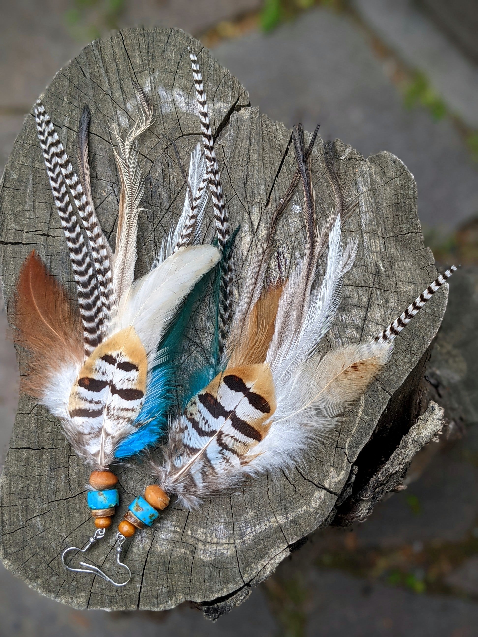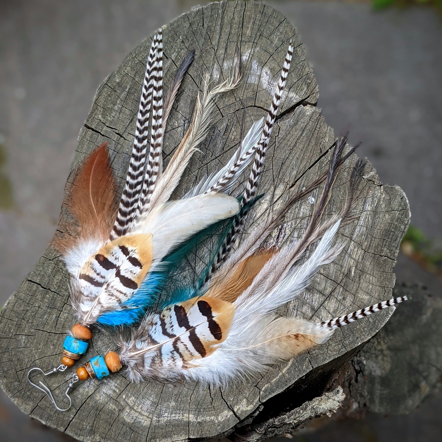 Distinctive feather earrings (emu, pheasant, rooster...) complemented by cherry stone beads, wooden beads and turquoise beads. The hooks are made of surgical steel, and come with silicone stoppers. The length of the decorative part of the earrings is up to 20 cm.