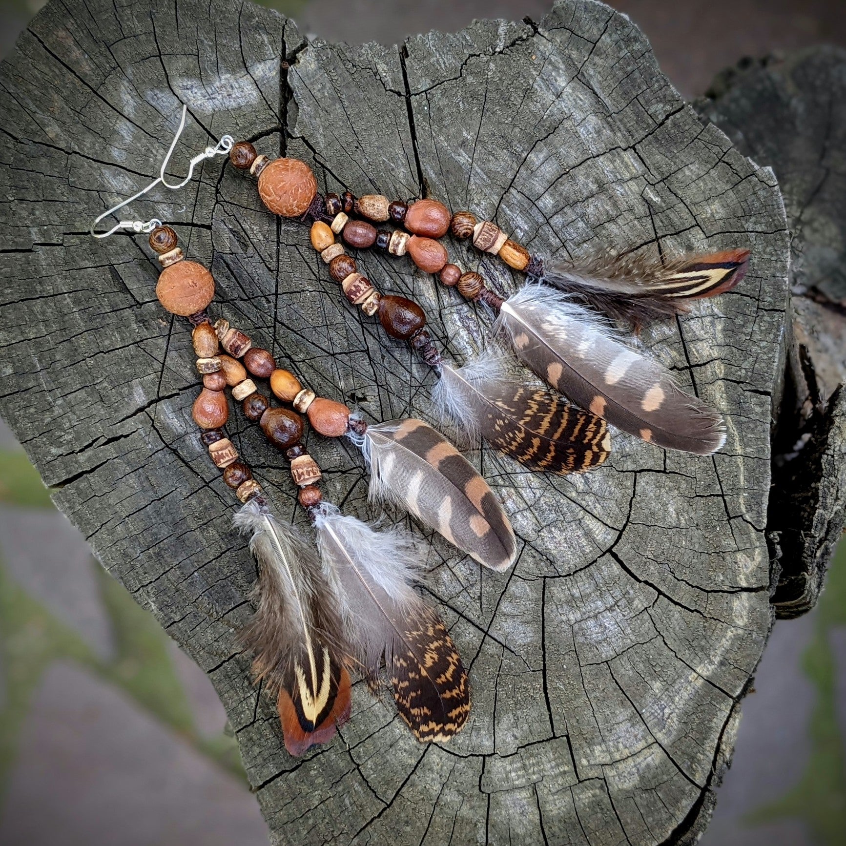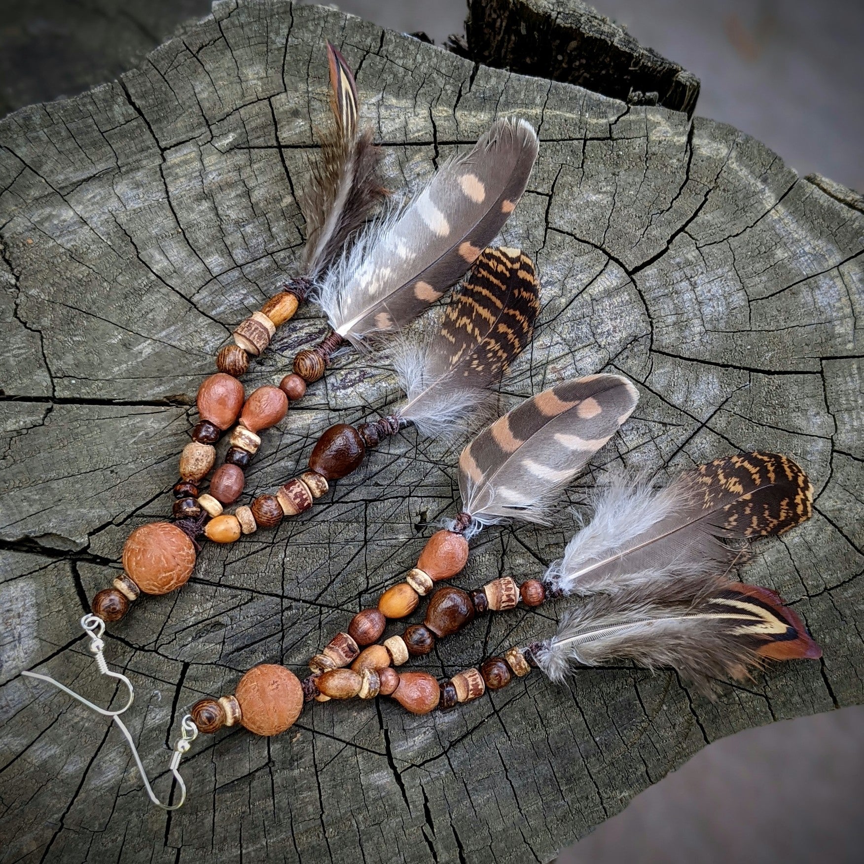 Feather earrings inspired by the forest with beads made of kelp, rudraksha, coconut, gall and wooden beads. Hooks are made of surgical steel, supplied with silicone stoppers. The length of the decorative part of the earrings is approximately 16 cm.