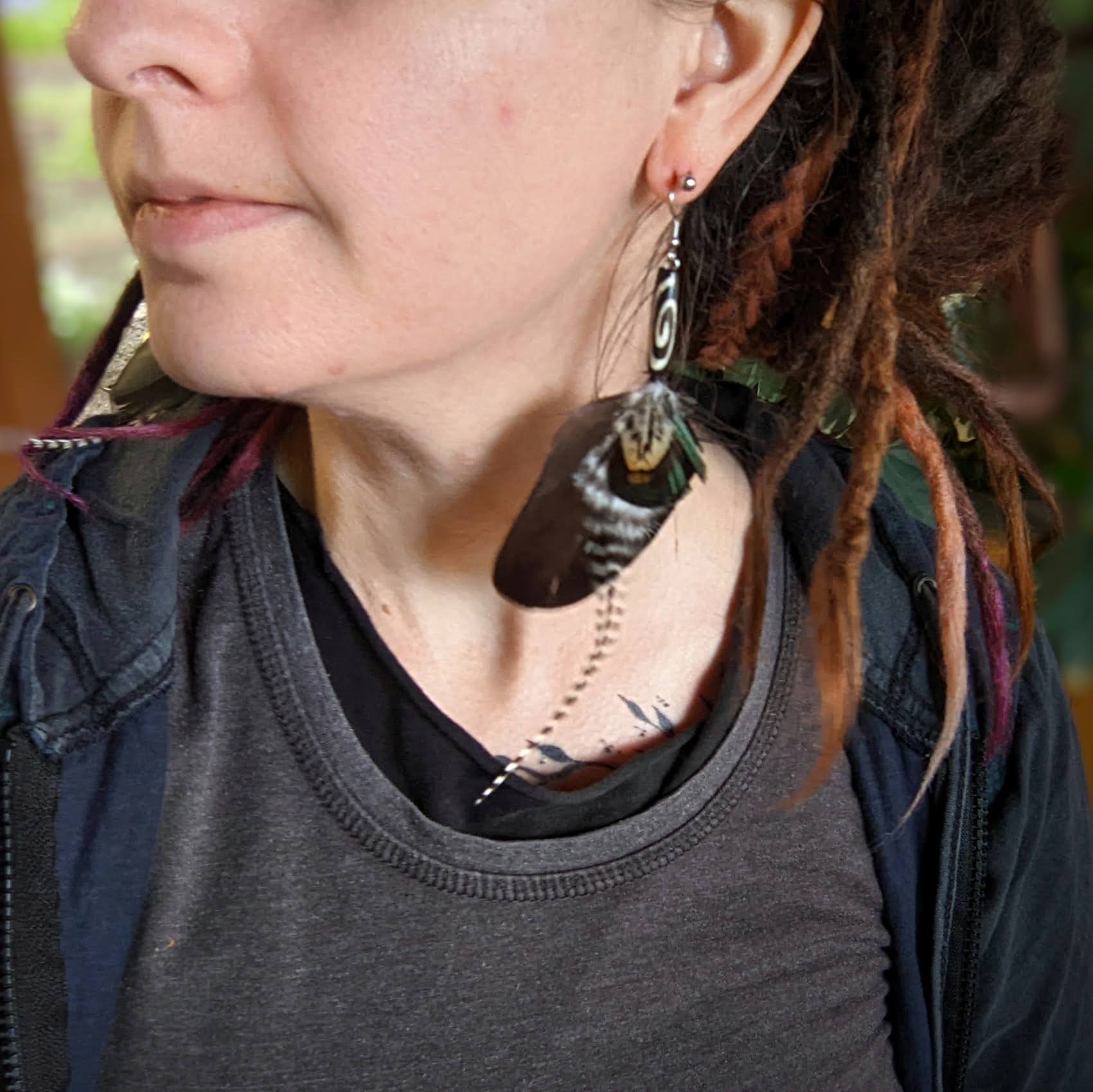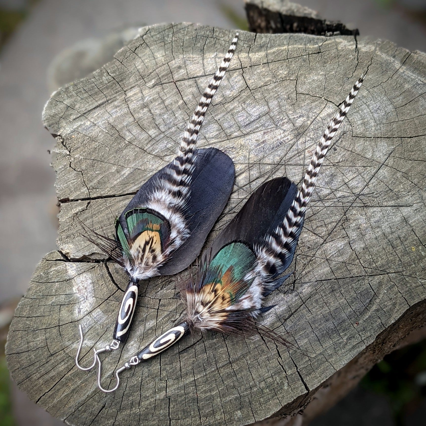 Distinctive feather earrings (pheasant, rooster, raven...) complemented by long bone beads. The hooks are made of surgical steel, and come with silicone stoppers. The length of the decorative part of the earrings is approximately 17 cm.