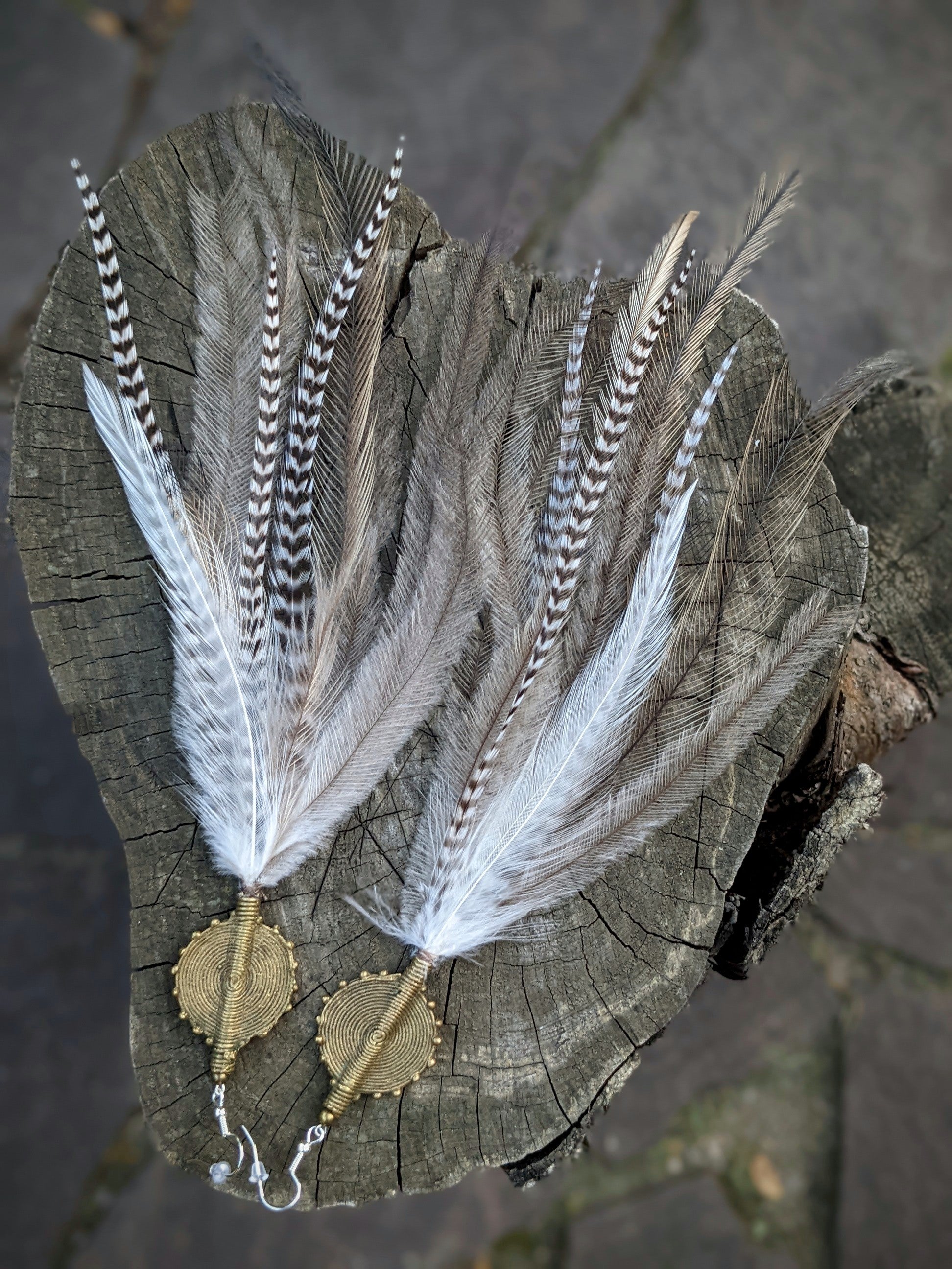Distinctive feather earrings with beautiful brass beads handmade in Ghana (so the earrings are a little heavier). The feathers are made of emu and rooster. The hooks are made of surgical steel, they come with silicone stoppers. The length of the decorative part of the earrings is approximately 25 cm.