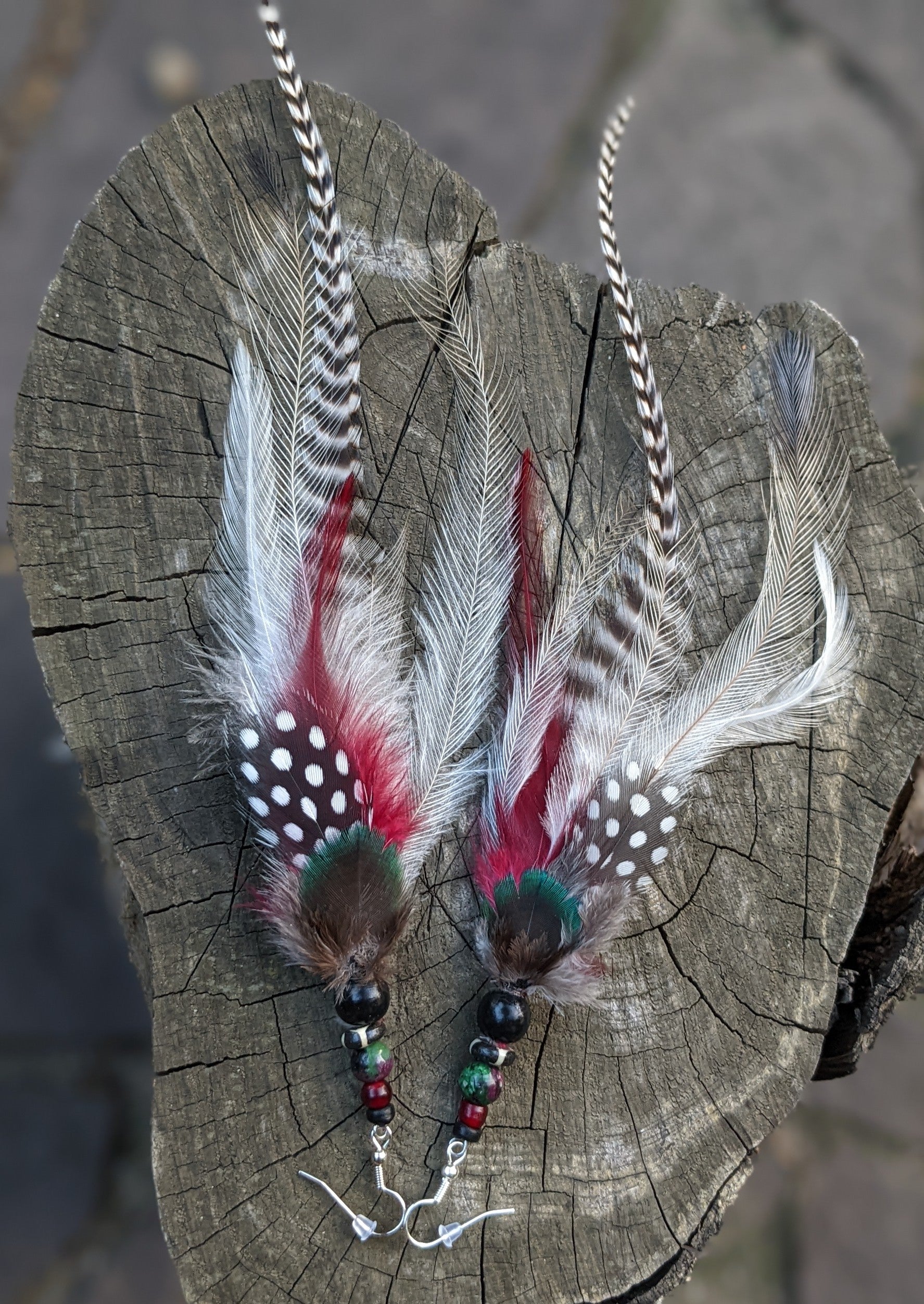 Distinctive feather earrings (peacock, emu, peacock, rooster...) complemented by wooden, bone and mineral beads. The hooks are made of surgical steel, and come with silicone stoppers. The length of the decorative part of the earrings is approximately 22 cm.