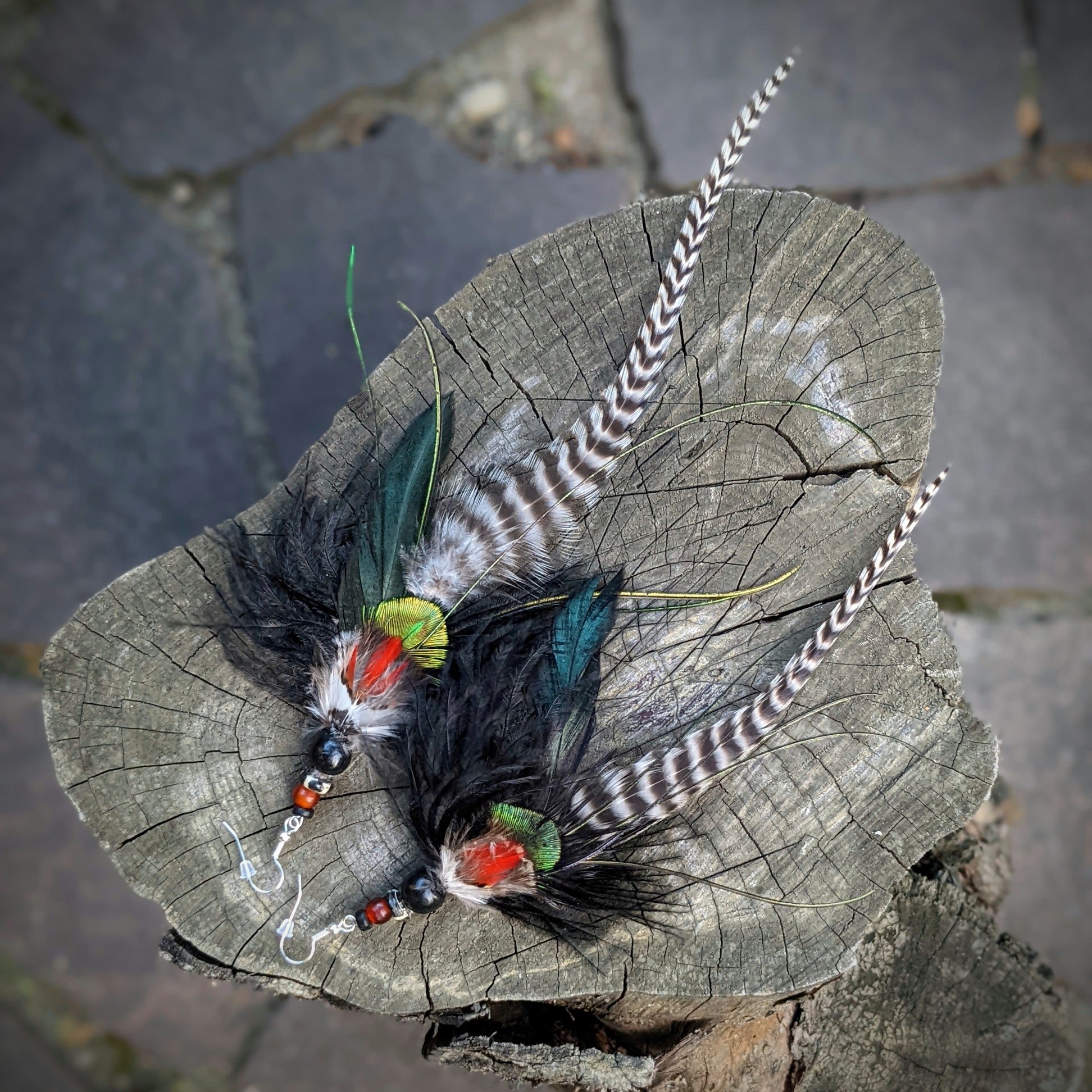 Distinctive feather earrings (ostrich, peacock, pheasant, rooster...) complemented by wooden and bone beads. Hooks are made of surgical steel, supplied with silicone stoppers. The length of the decorative part of the earrings is approximately 20 cm.