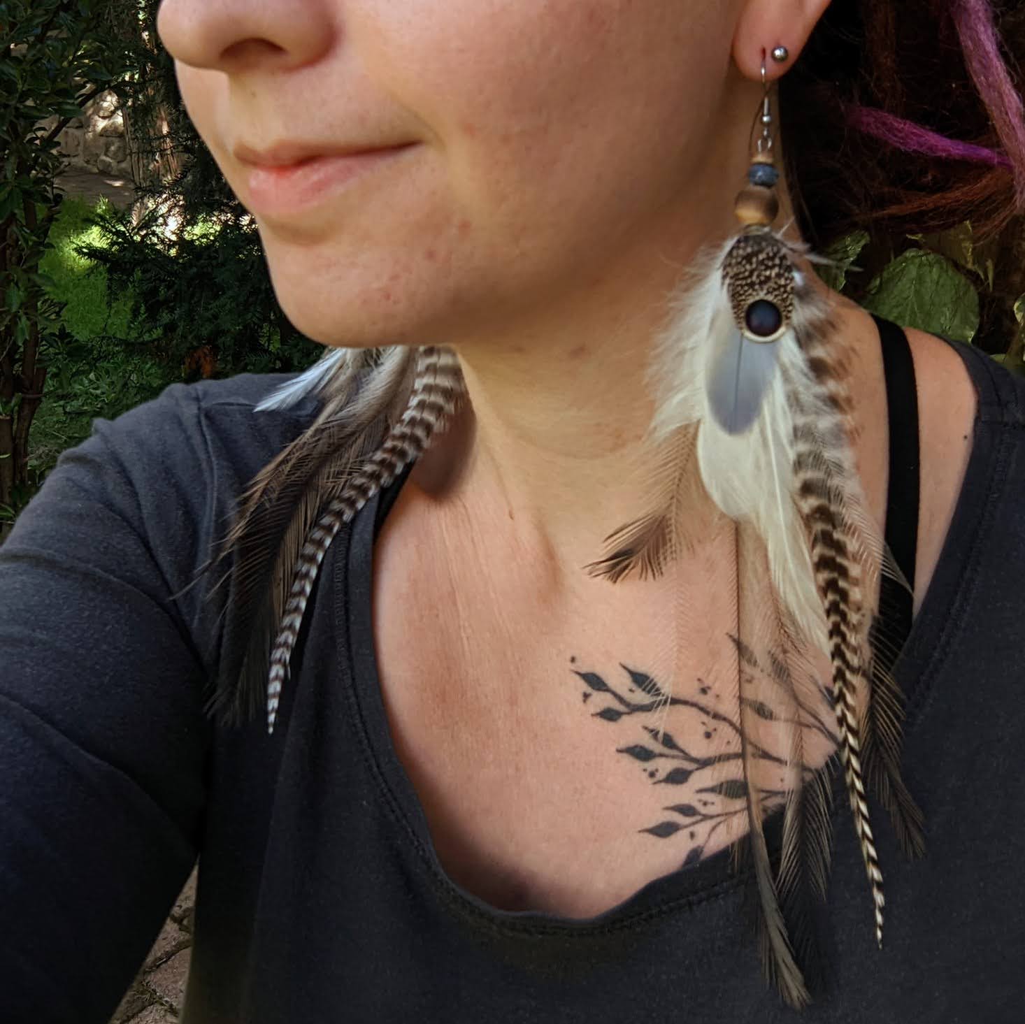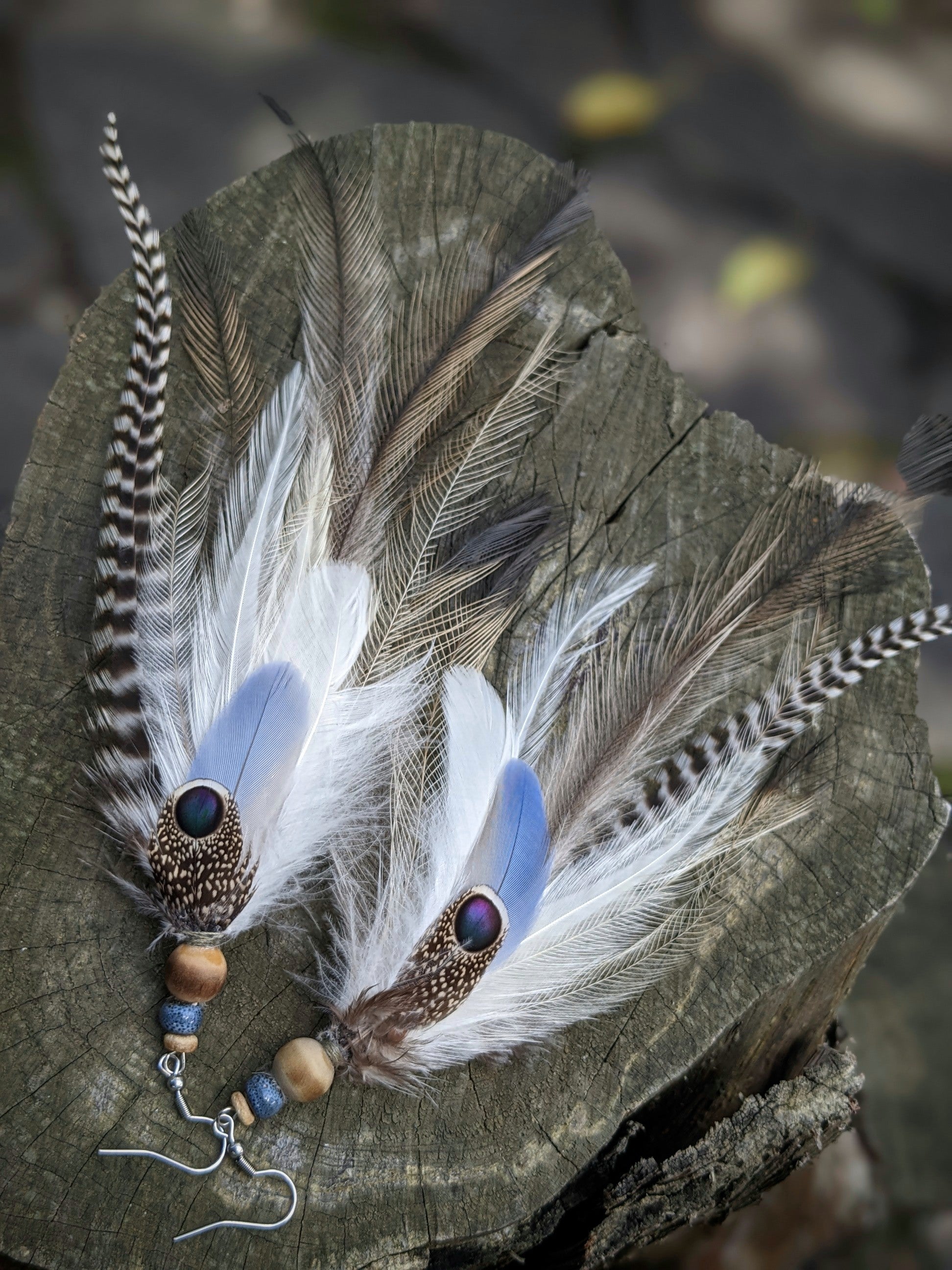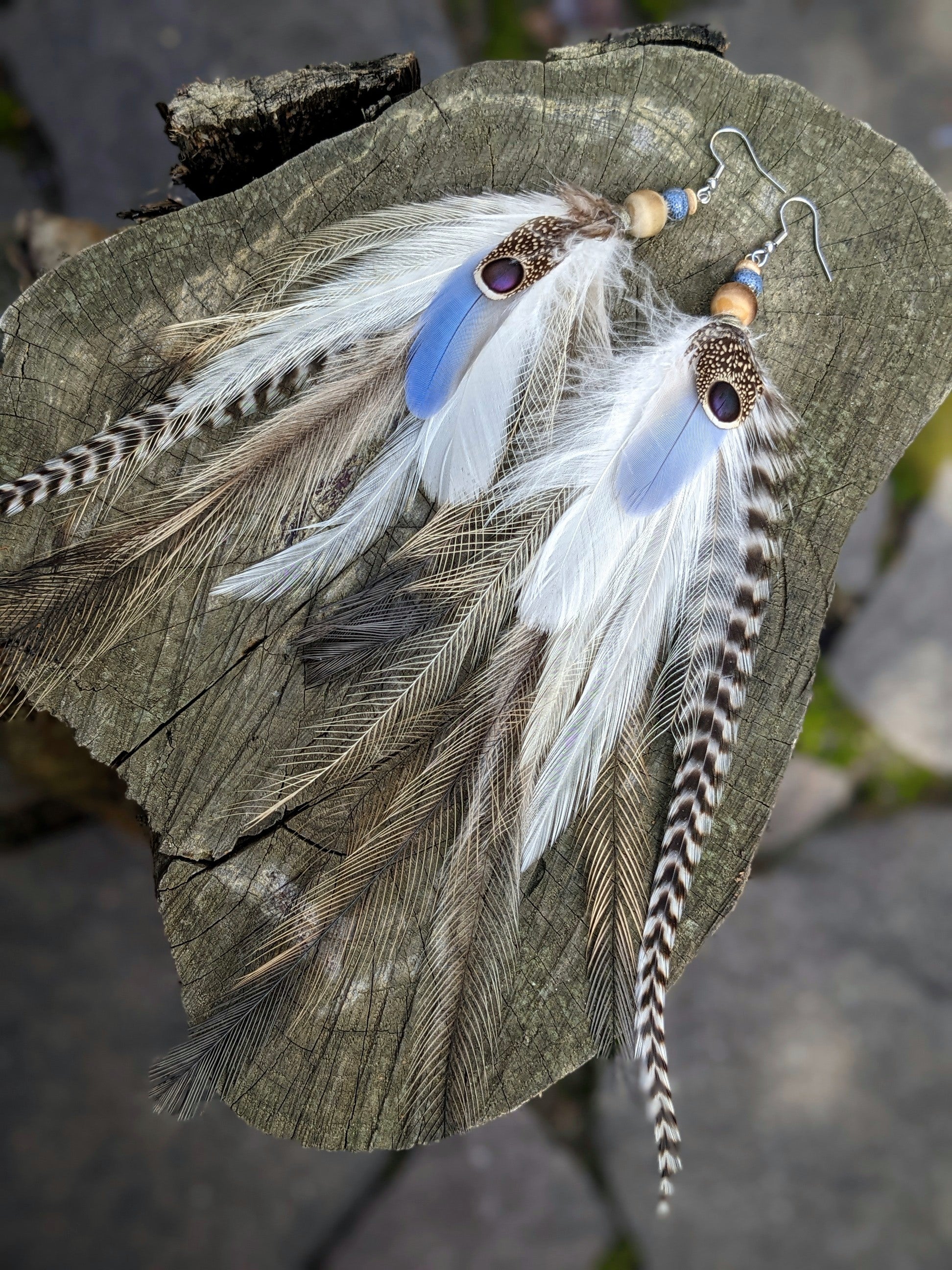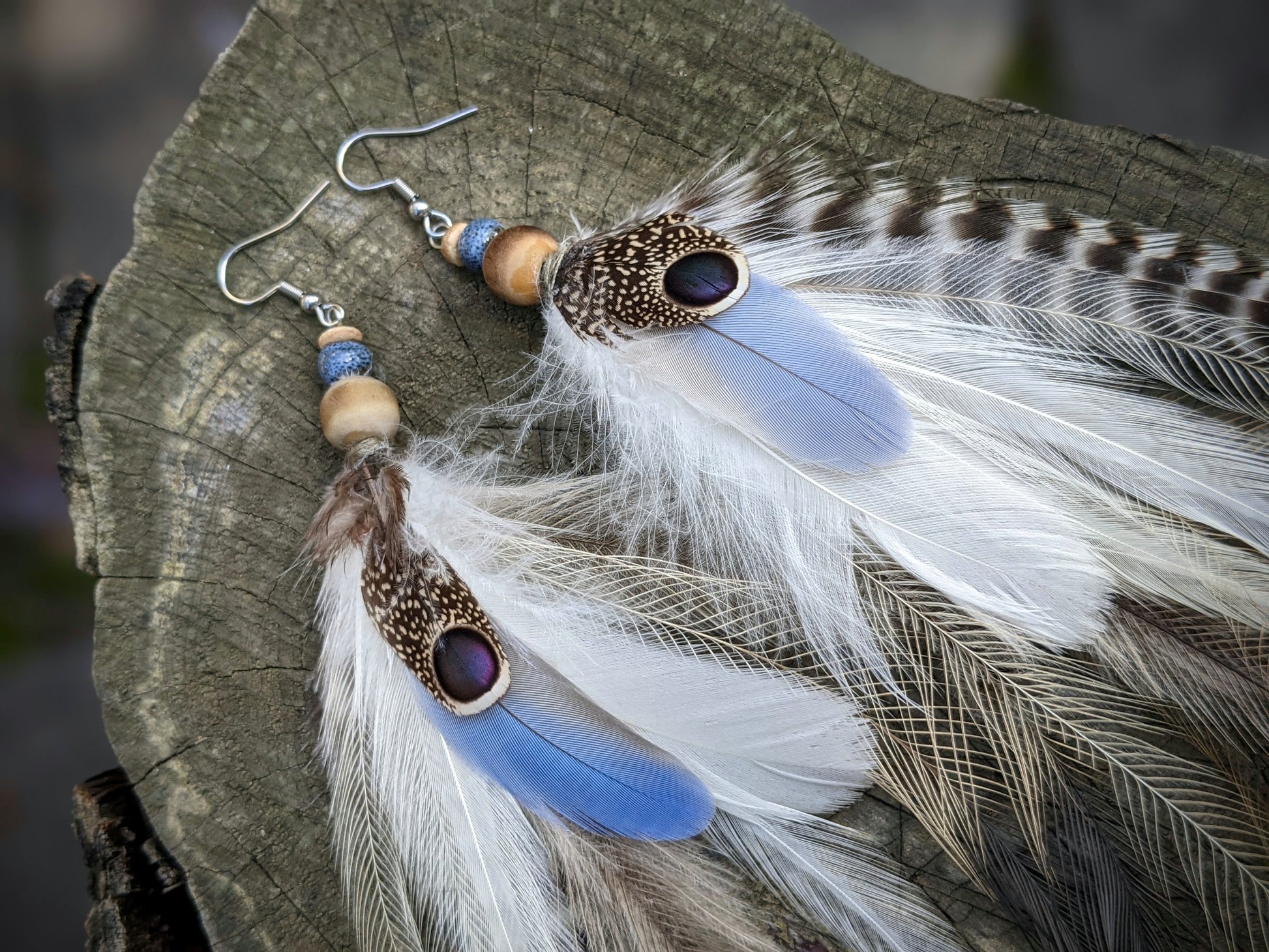 Distinctive long feather earrings (emu, peacock pheasant, parrot, rooster...) complemented by wooden and ceramic beads. Hooks are made of surgical steel, supplied with silicone stoppers. The length of the decorative part of the earrings is approximately 20 cm.