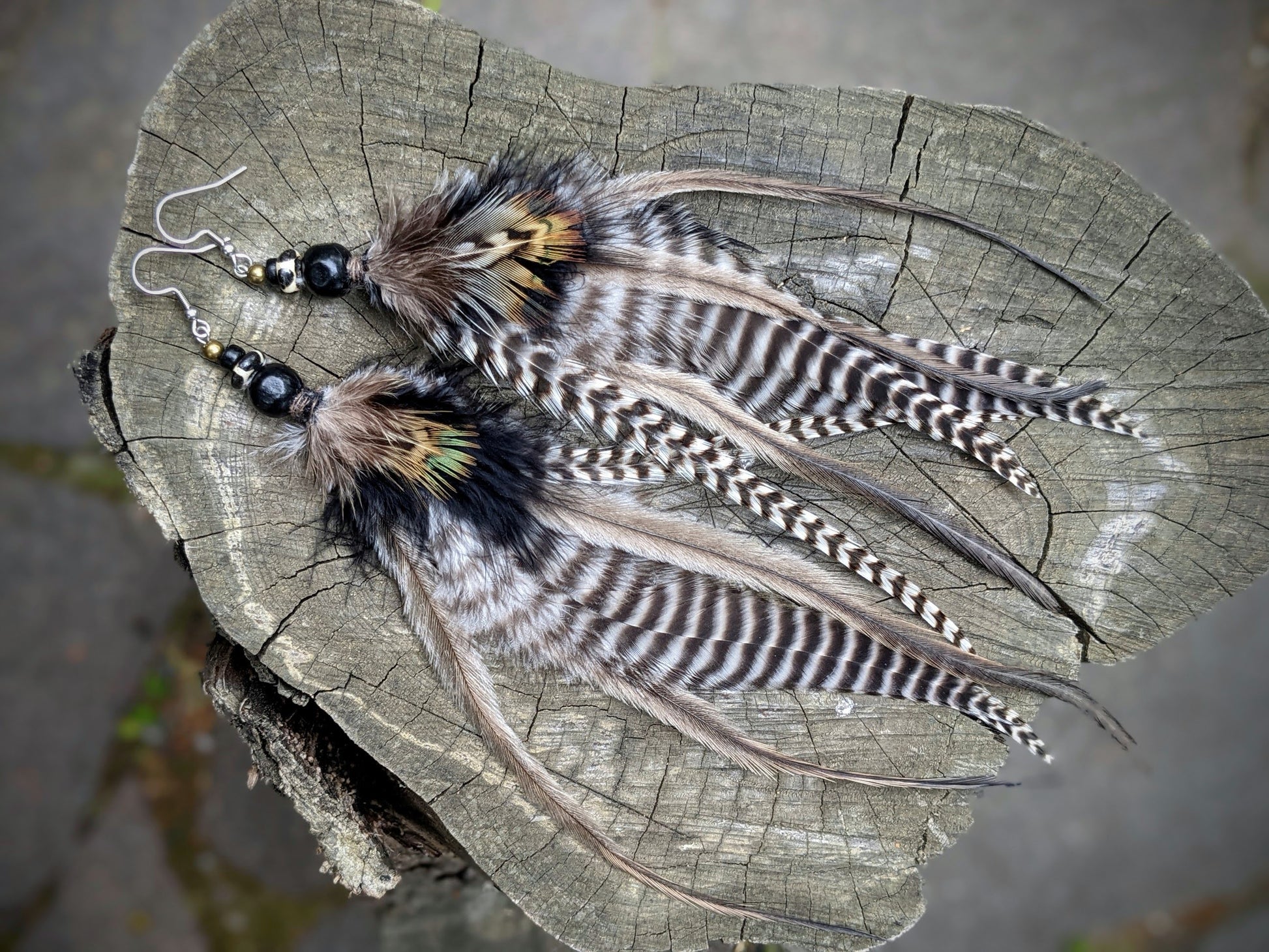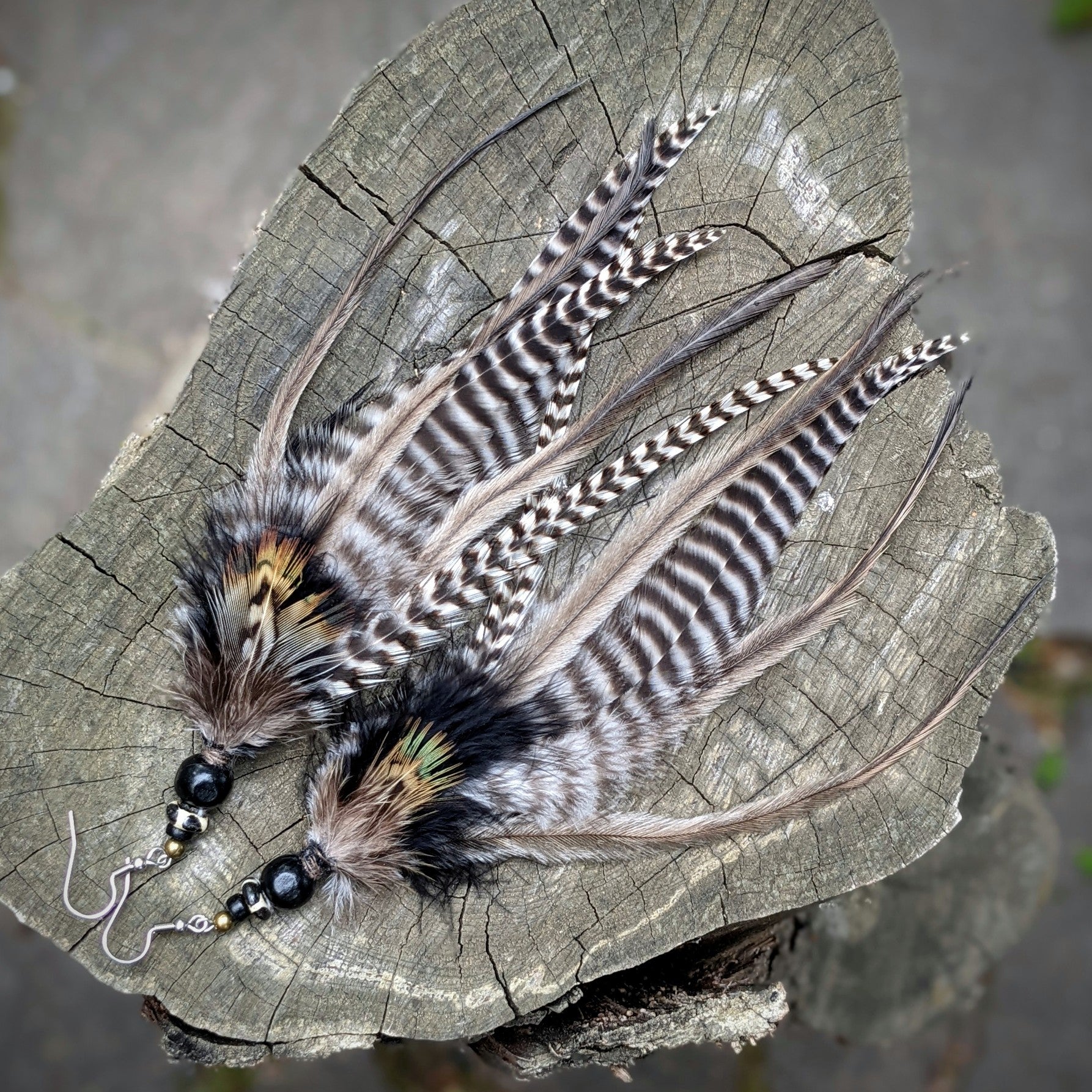 Distinctive feather earrings (pheasant, emu, rooster...) complemented by bone and wooden beads. Hooks are made of surgical steel, supplied with silicone stoppers. The length of the decorative part of the earrings is up to 20 cm.