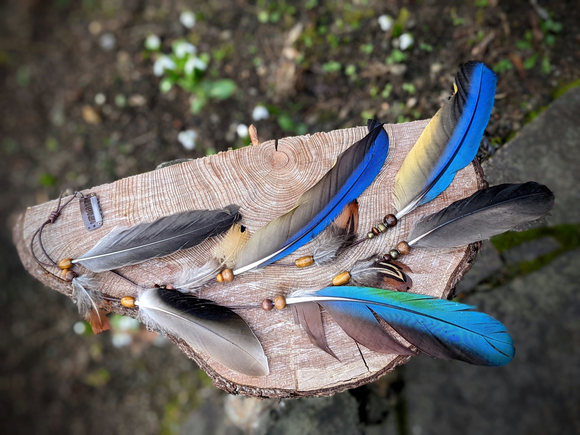 Feather boho decoration for clip in hair clip or dreads, on which you will find feathers of our wild birds and macaw parrots. The clip will look great both for thematic photo shoots and for everyday wear. It is decorated with wooden and metal beads. The decoration can be easily attached to the hairstyle with a clip, or the clip can be removed from the strand and then attached directly to the dread using the tightening eye.