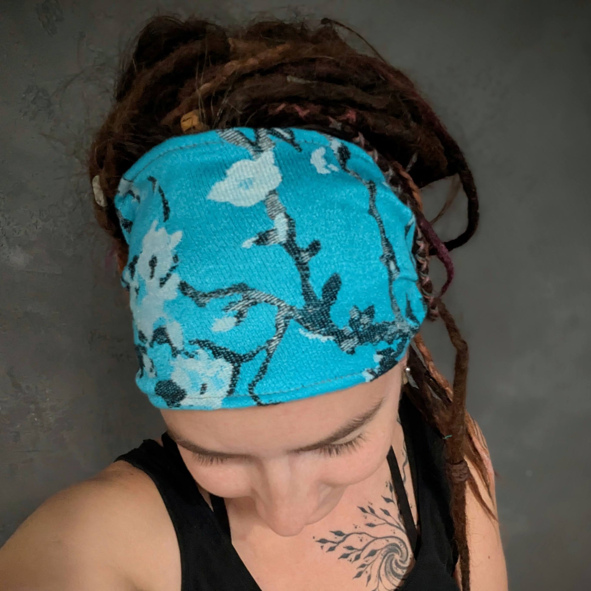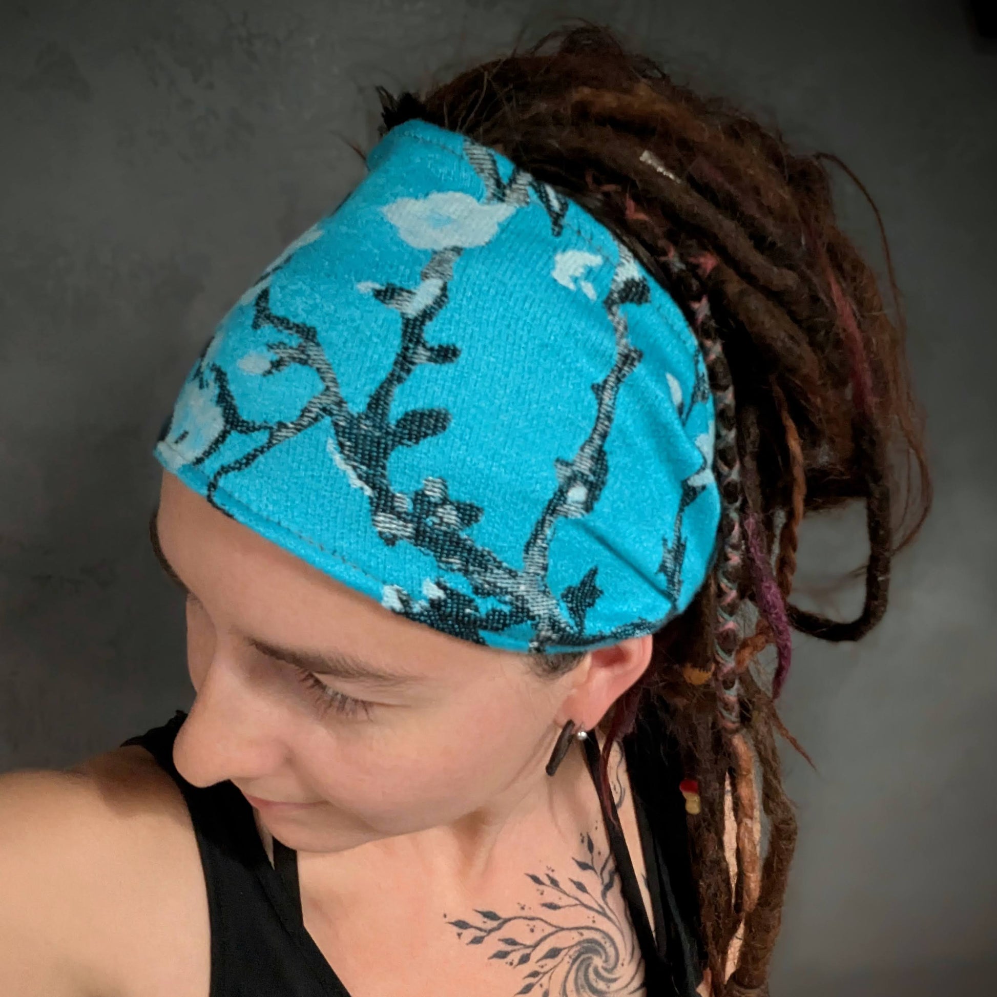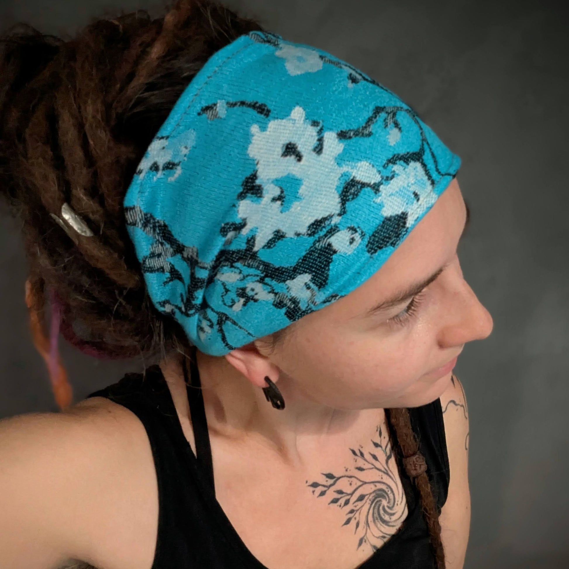 Practical scarf headband sewn from a babywearing scarf cutout (Natibaby brand).