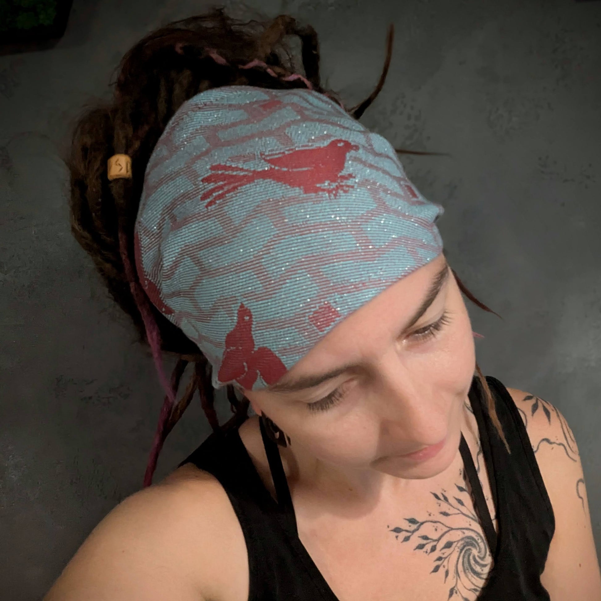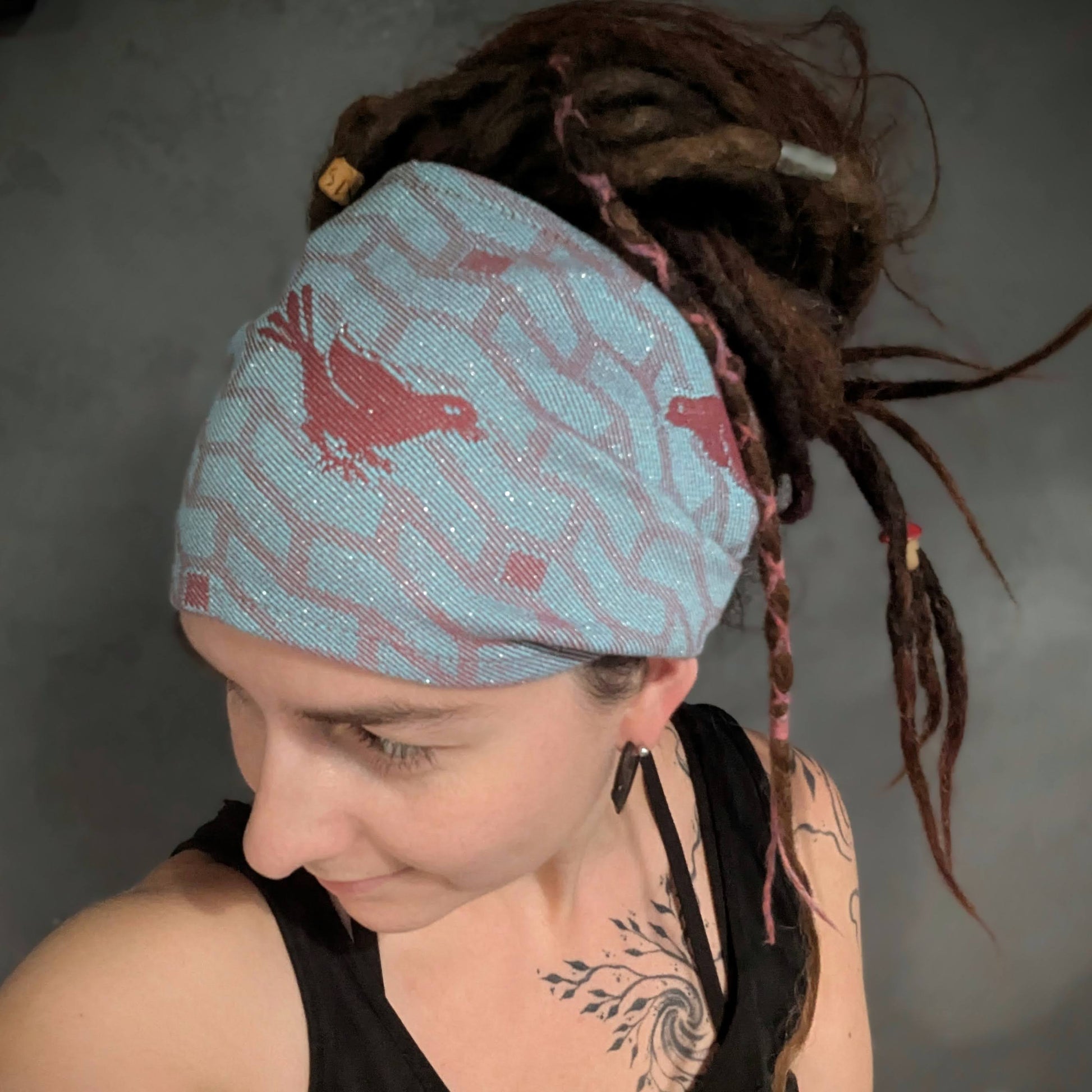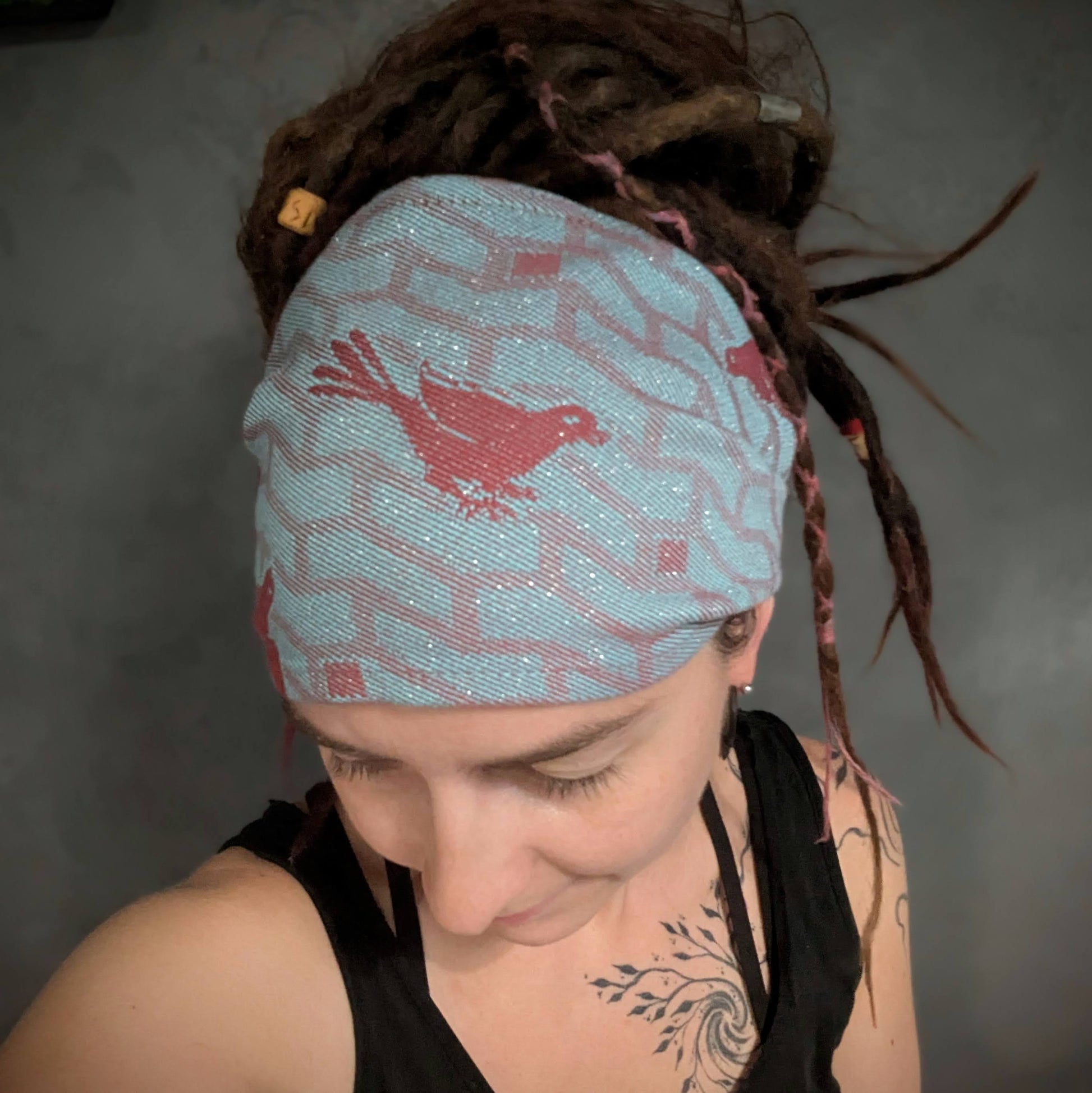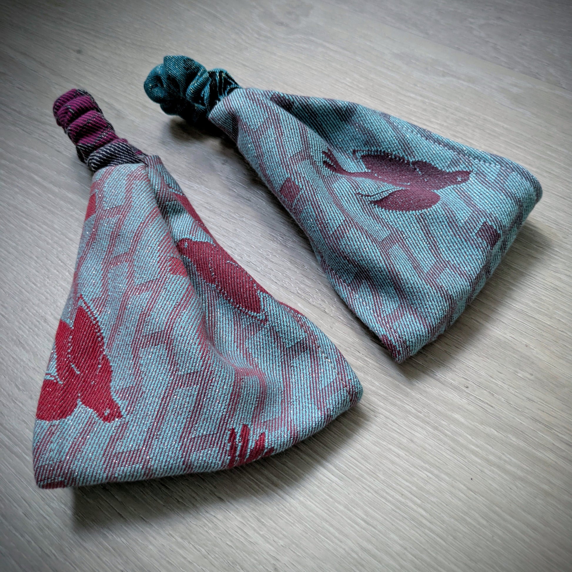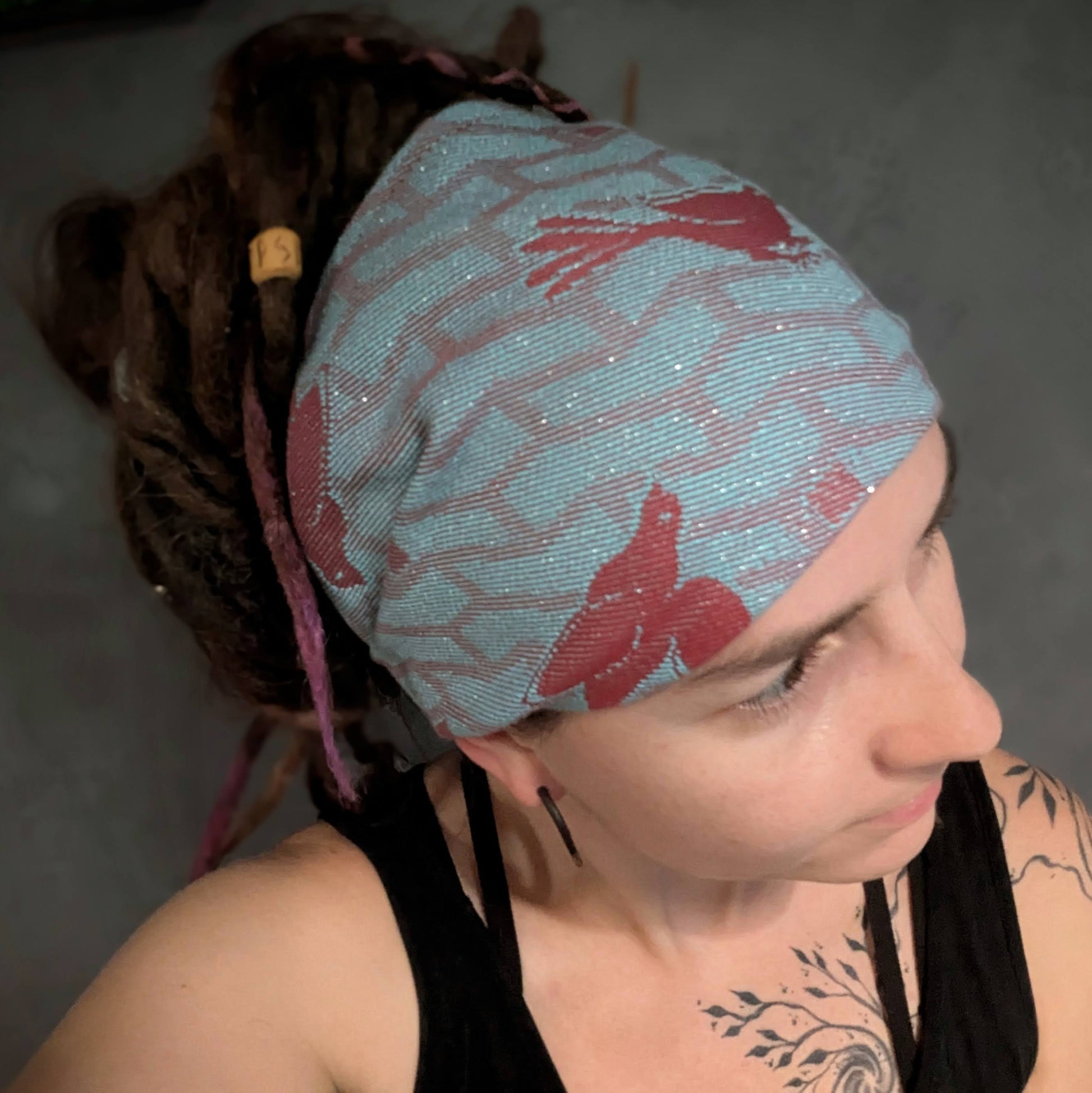 Practical scarf headband sewn from a babywearing scarf cutout (Yaro brand).