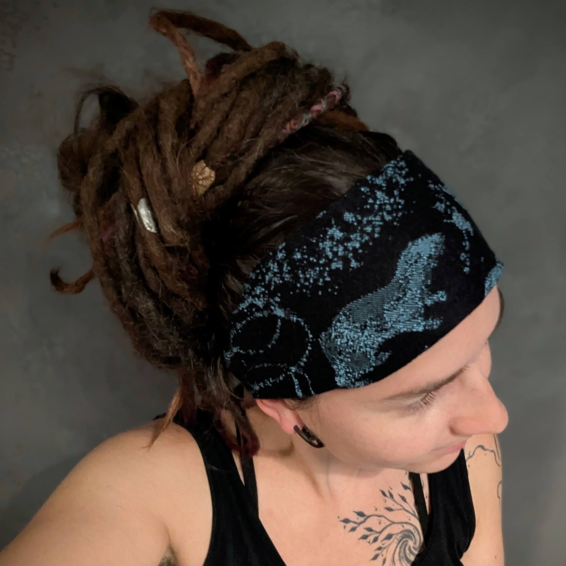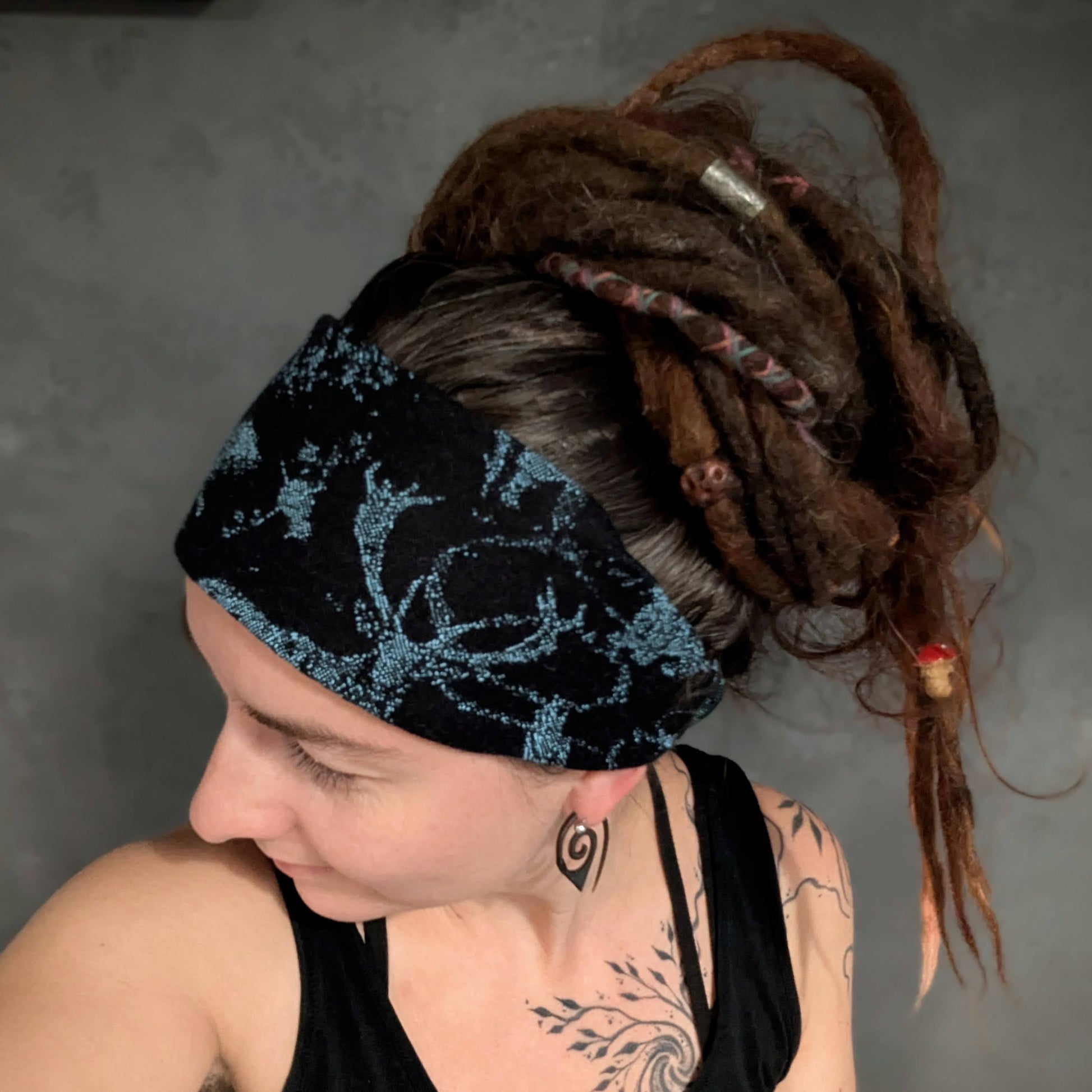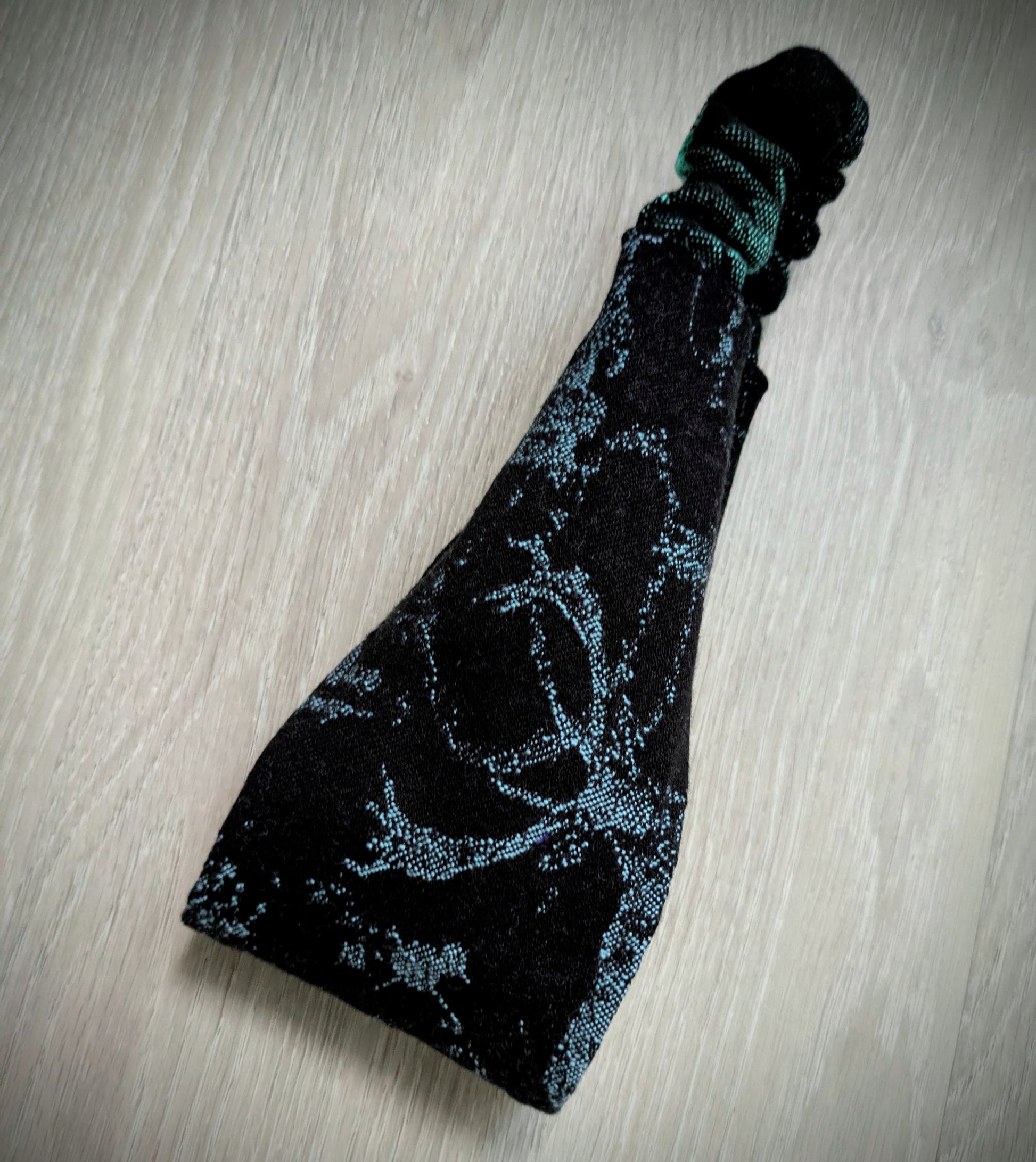 Practical scarf headband sewn from a babywearing scarf cutout (Luluna brand).