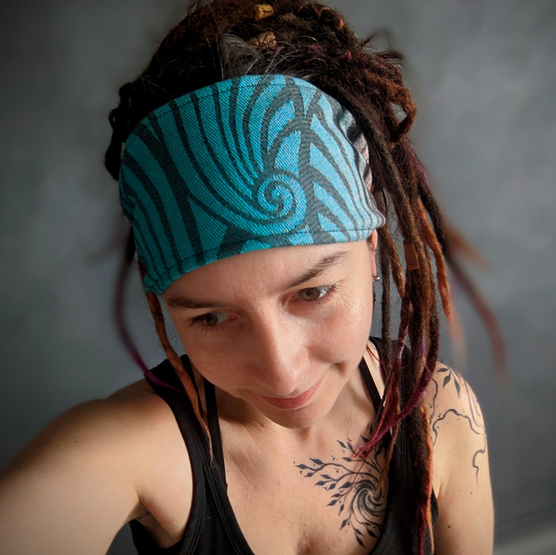 Practical scarf headband sewn from a babywearing scarf cutout.