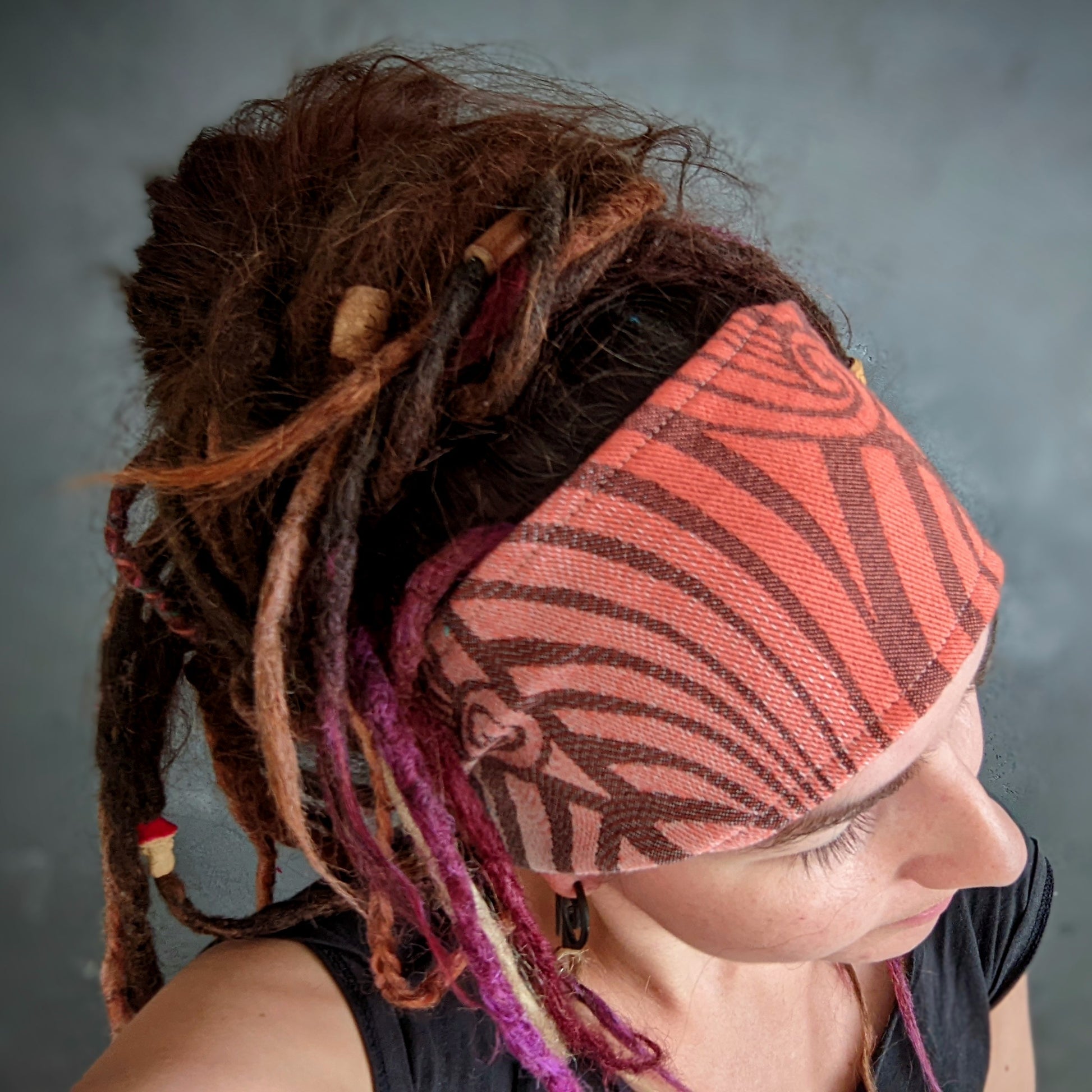 Practical scarf headband sewn from a babywearing scarf cutout.