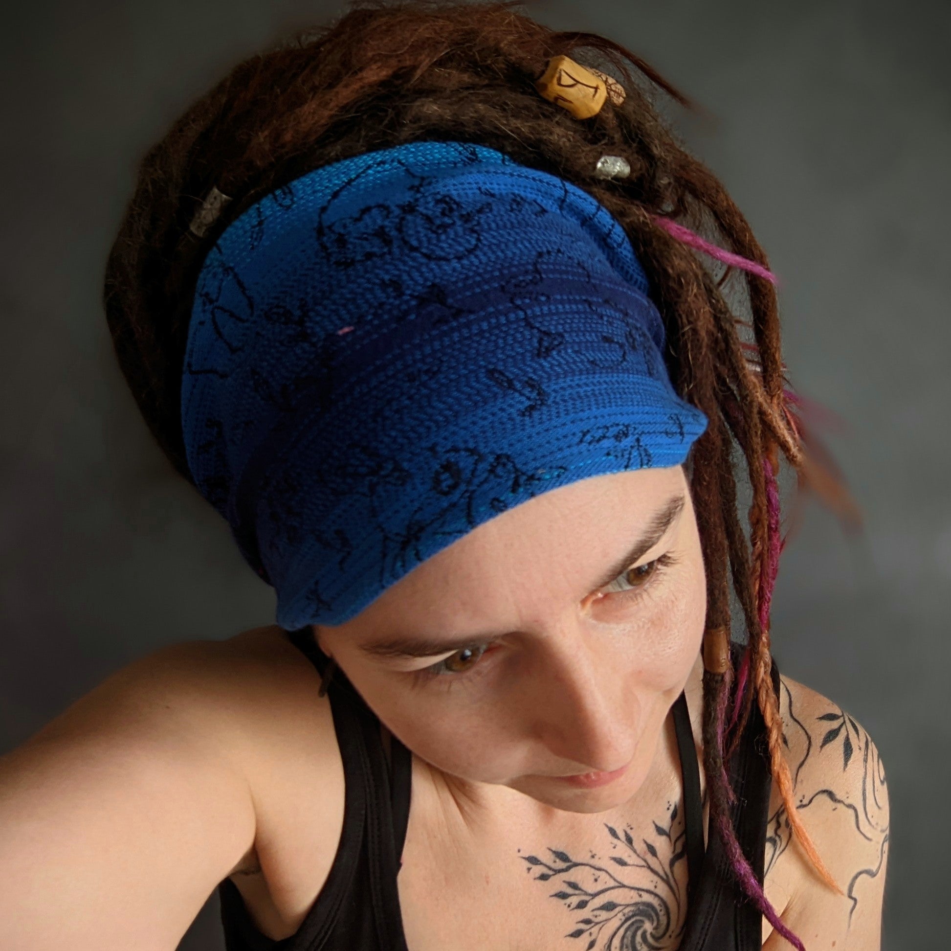 Practical scarf headband sewn from a babywearing scarf cutout.