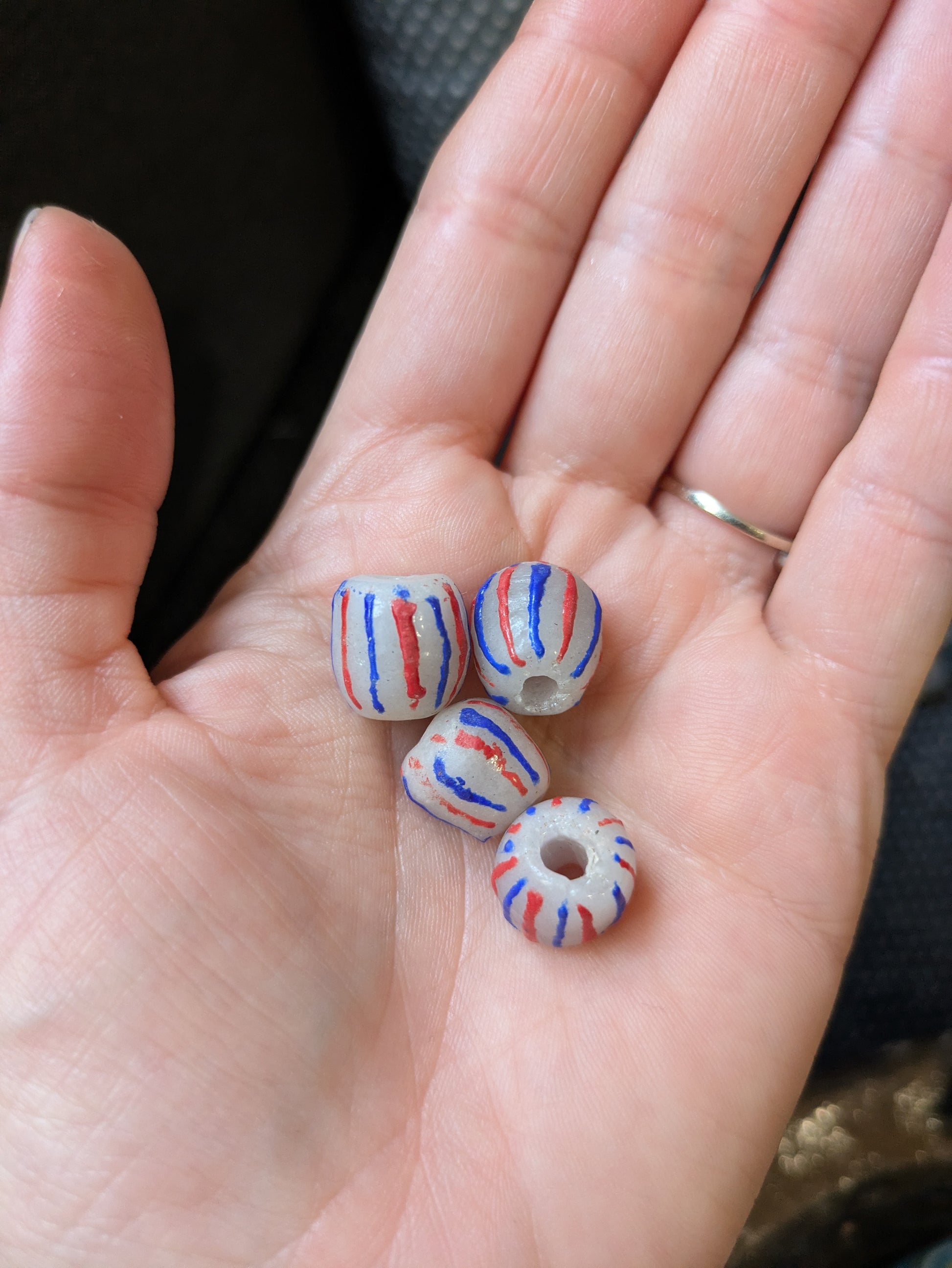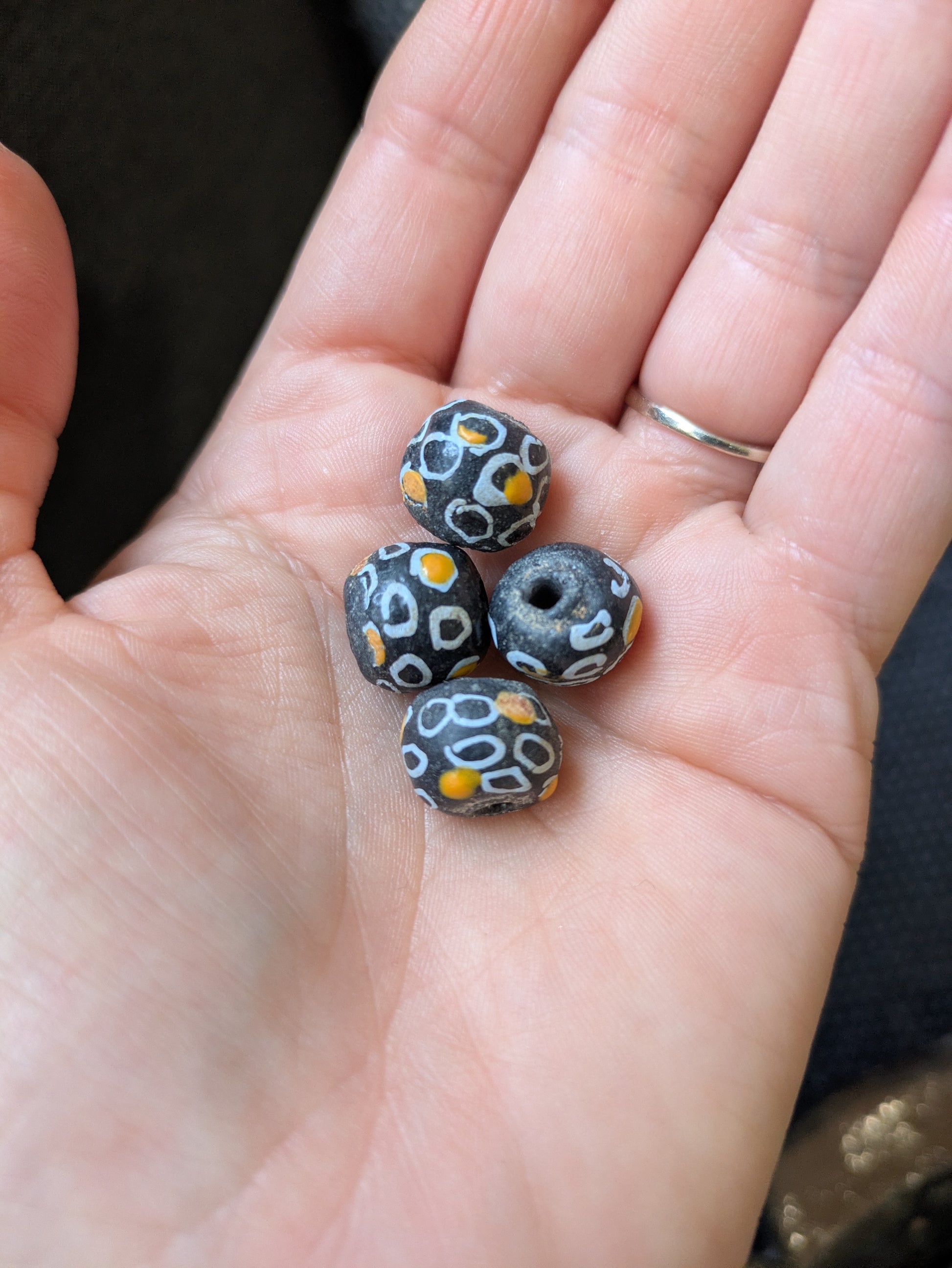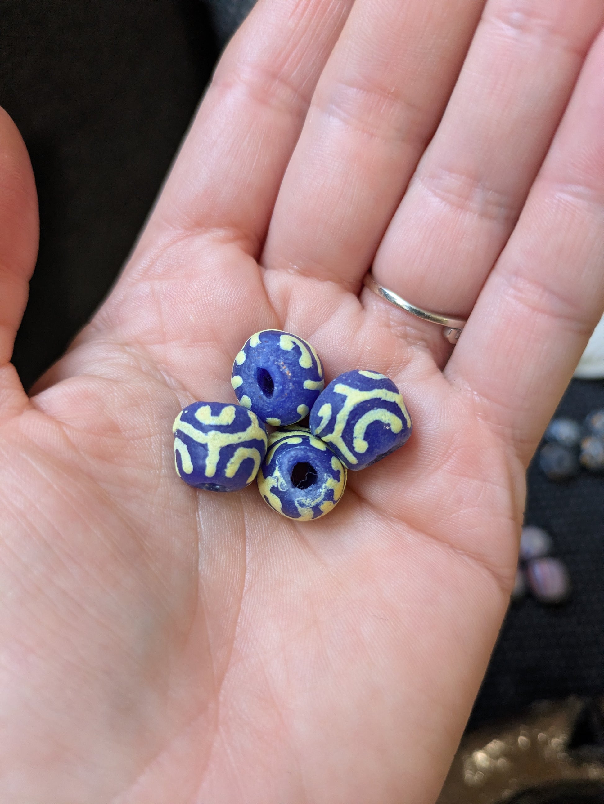 "Krobo" korálky jsou tradičně vyráběné v Ghaně z recyklovaného skla a ručně malované. Tvar korálek je nepravidelný a žádné dvě nejsou úplně stejné.