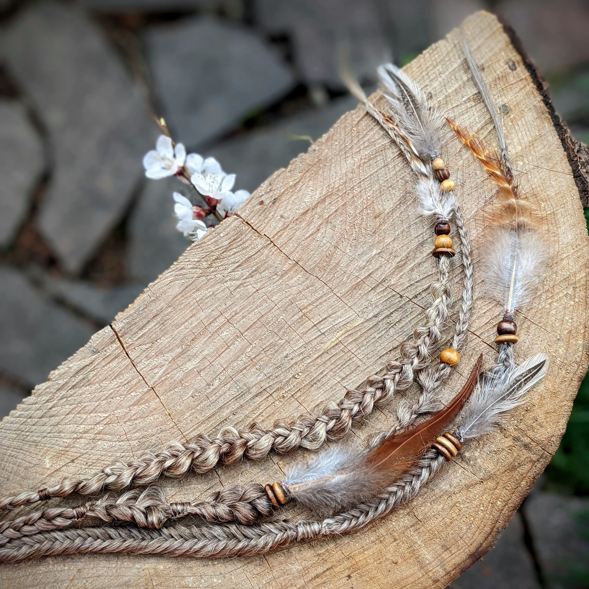 Clip in sponka se 3 strukturovanými copánky v odstínu tmavé blond. Zdobeno dřevěnými korálky a pírky.