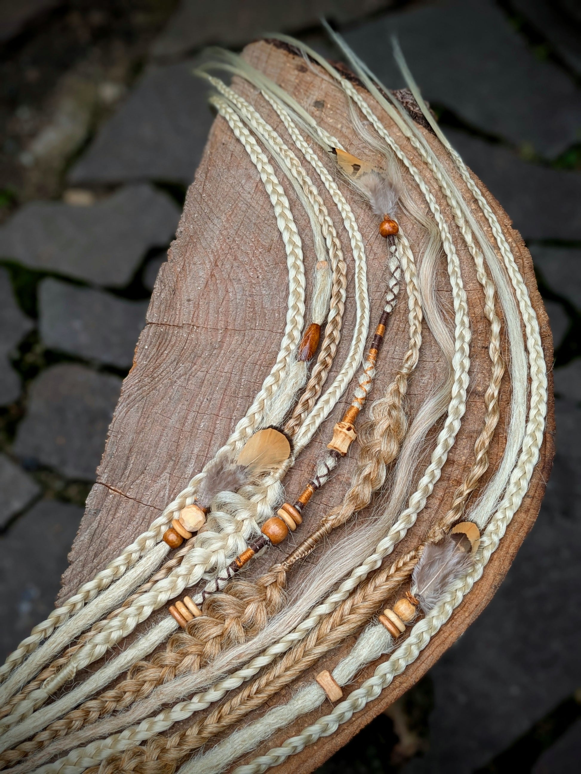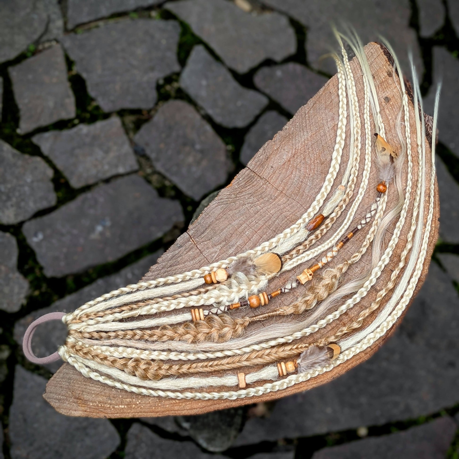 Béžová gumička s dohromady 7 copánky různých struktur a 3 dready a 1 dreadovlnkou v kombinaci plavé a medové blond. Zdobeno dřevěnými korálky, bavlnkou a pírky. délka 60 cm