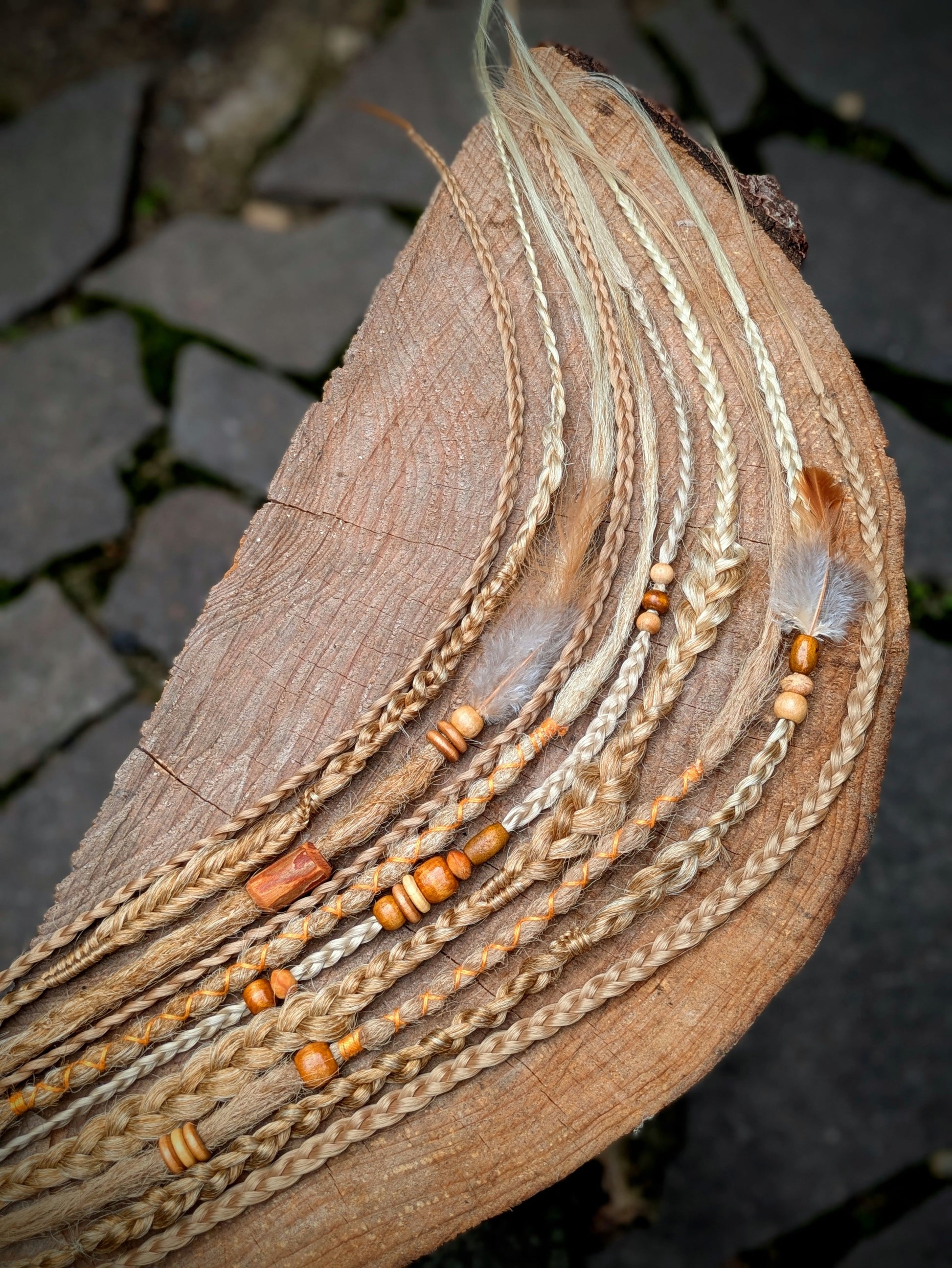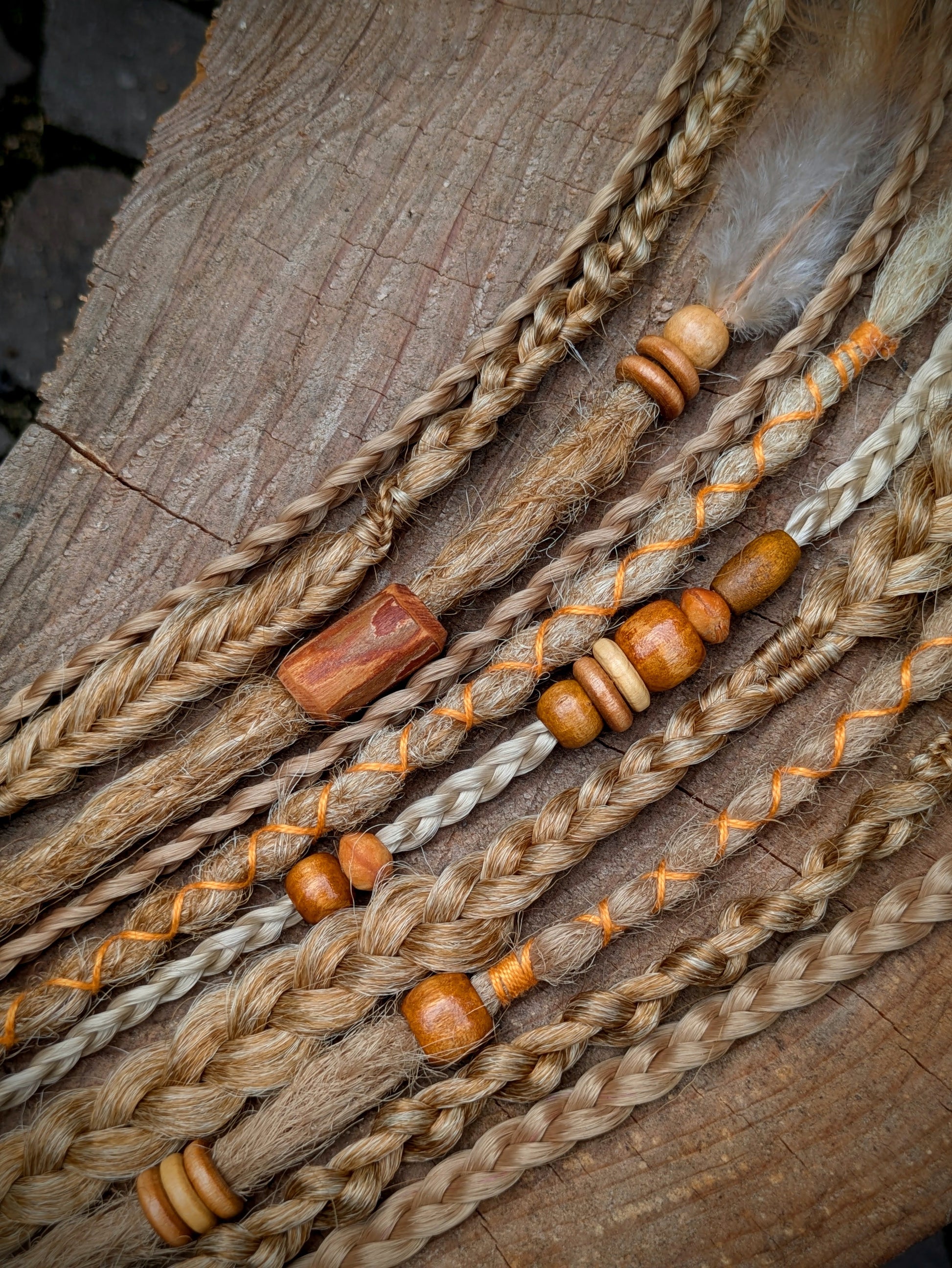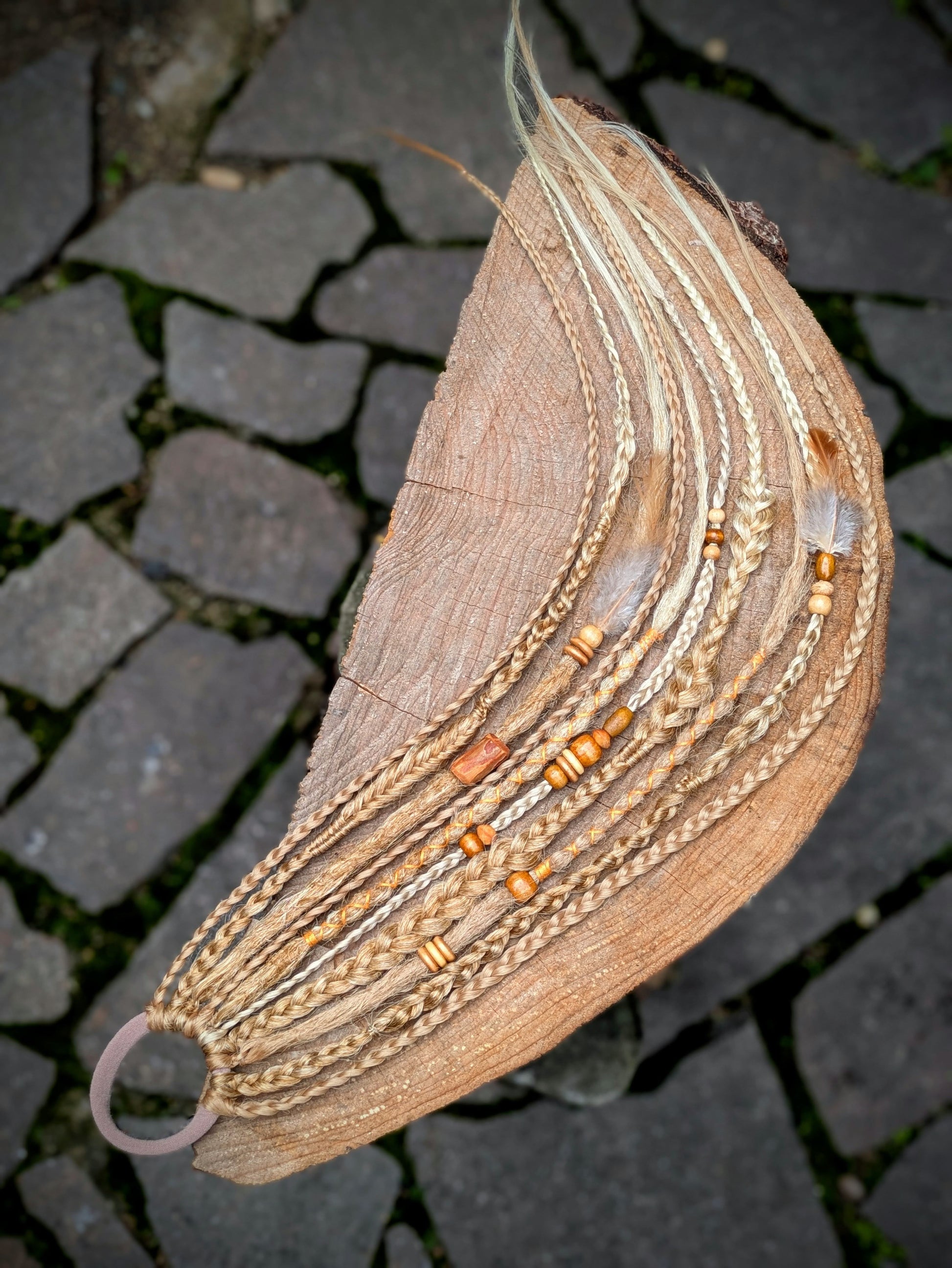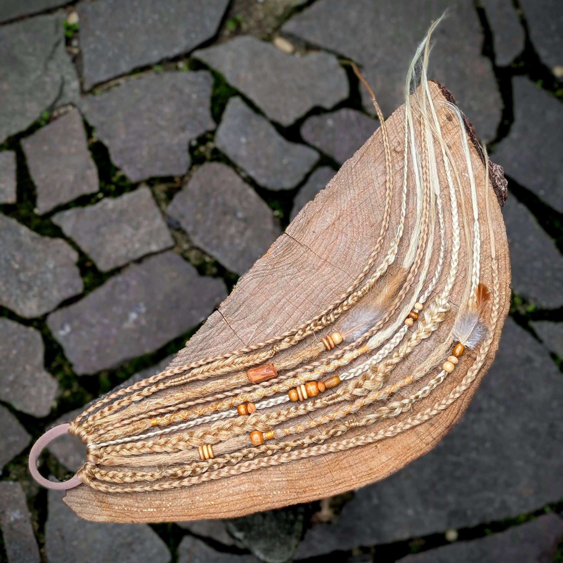 Béžová gumička s dohromady 7 copánky různých struktur a 3 dready v barvě medové blond. Zdobeno dřevěnými korálky, bavlnkou a pírky.