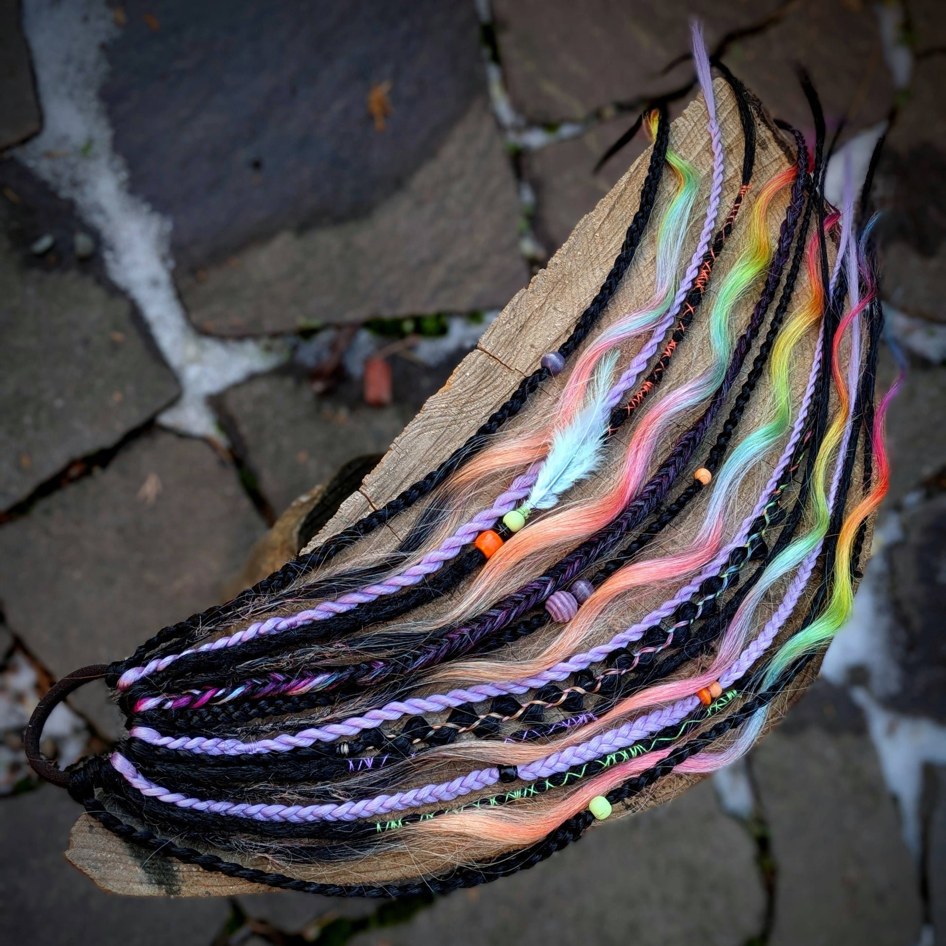 Černá gumička s dohromady 8 copánky různých struktur, 5 dreadovlnkamí a 3 dready v kombinaci černé, lila a duhové. Zdobeno dřevěnými korálky, bavlnkou a pírky. délka 60 cm