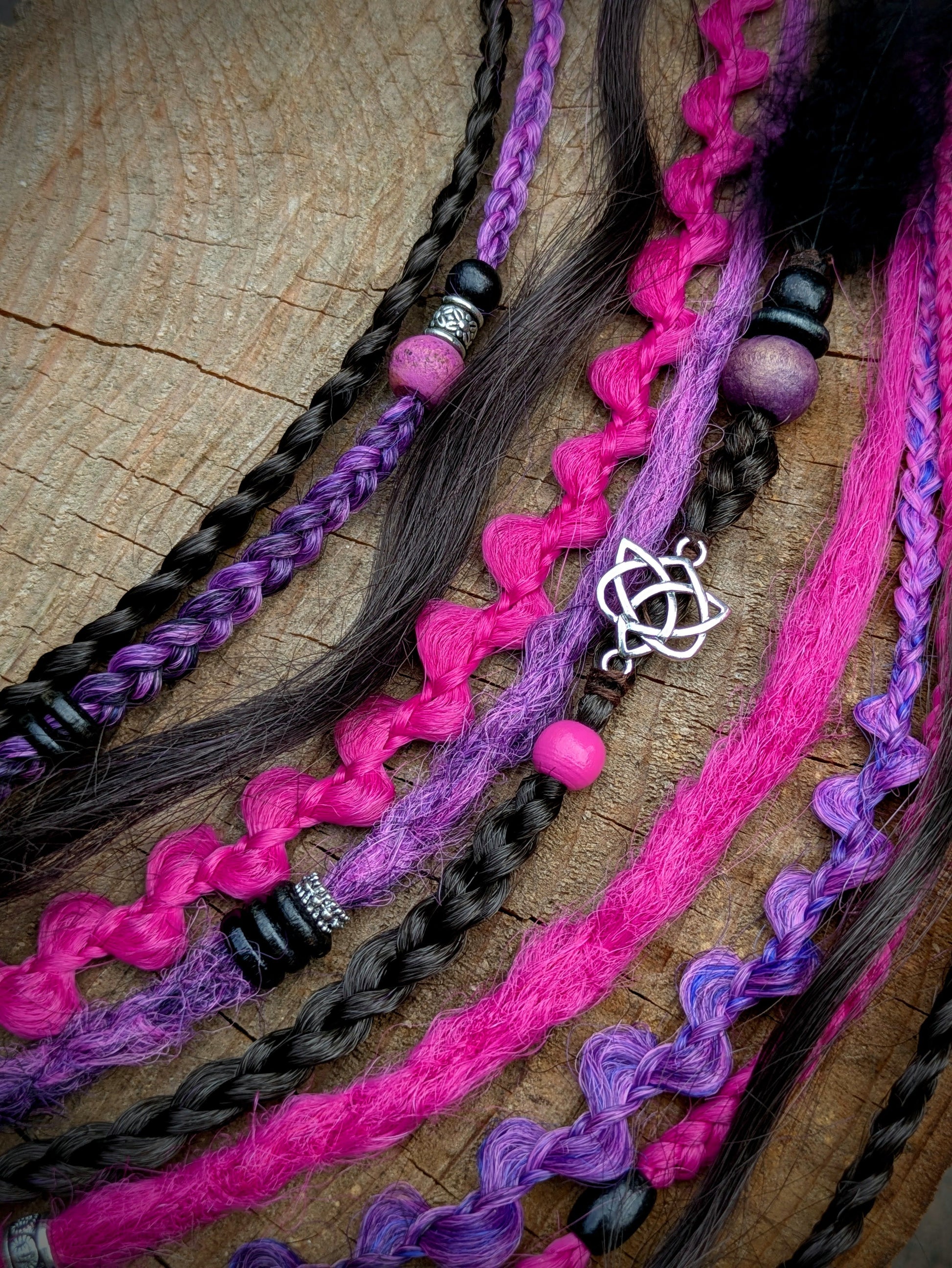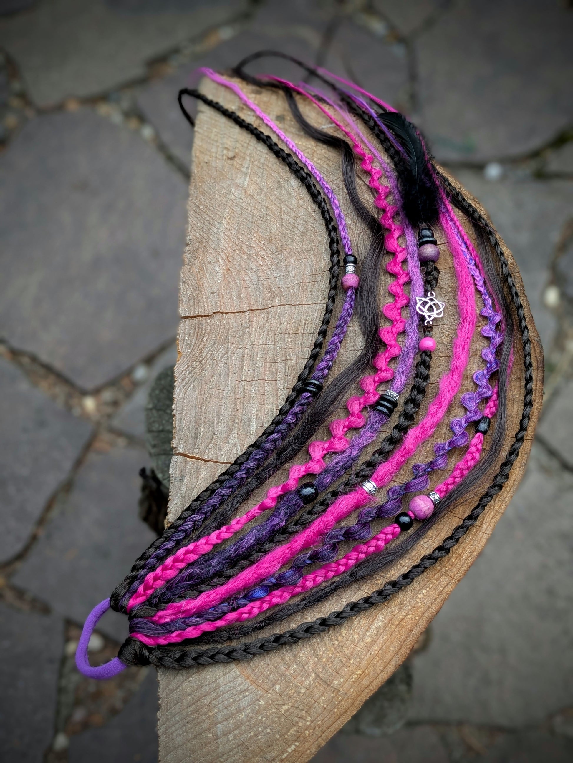 Fialová gumička s dohromady 7 copánky různých struktur a 4 dready v kombinaci černohnědé, magenty a fialové. Zdobeno dřevěnými a kovovými korálky a pírky.