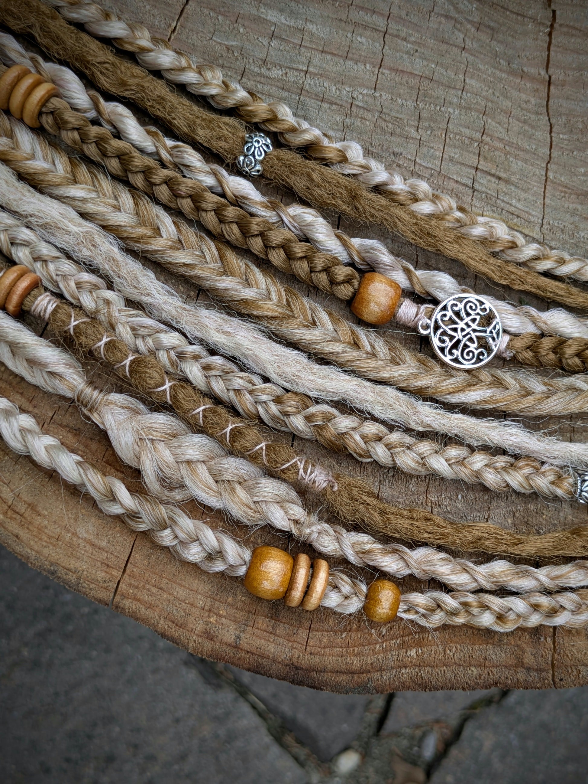Hnědá gumička s dohromady 7 copánky různých struktur a 3 dready v kombinaci medové a blond. Zdobeno dřevěnými a kovovými korálky, bavlnkou a pírky.délka 65 cm