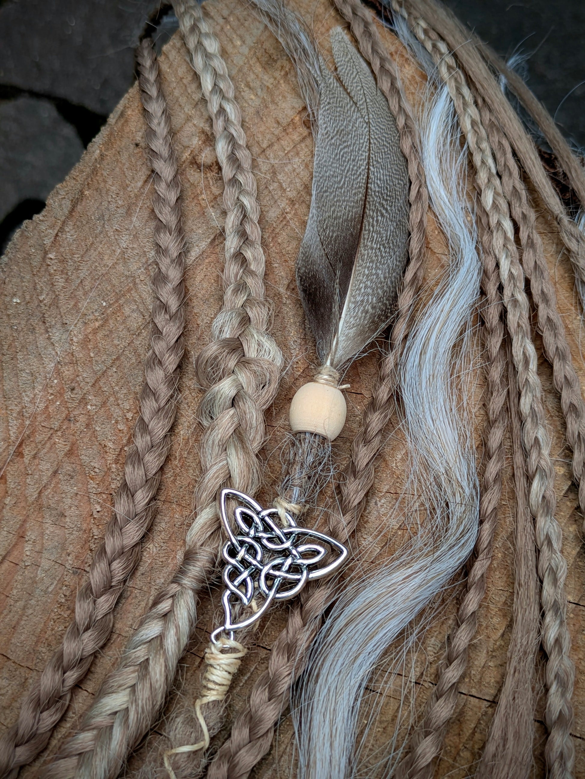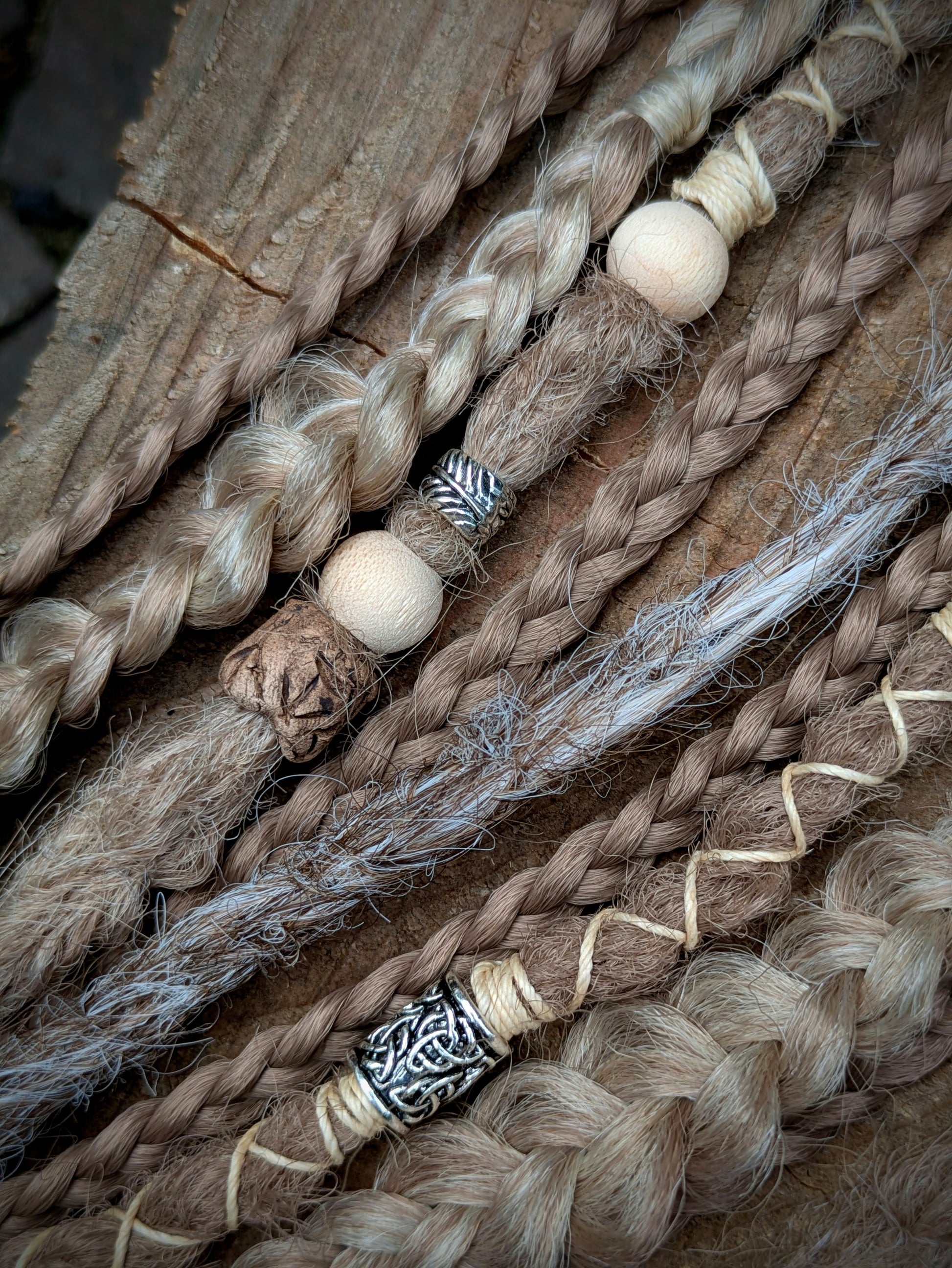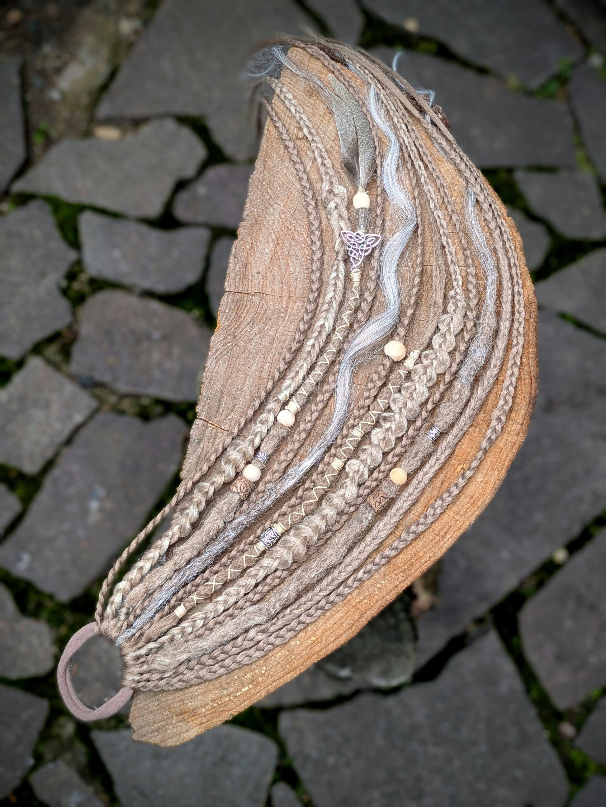 Béžová gumička s dohromady 8 copánky různých struktur a 3 dready a 1 dreadovlnkou v kombinaci platinové a špinavé blond. Zdobeno dřevěnými, keramickými a kovovými korálky, bavlnkou a pírky. délka 60 cm
