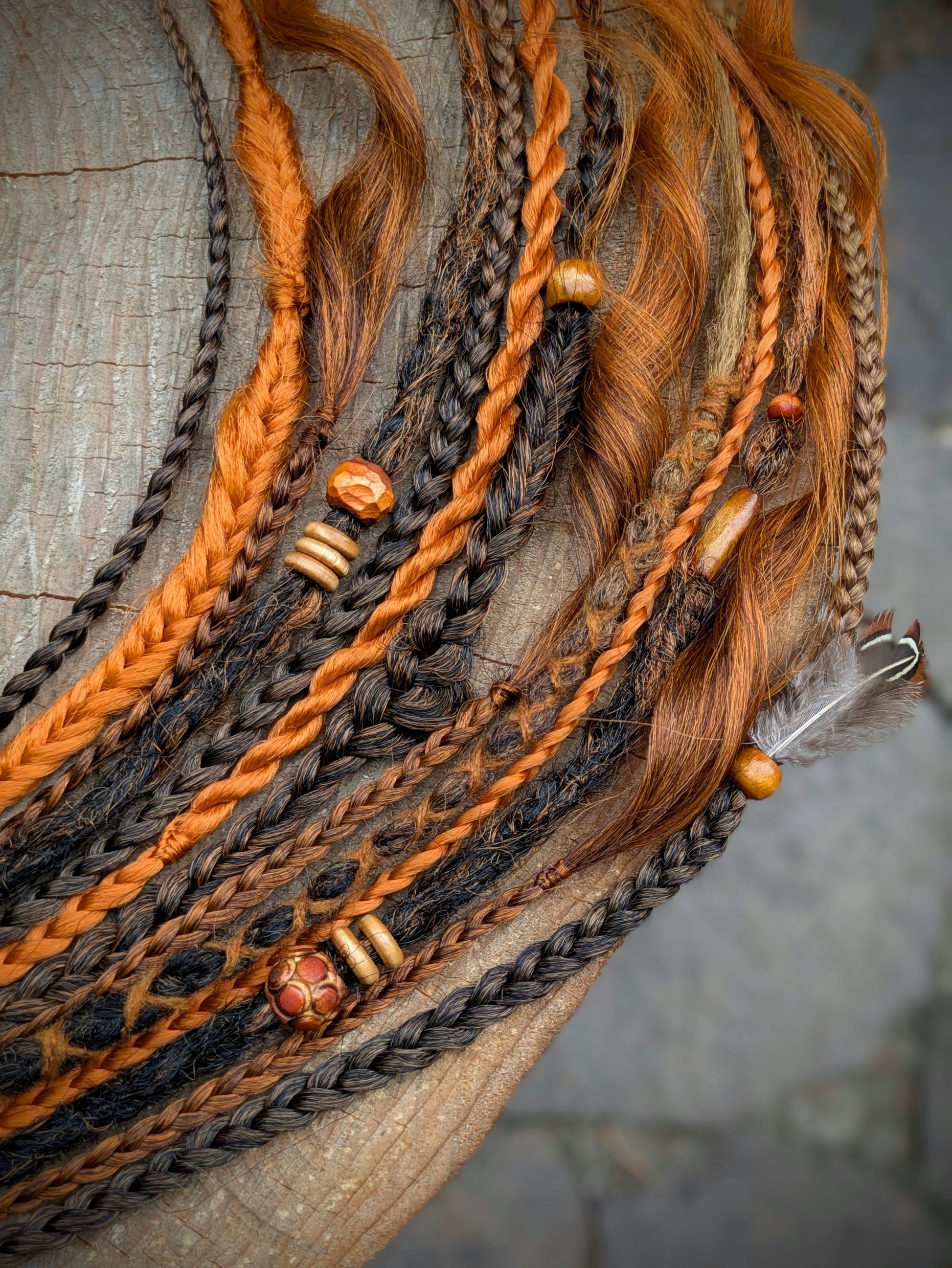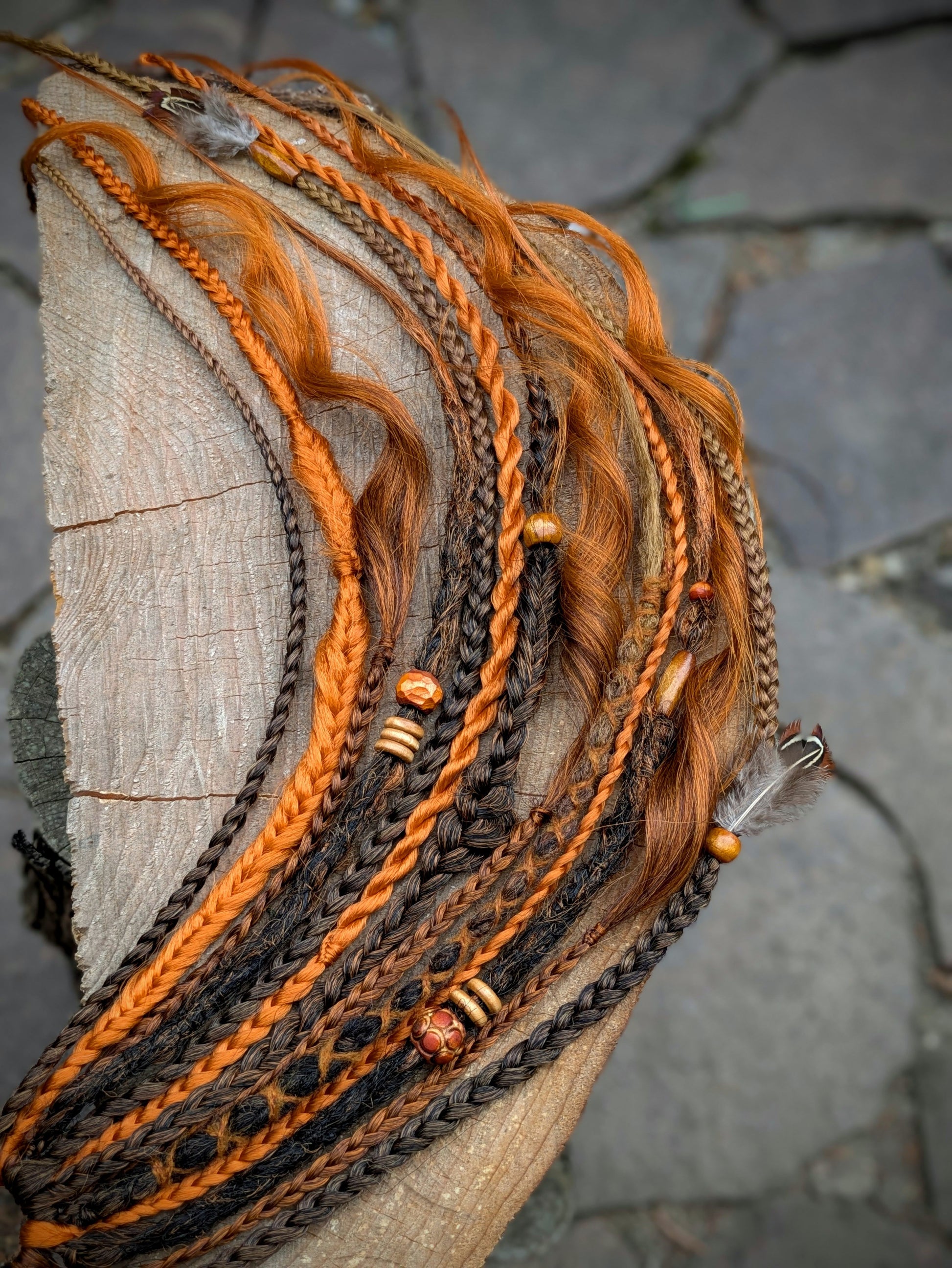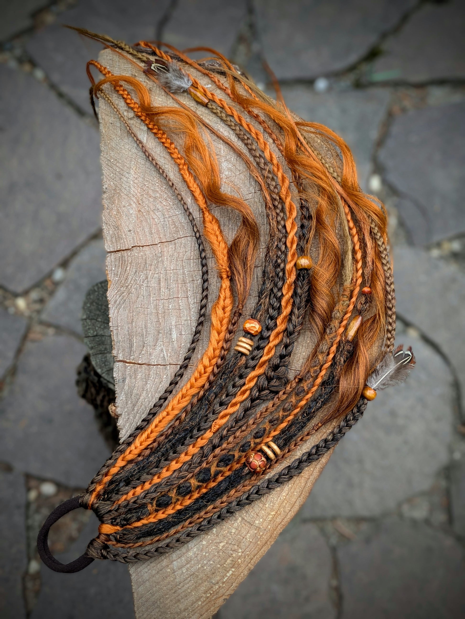 Hnědá gumička s dohromady 10 copánky různých struktur a 3 dready v kombinaci zrzavé a hnedé. Zdobeno dřevěnými korálky, bavlnkou a pírky.
