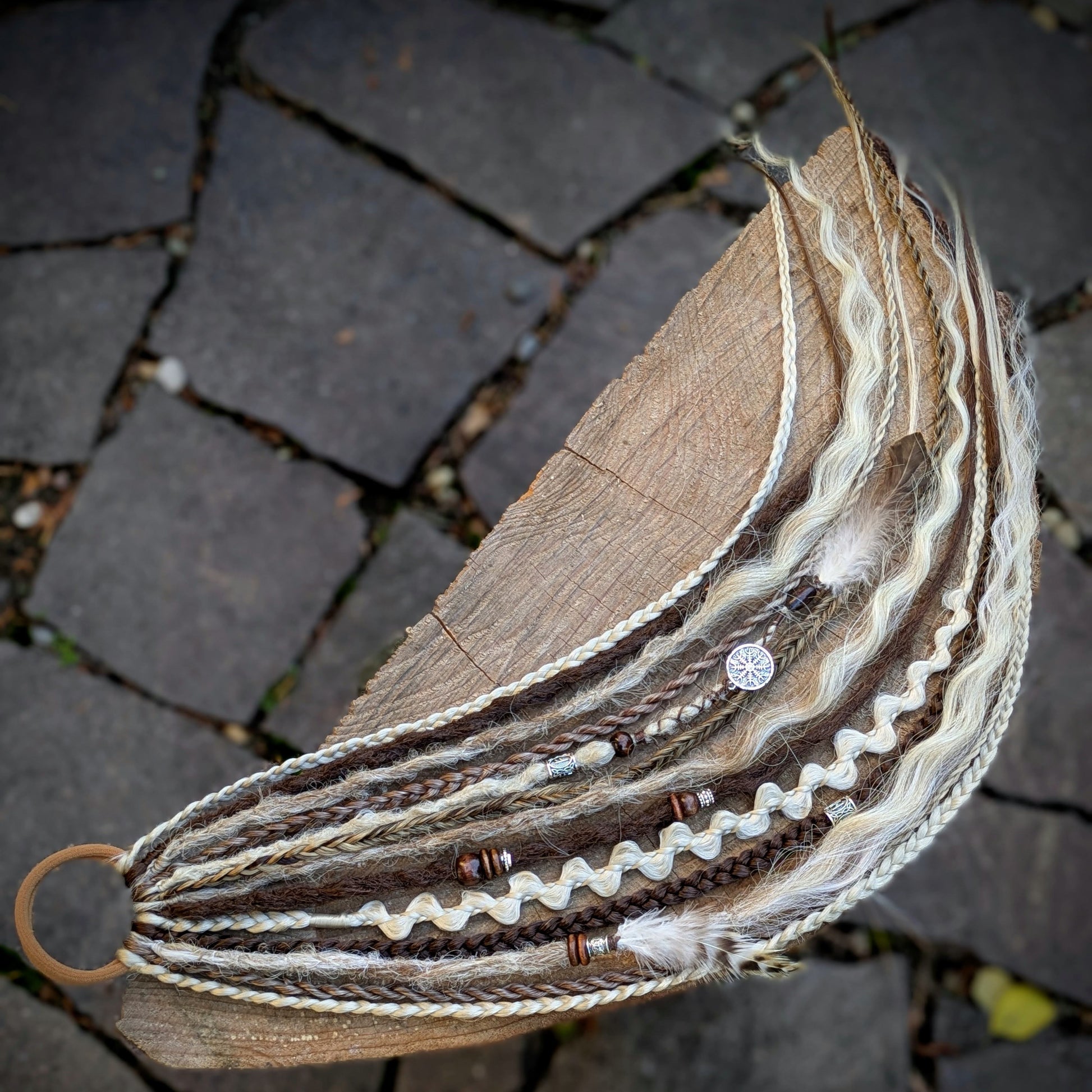 Hnědá gumička s dohromady 7 copánky různých struktur, 3 dreadovlnkamí a 3 dready v kombinaci hnědé, špinavé blond a plavé. Zdobeno dřevěnými a kovovými korálky, bavlnkou a pírky. délka 60 cm